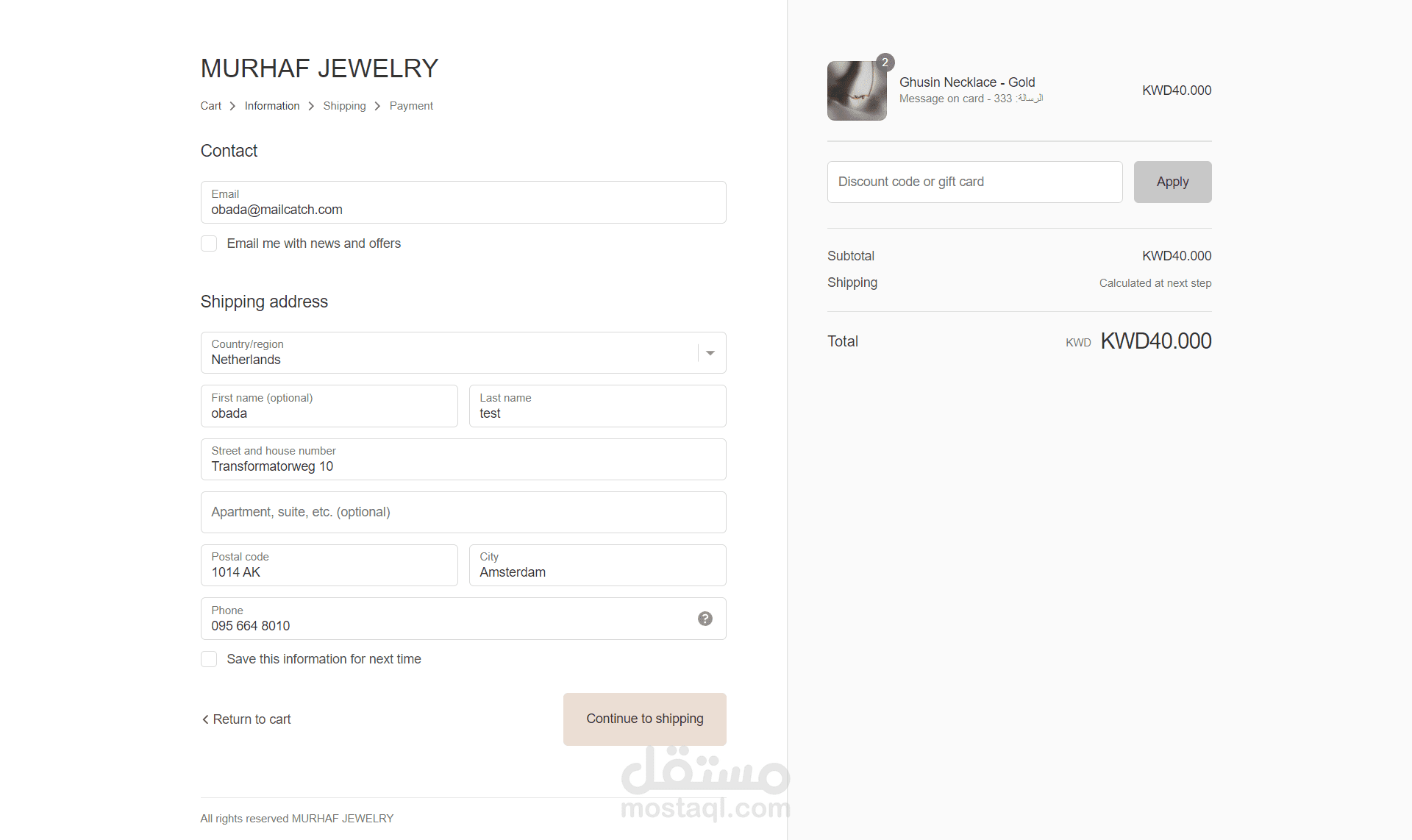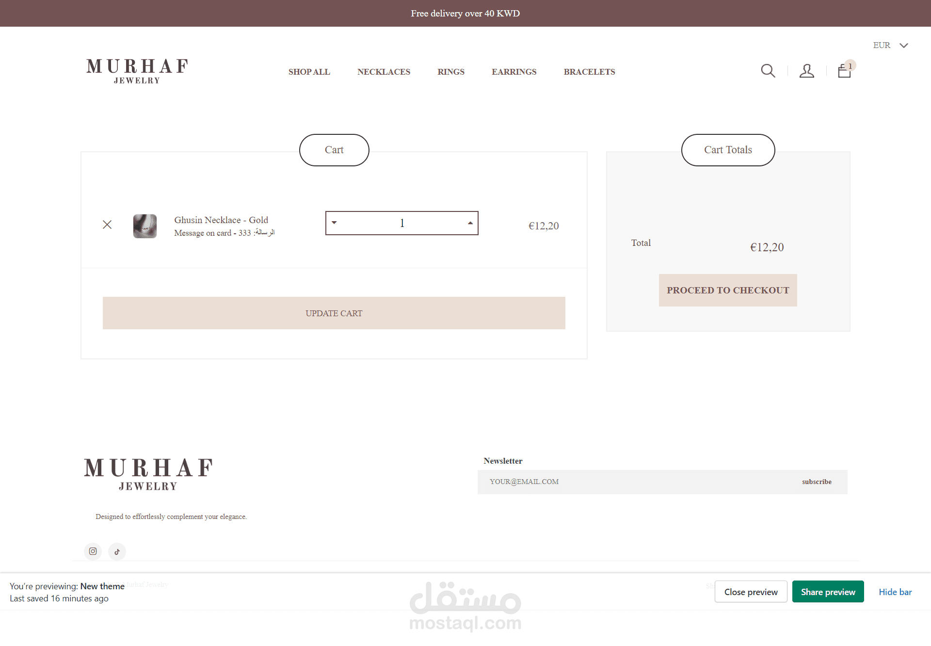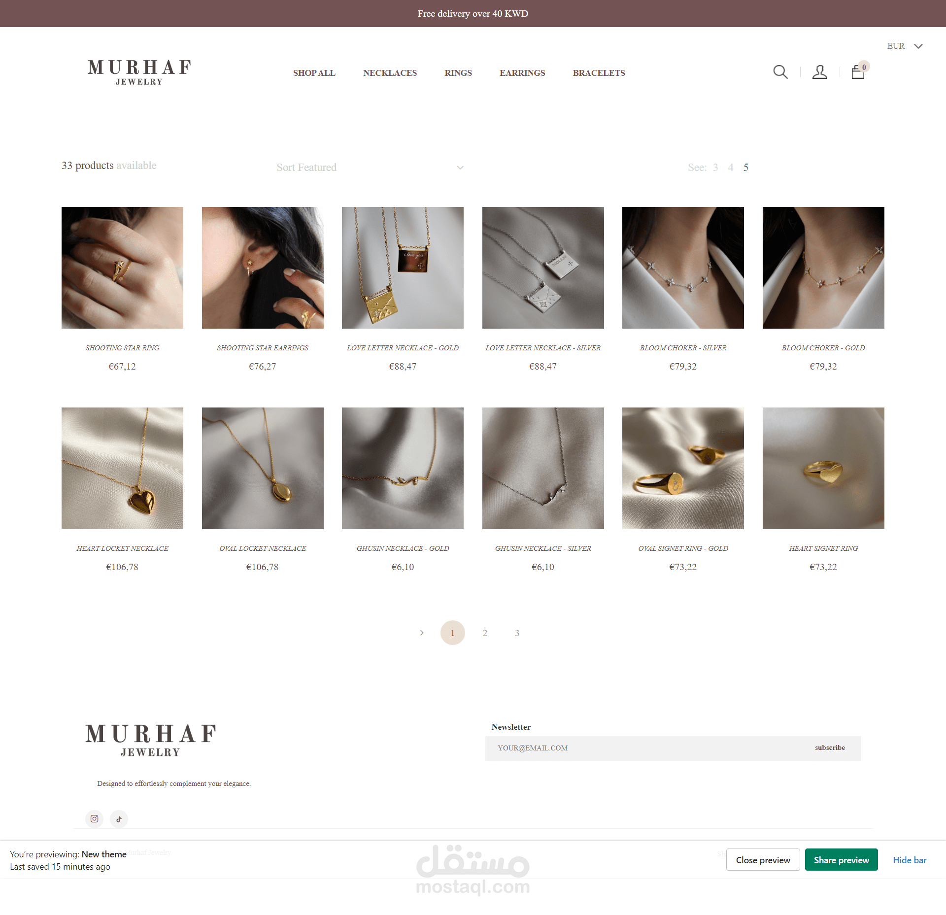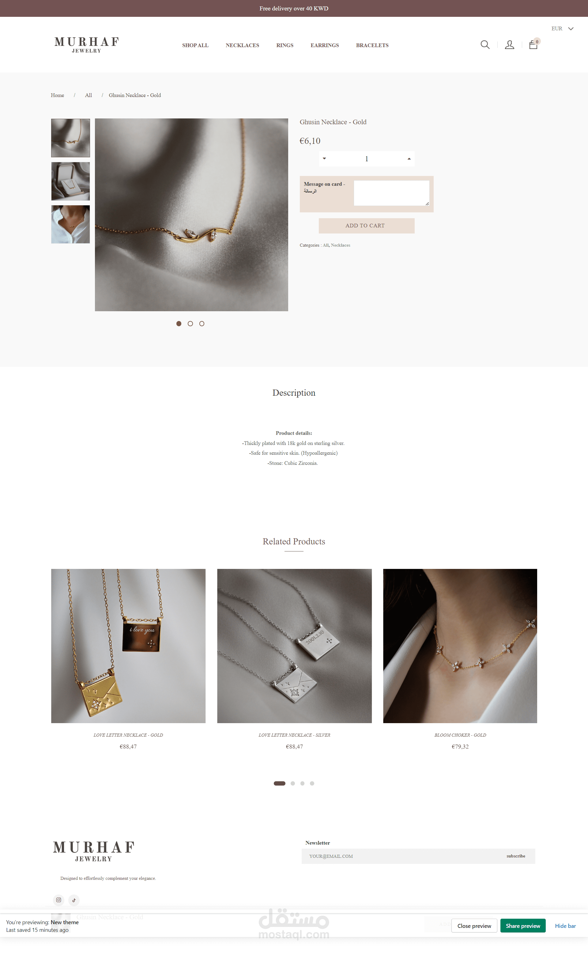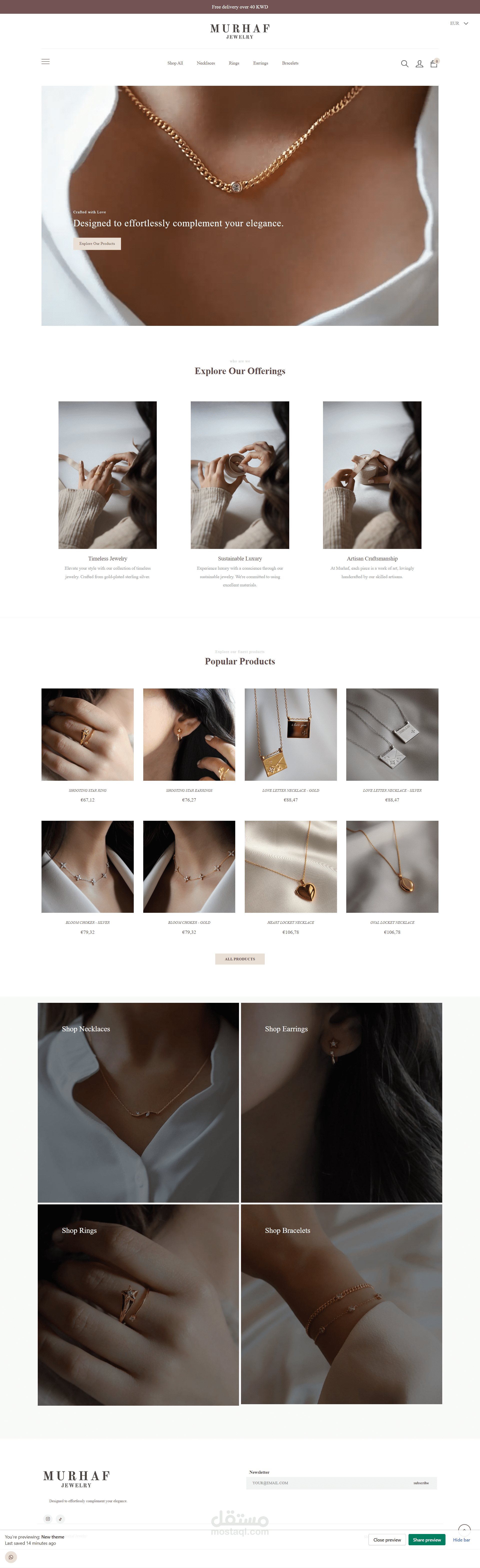 Murhaf Jewelry هو متجر إلكتروني متخصص في بيع المجوهرات الفاخرة، يهدف إلى تقديم تجربة تسوق مميزة لعشاق المجوهرات الفاخرة والراقية. تم تصميم وتطوير الموقع على منصة Shopify مع التركيز على توفير تجربة مستخدم سلسة وجذابة.