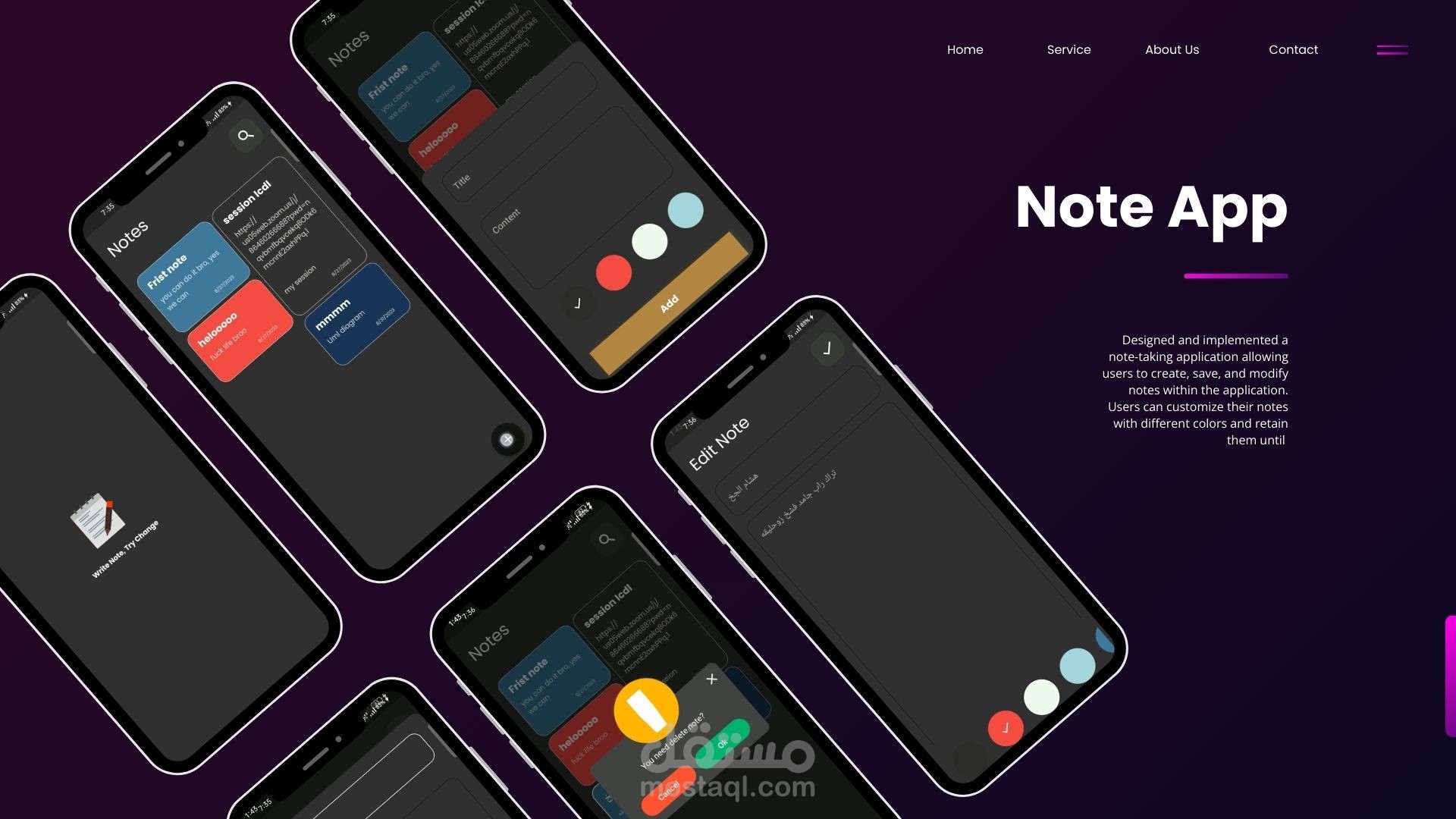 Note هو تطبيق يساعد المستخدمين على إضافة ملاحظات شخصية مع إمكانية تخصيص كل ملاحظة بعنوان، محتوى، ولون معين. يتيح التطبيق أيضًا للمستخدمين تعديل أو حذف الملاحظات بسهولة، مما يساعدهم على تنظيم أفكارهم ومهامهم اليومية بكفاءة.