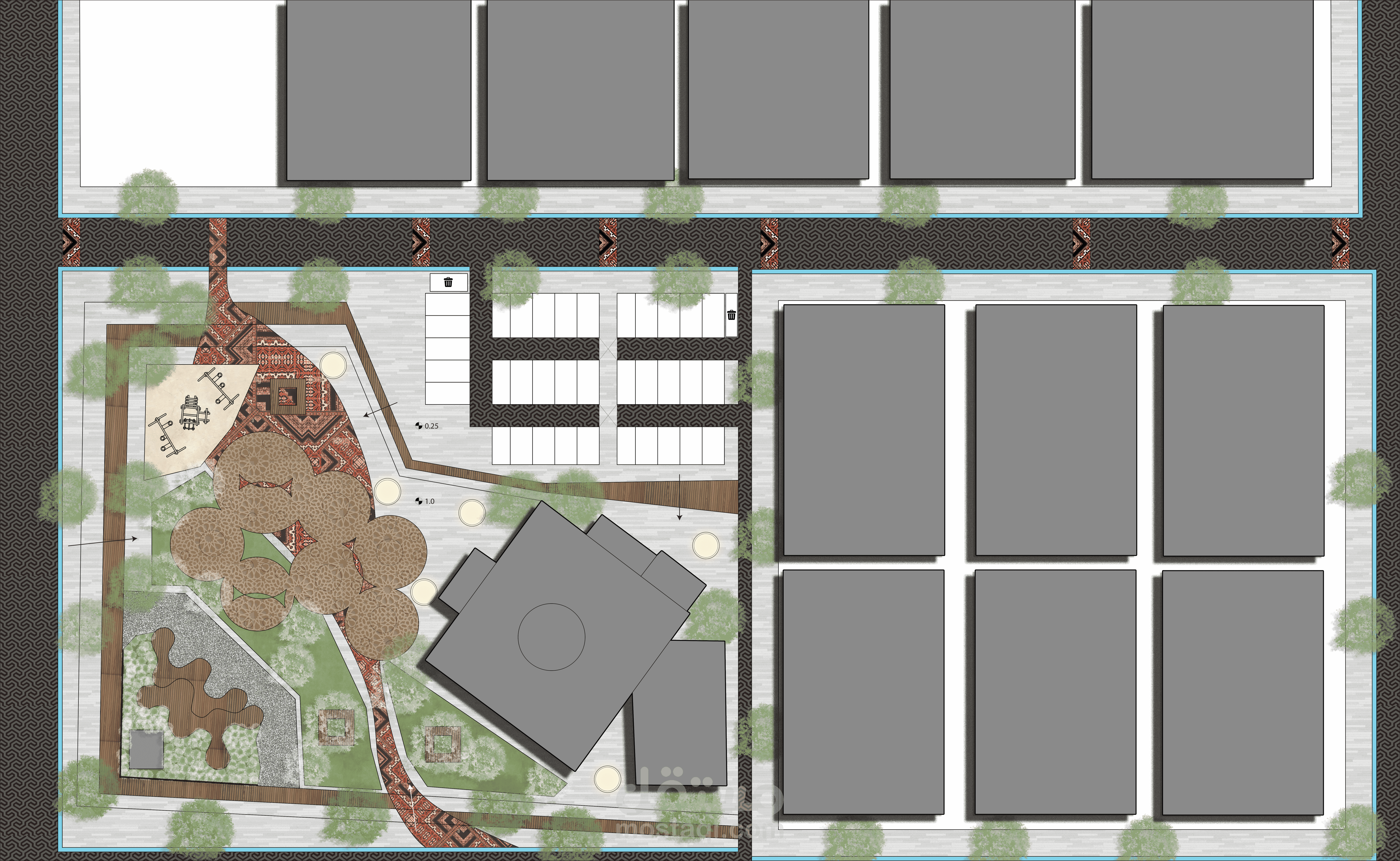 تم تصميم الحديقة بشكل يناسب ثقافة المجتمع المحيط وانسنة الشوارع بحيث تسمح للمشاة المشي باريحية