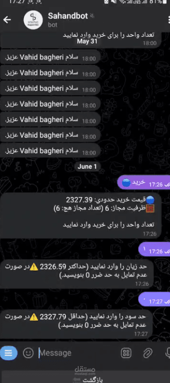 In this project, I created a Telegram bot with the ability to take orders—whether instant, spot, or pending—in the gold market. This project extensively used Python modules such as pandas, asyncio, requests, and python-telegram-bot, as well as C++ and MQL5 programming. Moreover, the database used was written in SQL. It manages customers, has different features, a wallet, and so on.