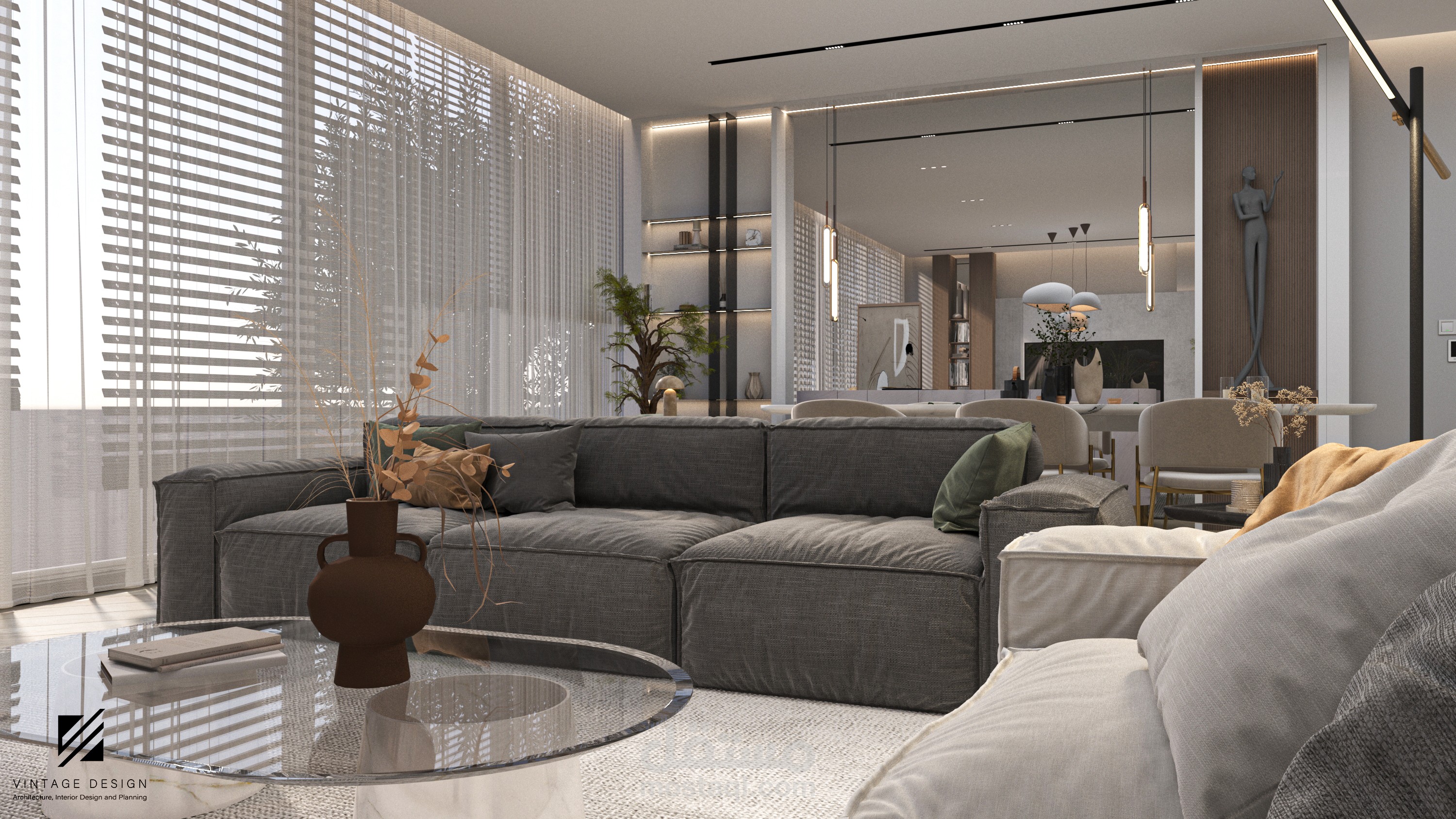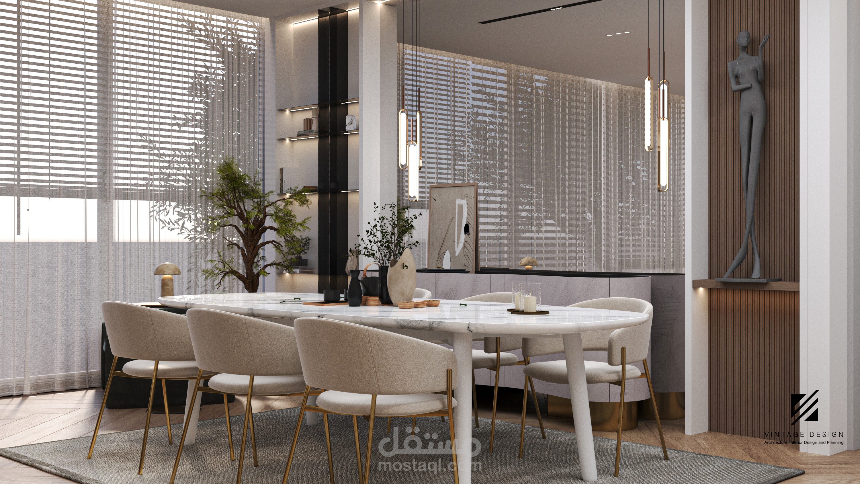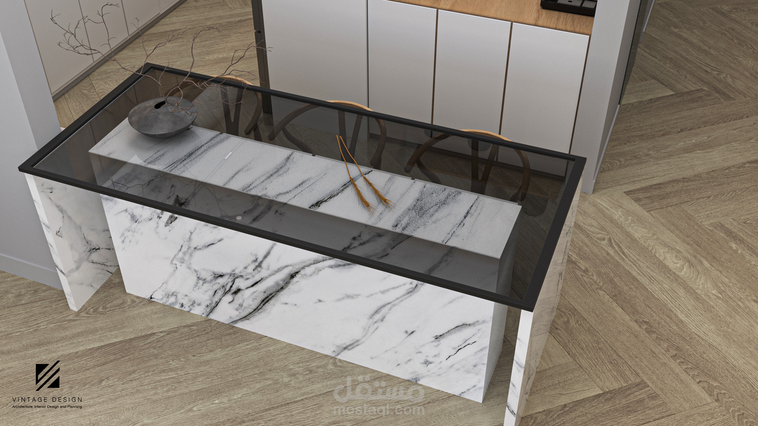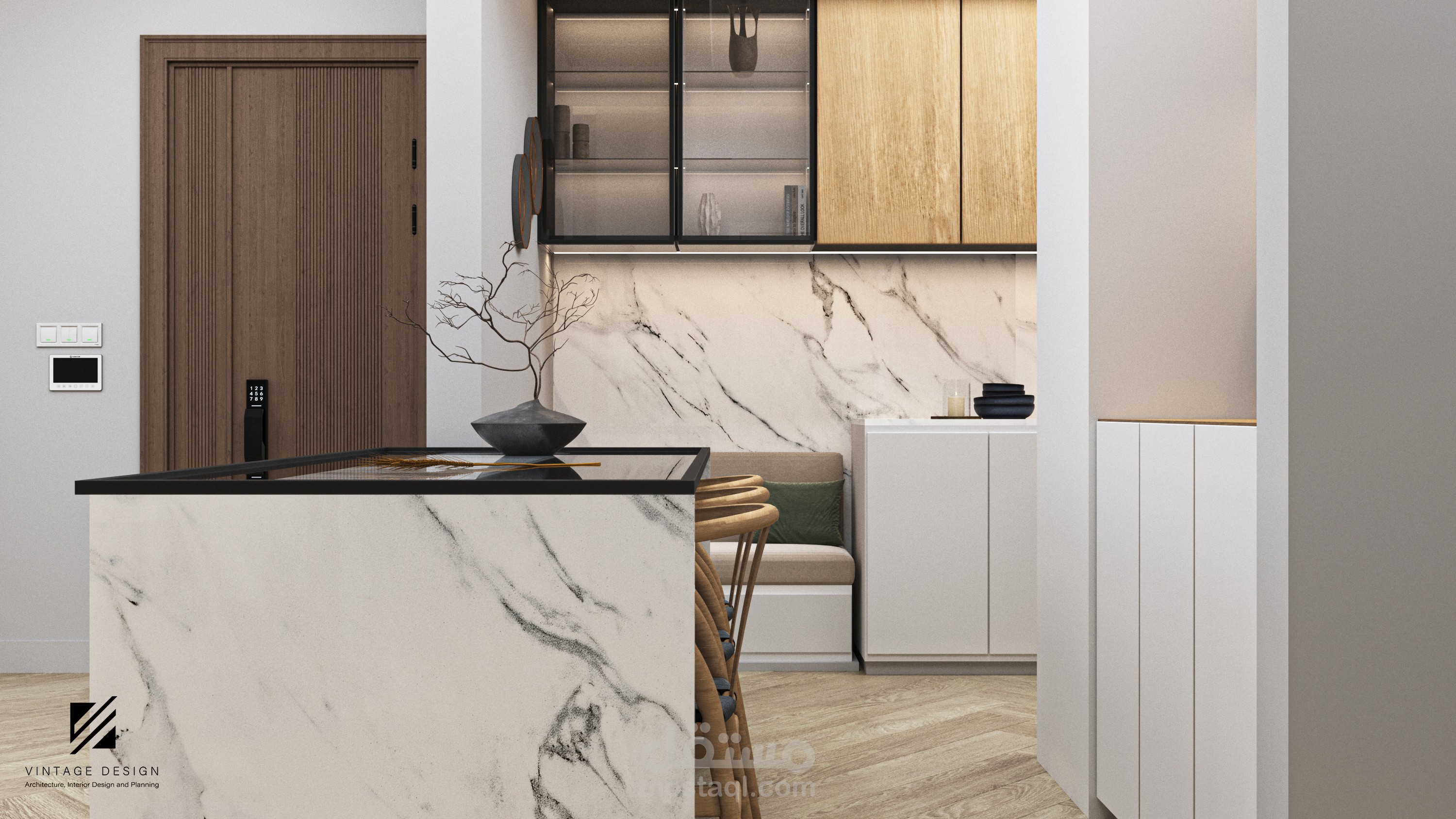 تصميم ريسبشن مودرن ب الوان ترابيه مع مطبخ اوبن مودرن لوحدة ارضى بجاردن