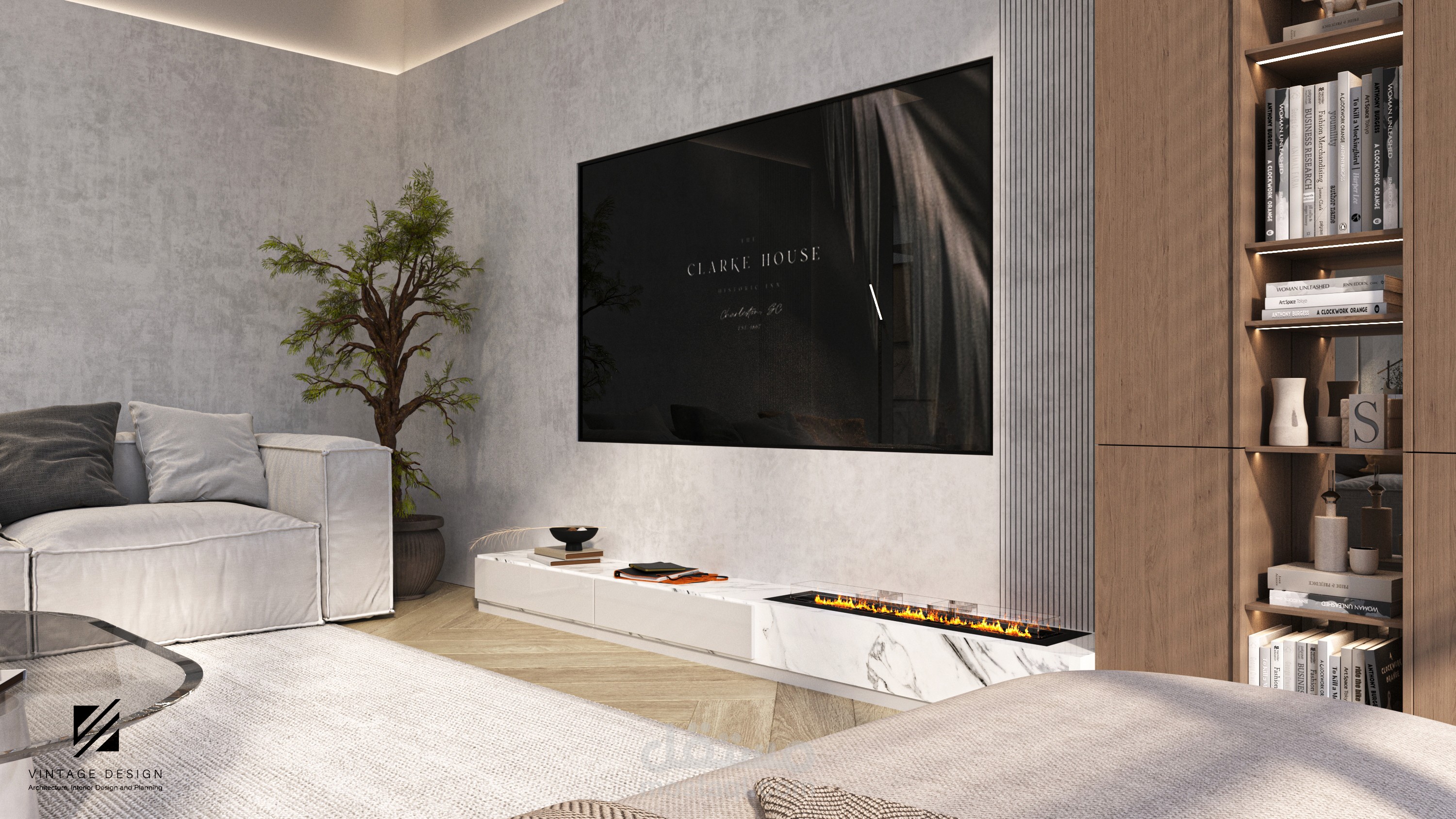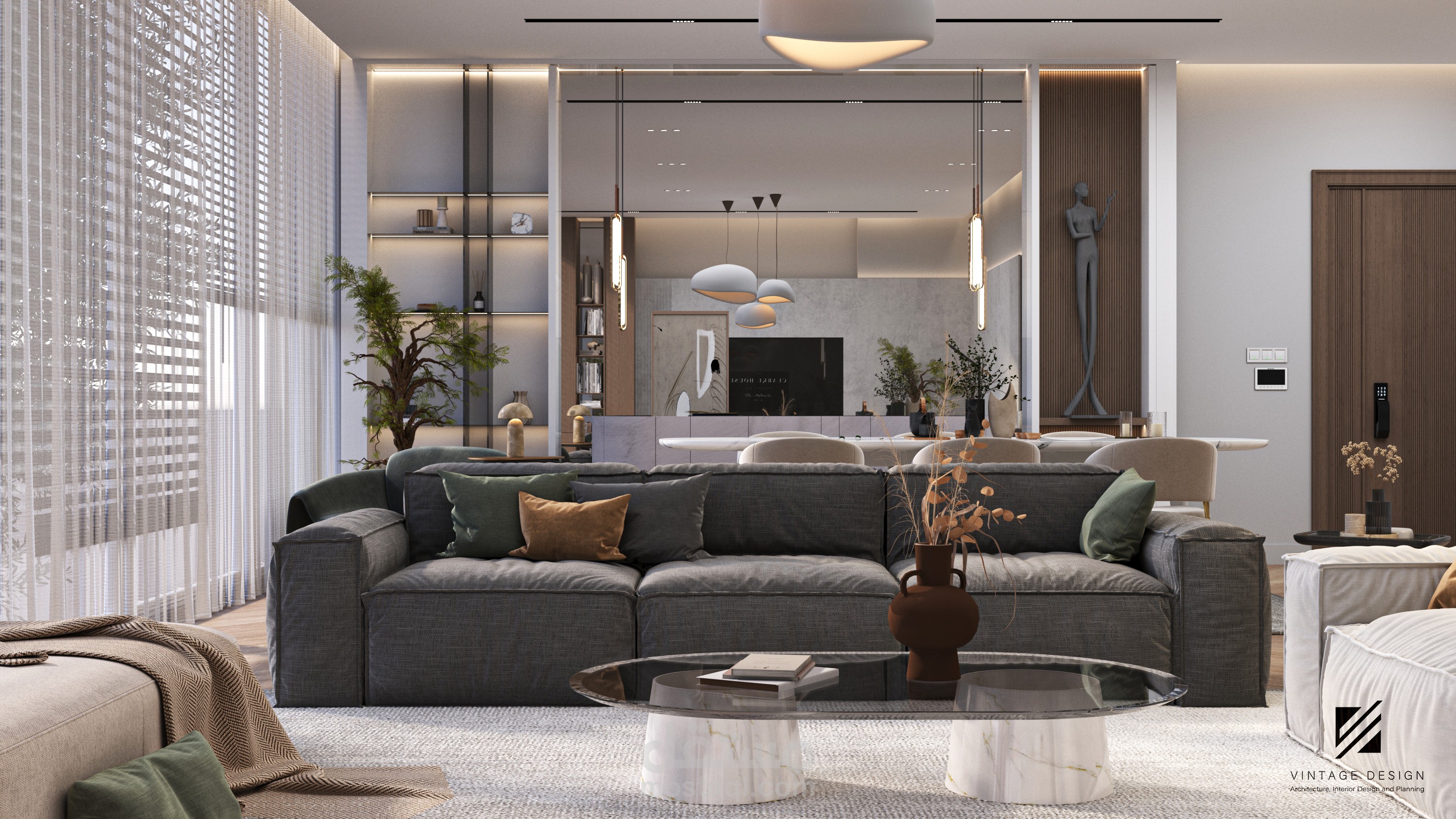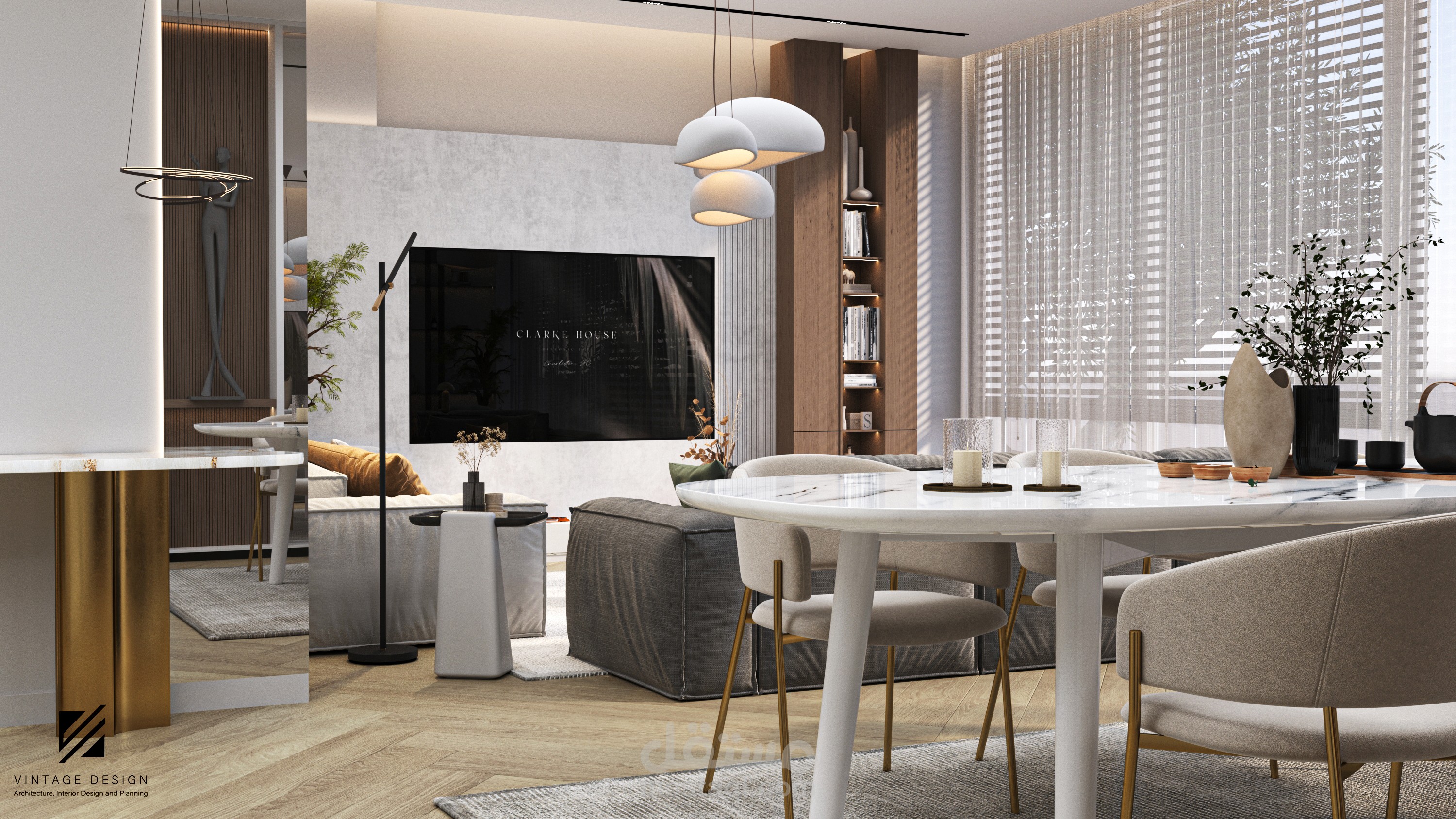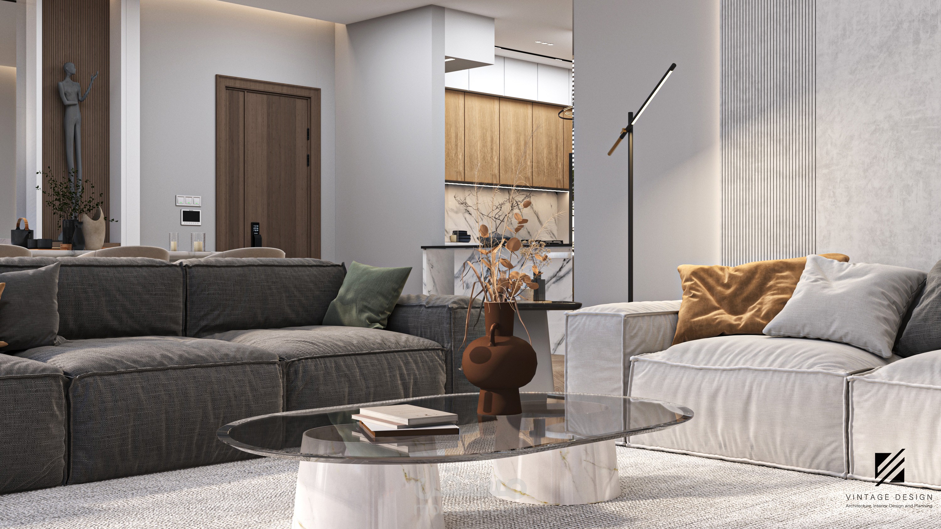 تصميم ريسبشن مودرن ب الوان ترابيه مع مطبخ اوبن مودرن لوحدة ارضى بجاردن