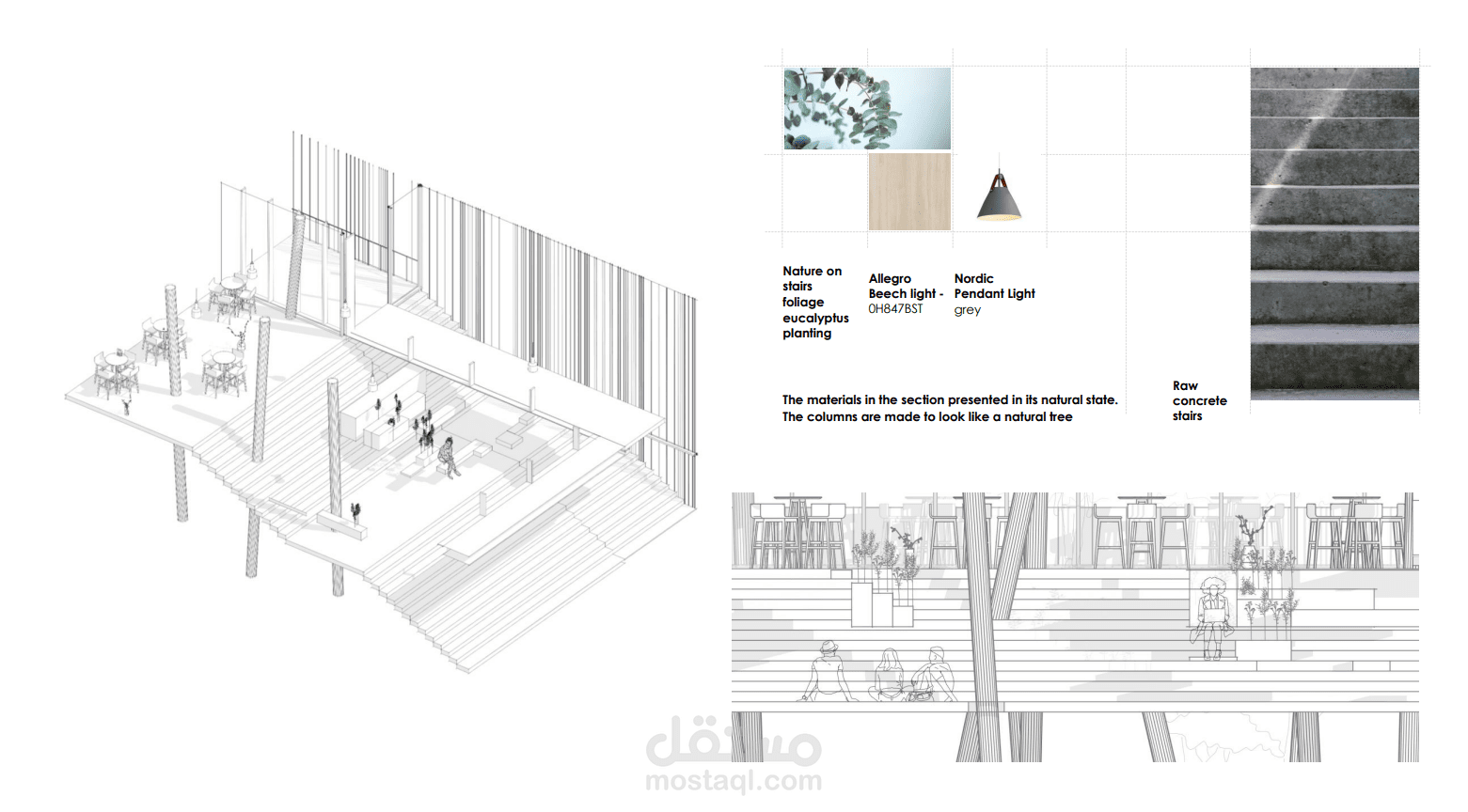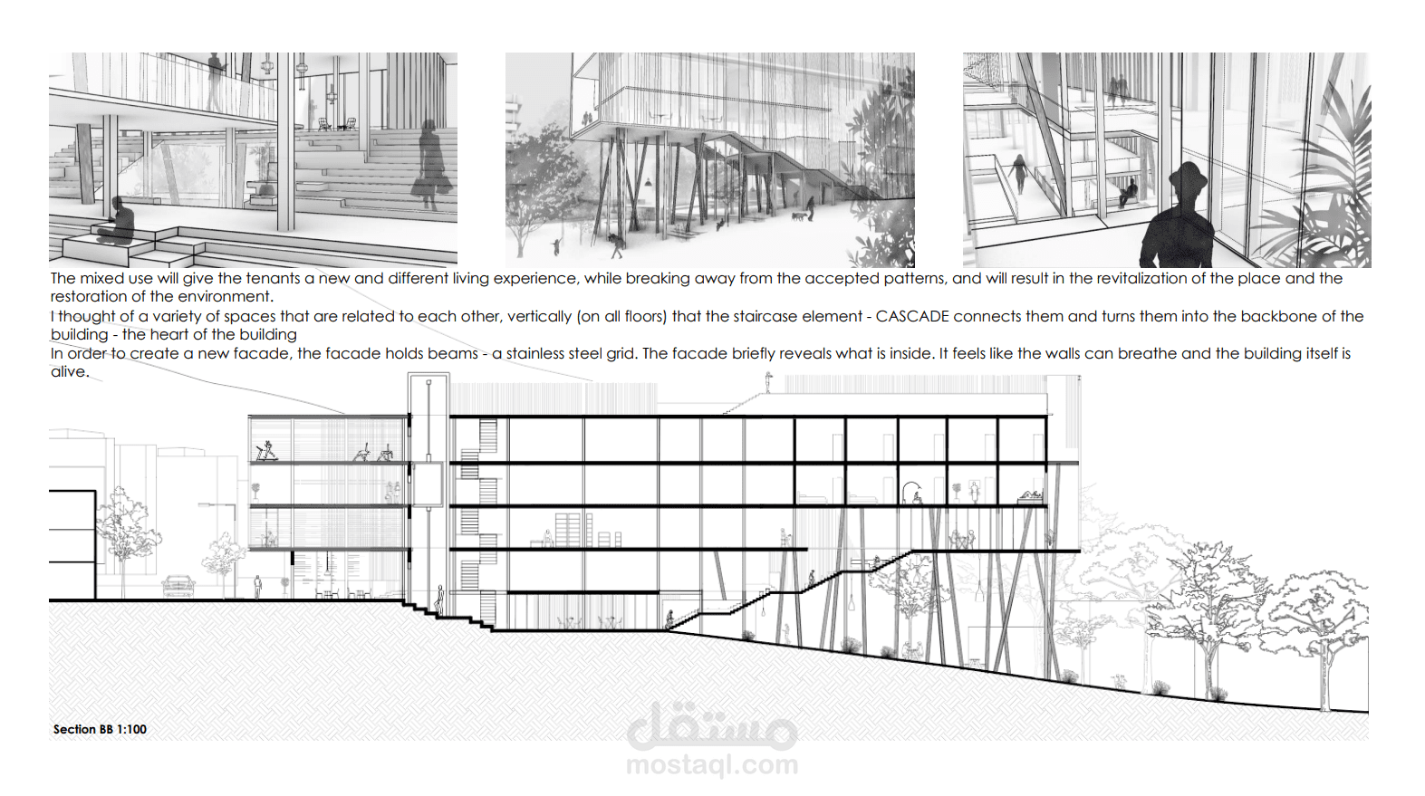 verticality of the classroom building which was connected to the cascade and