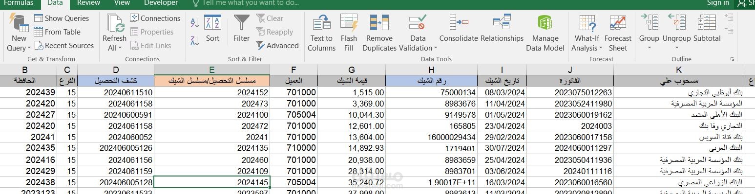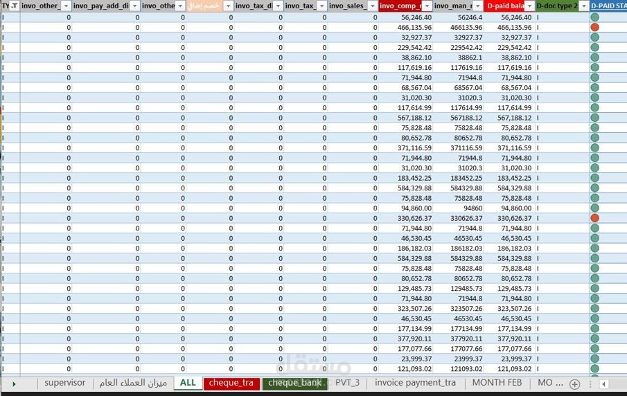 الملف هو بالصورة هو علاقة بين اكثر من ورقة عمل الاولى هى فواتير تم انشائها او مرتجعات والاستقطاعات المدرجة مثل ضرية القيمة المضافة او الخصومات المدرجة على الفاتورة ثم ملف اخر بالتحصيلات المستلمه من العملاء وتواريخ استحقاقها وكل هذه الملفات ترحل الى الملف الاخير مع علامة تميزية بالاخضر او الاحمر كما بالصورة لتشير الى الفواتير التى تم تحصيلها من عدمه وبيانات ايضاحيه للسداد من تواريخ استحقاق شيكات او ارقامها وباقى البيانات التى تم القائم بهذا العمل مع العلم ان العديد من مراحل البرنامج تتم تلقائى بشكل تمكن المستخدم من متابعة فقط المتاخرات واعداد التقارير عن المتاخرات فى التحصيل واسماء العملاء