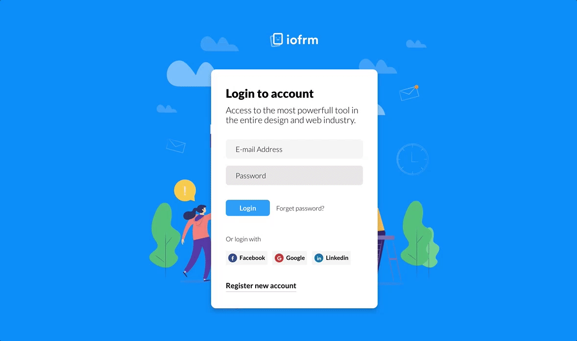 Use iofrm templates to enhance your project’s login/register page, or any page with fields and forms.
