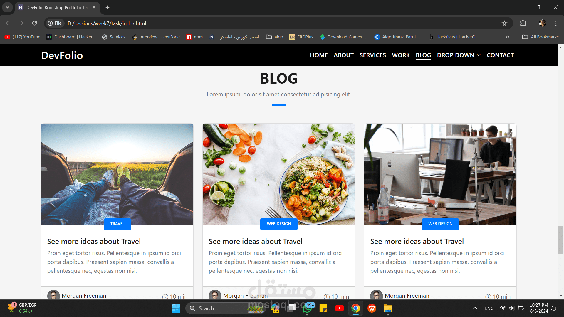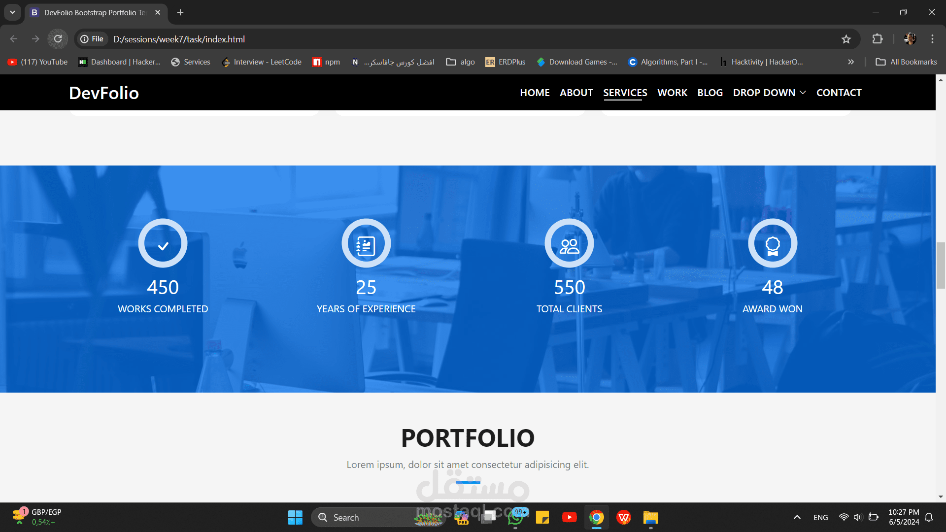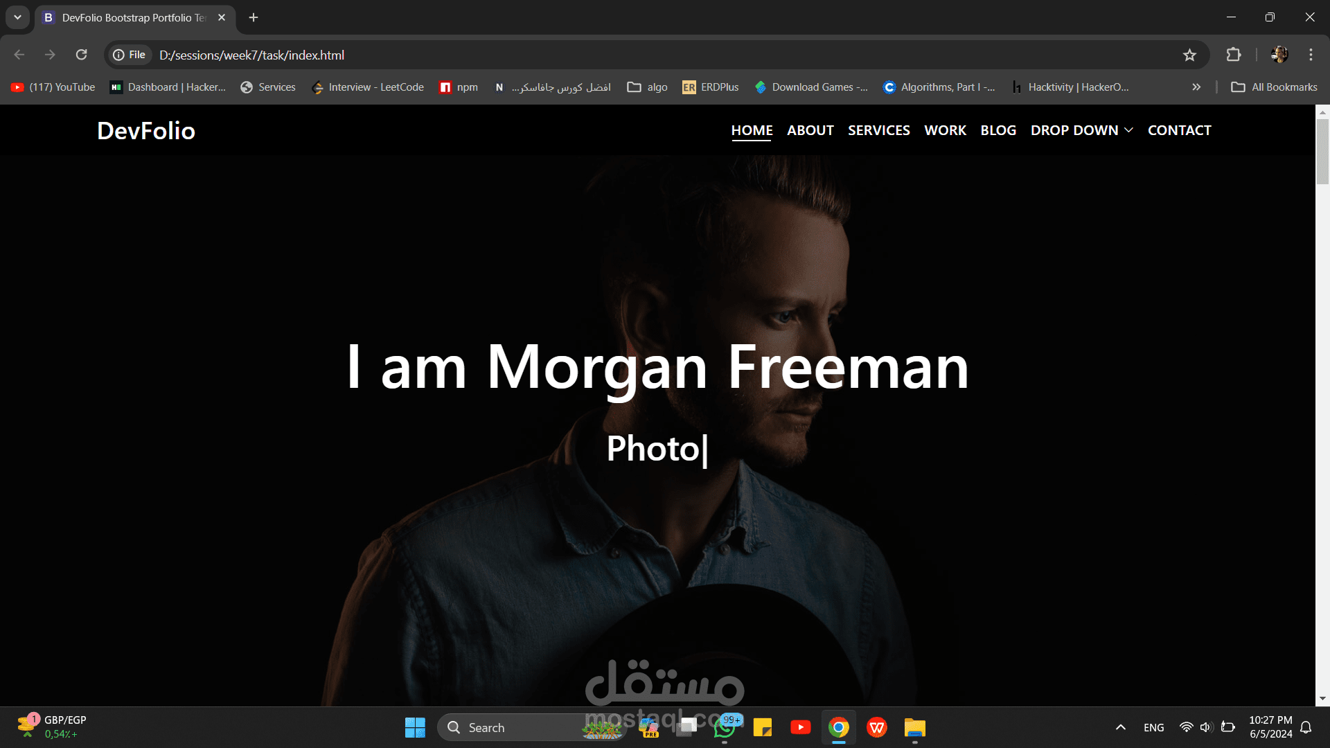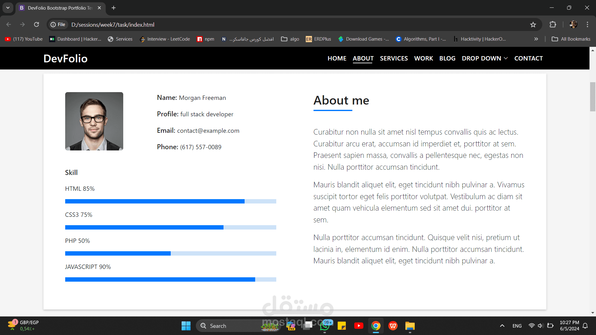المشروع هو قالب بورتفوليو مبني باستخدام Bootstrap يسمى "DevFolio". يحتوي على أقسام متعددة مثل الصفحة الرئيسية، نبذة عني، الخدمات، الأعمال، المدونة، والتواصل. يتضمن المشروع سيرة ذاتية لمطور برمجيات يُدعى "مورغان فريمان" مع مهاراته وتفاصيل الاتصال به. كما يعرض الخدمات التي يقدمها مثل تصميم الويب، تطوير الويب، التصوير الفوتوغرافي، التصميم المتجاوب، التصميم الجرافيكي، وخدمات التسويق. يحتوي القالب أيضًا على عدادات لإحصائيات الأعمال المكتملة، سنوات الخبرة، العملاء الكليين، والجوائز التي فاز بها.