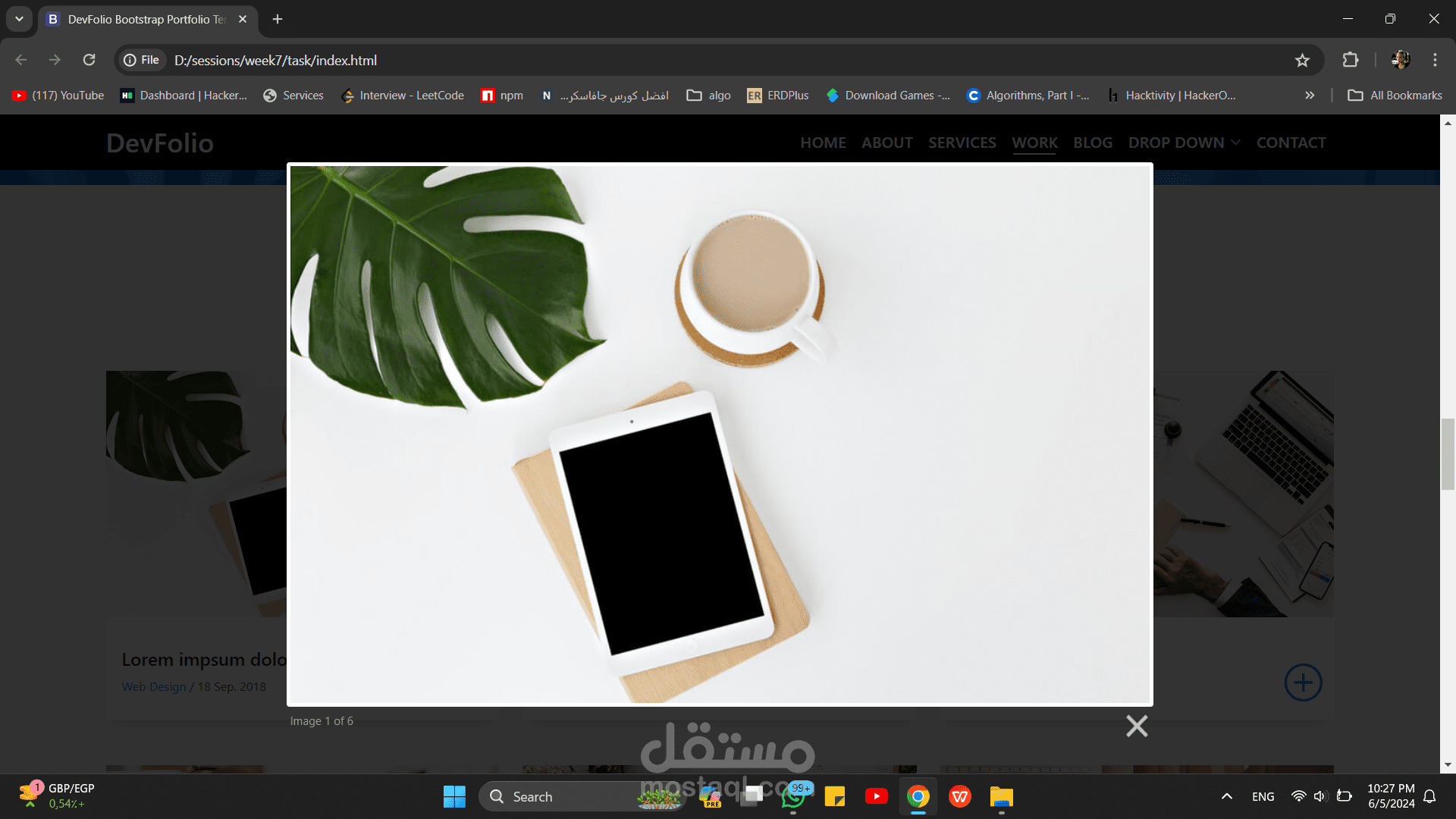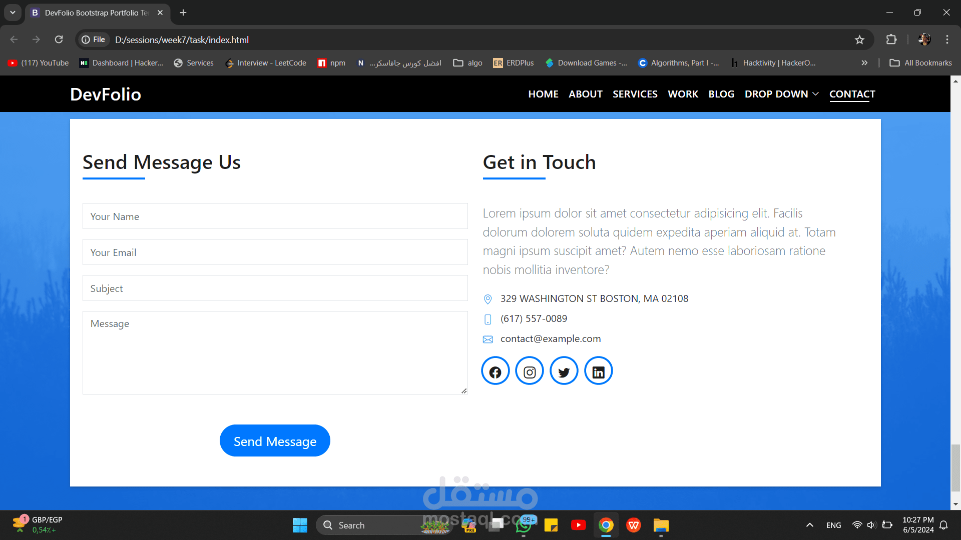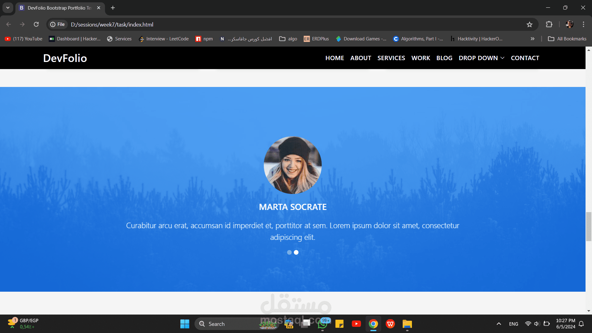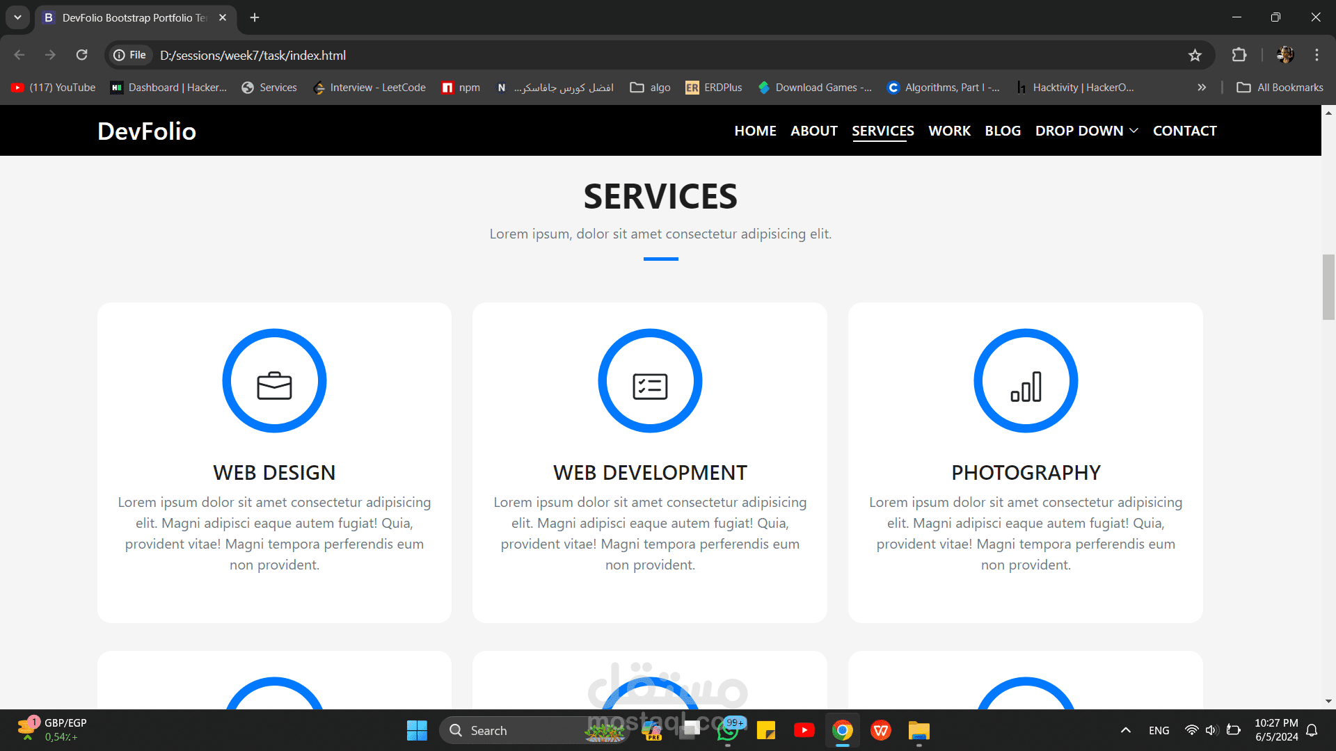 المشروع هو قالب بورتفوليو مبني باستخدام Bootstrap يسمى "DevFolio". يحتوي على أقسام متعددة مثل الصفحة الرئيسية، نبذة عني، الخدمات، الأعمال، المدونة، والتواصل. يتضمن المشروع سيرة ذاتية لمطور برمجيات يُدعى "مورغان فريمان" مع مهاراته وتفاصيل الاتصال به. كما يعرض الخدمات التي يقدمها مثل تصميم الويب، تطوير الويب، التصوير الفوتوغرافي، التصميم المتجاوب، التصميم الجرافيكي، وخدمات التسويق. يحتوي القالب أيضًا على عدادات لإحصائيات الأعمال المكتملة، سنوات الخبرة، العملاء الكليين، والجوائز التي فاز بها.