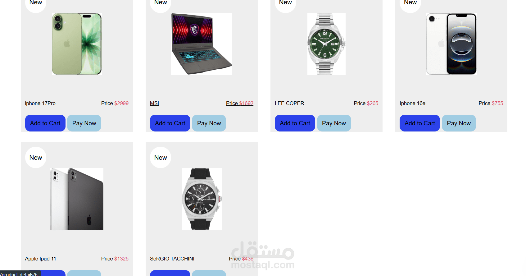 Display products with images, prices, and detailed descriptions.