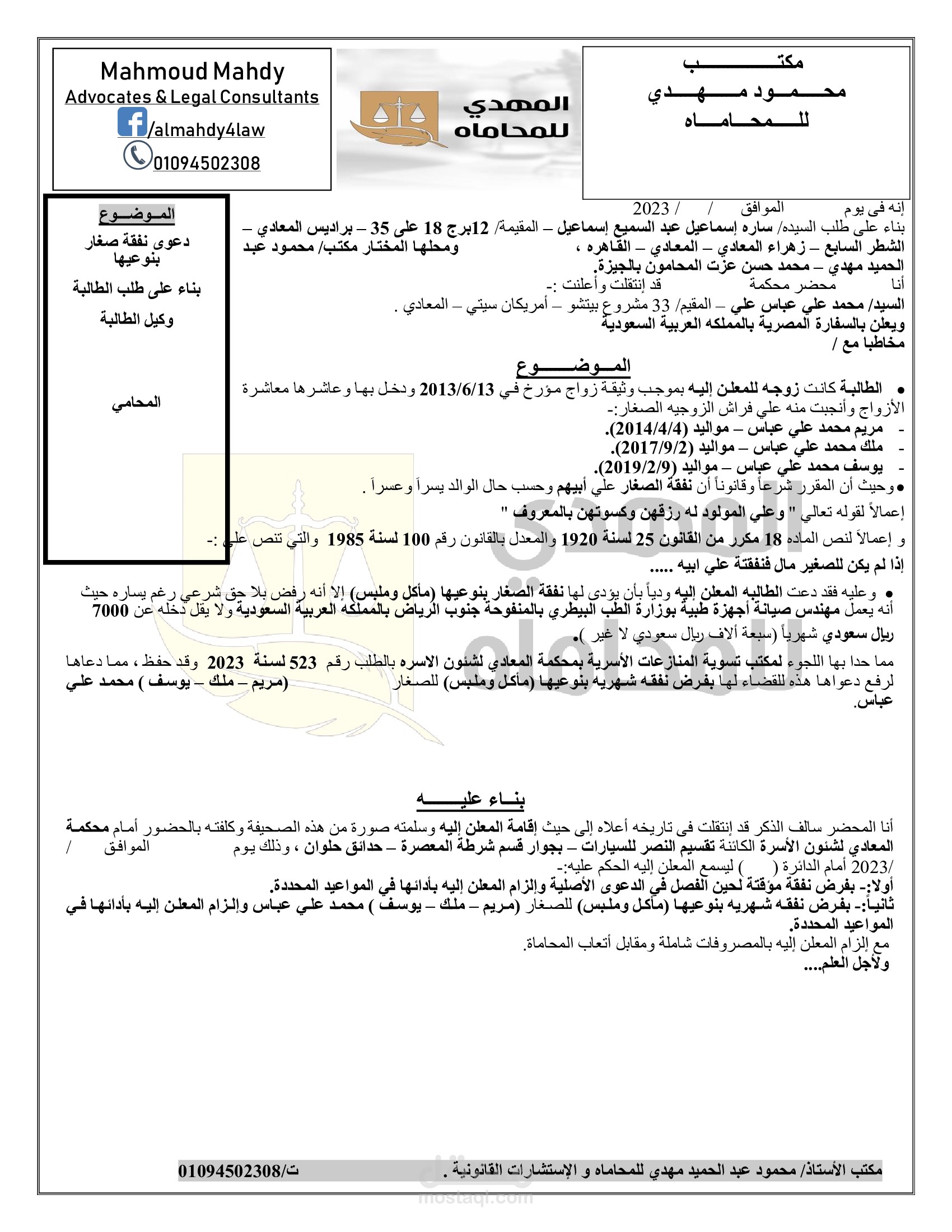 عريضة دعوى نفقة صغار بنوعيها أمام المحاكم المصرية
