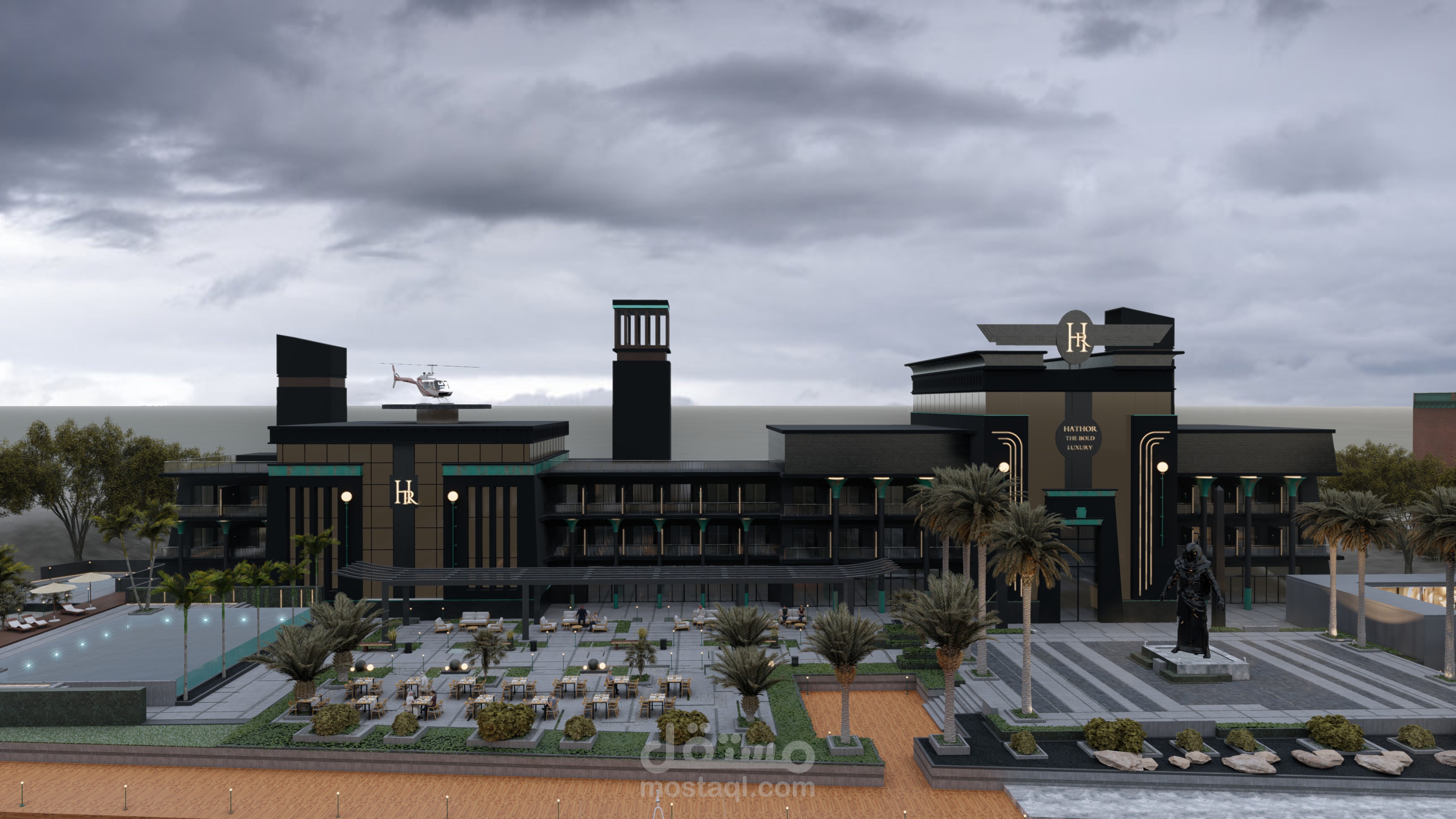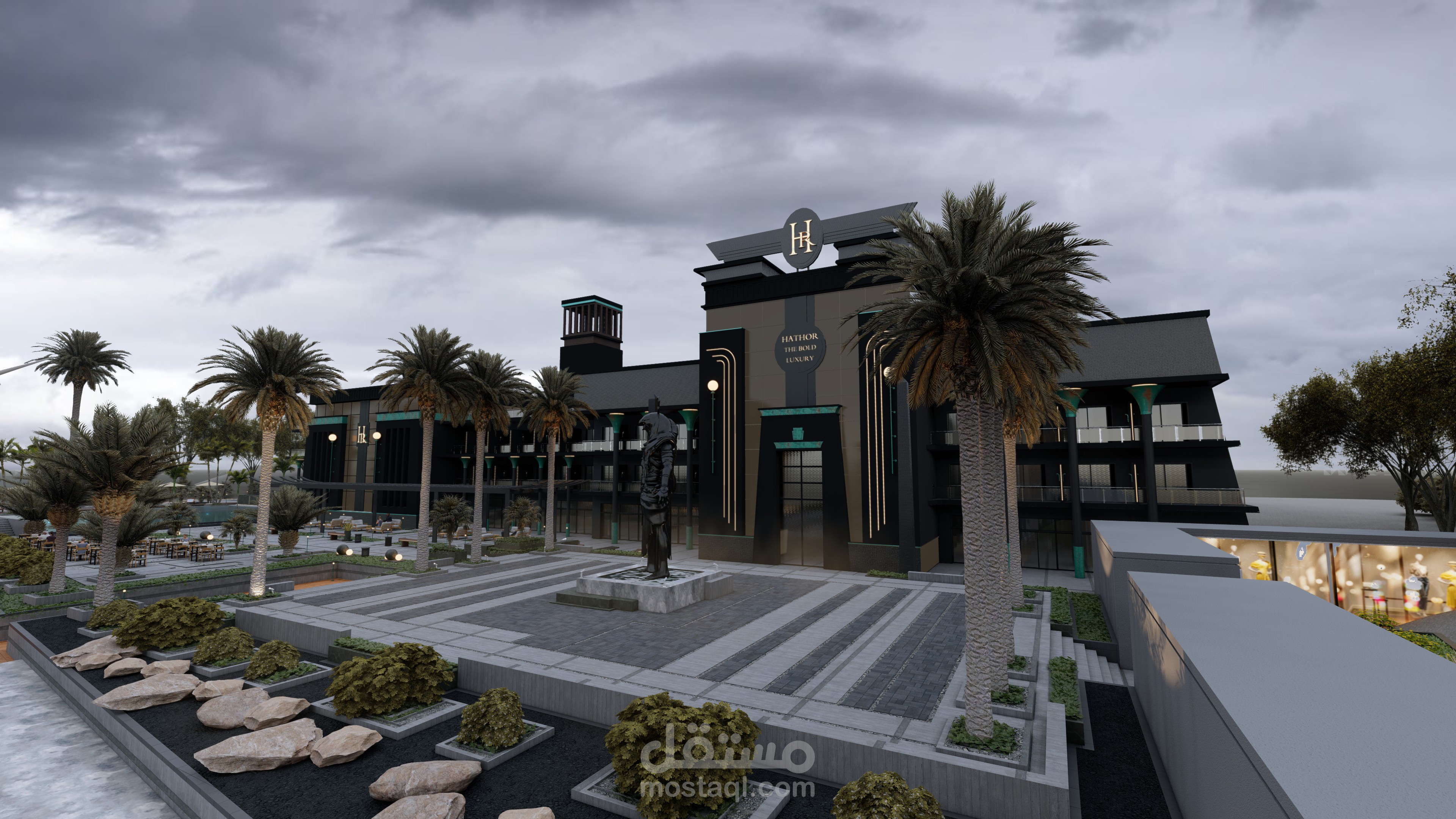 فندق حتحور في قنا تم تصميمه بدقة متناهية مع مراعاة الهوية البصرية الفرعونية لمعبد حتحور بقنا حيث تم تصميم كل عنصر يدويا وذلك لوحدة عضوية المشروع ، كما تم تقليل استهالك الطاقة و ذلك عن طريق تطويع ملاقف هوائية موجبة و سالبة أعلى المبنى كما تم تزويد المبنى بعدد 2 توربين ، و تم تحويل حمام السباحة من عادي إلى انفينيت وذلك لمواكبة الرفاهية المعاصرة.