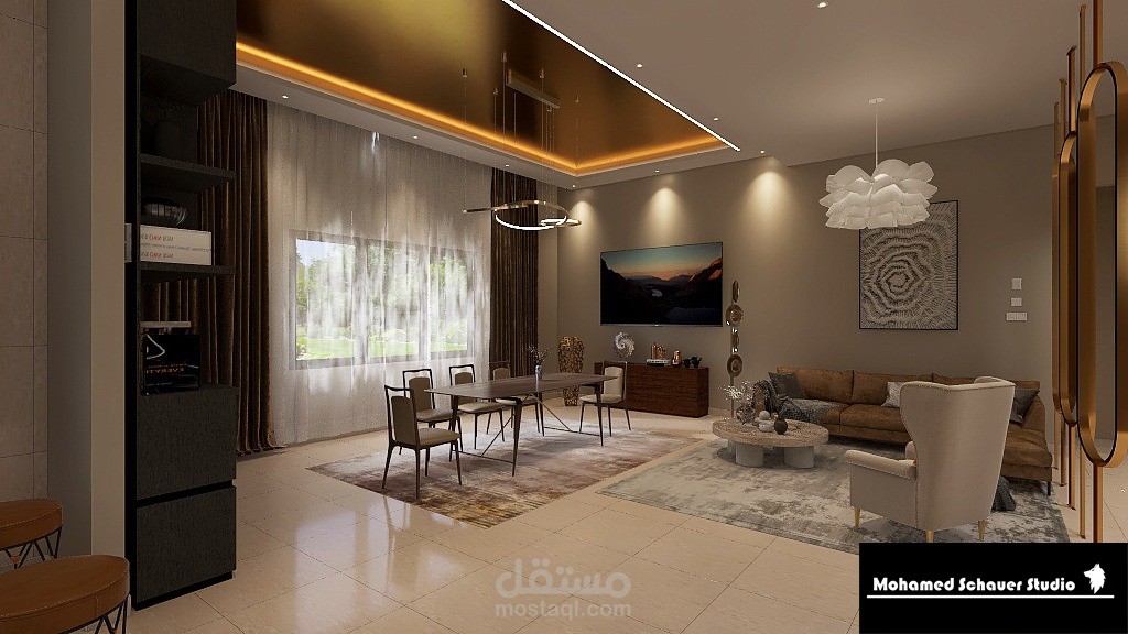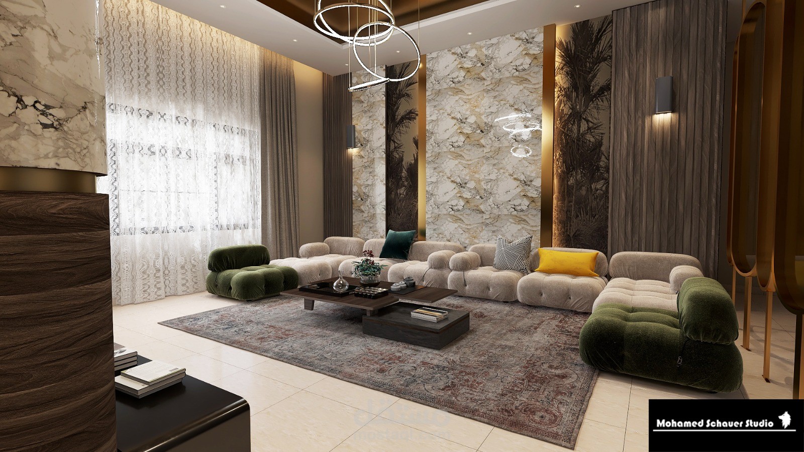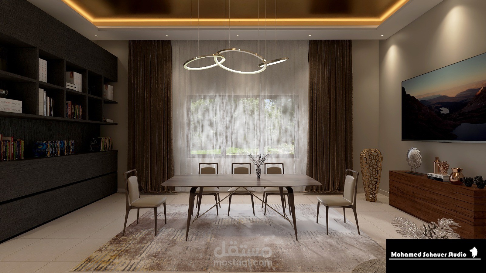 تصميم داخلي لفيلا في الكويت والتي تبلغ مساحتها حوالي 320م2 ،تم اختيار عناصر التصميم بعناية لموائمة البيئة الخارجية ، وإضفاء روح الثقافة الكويتية في جميع فراغات الفيلا ، وتم تصميم الحوائط و مكتبة التلفاز يدوياً لكي تتماشلا خطوط التصميم و تحقيق نظرية العضوية في الفراغ .