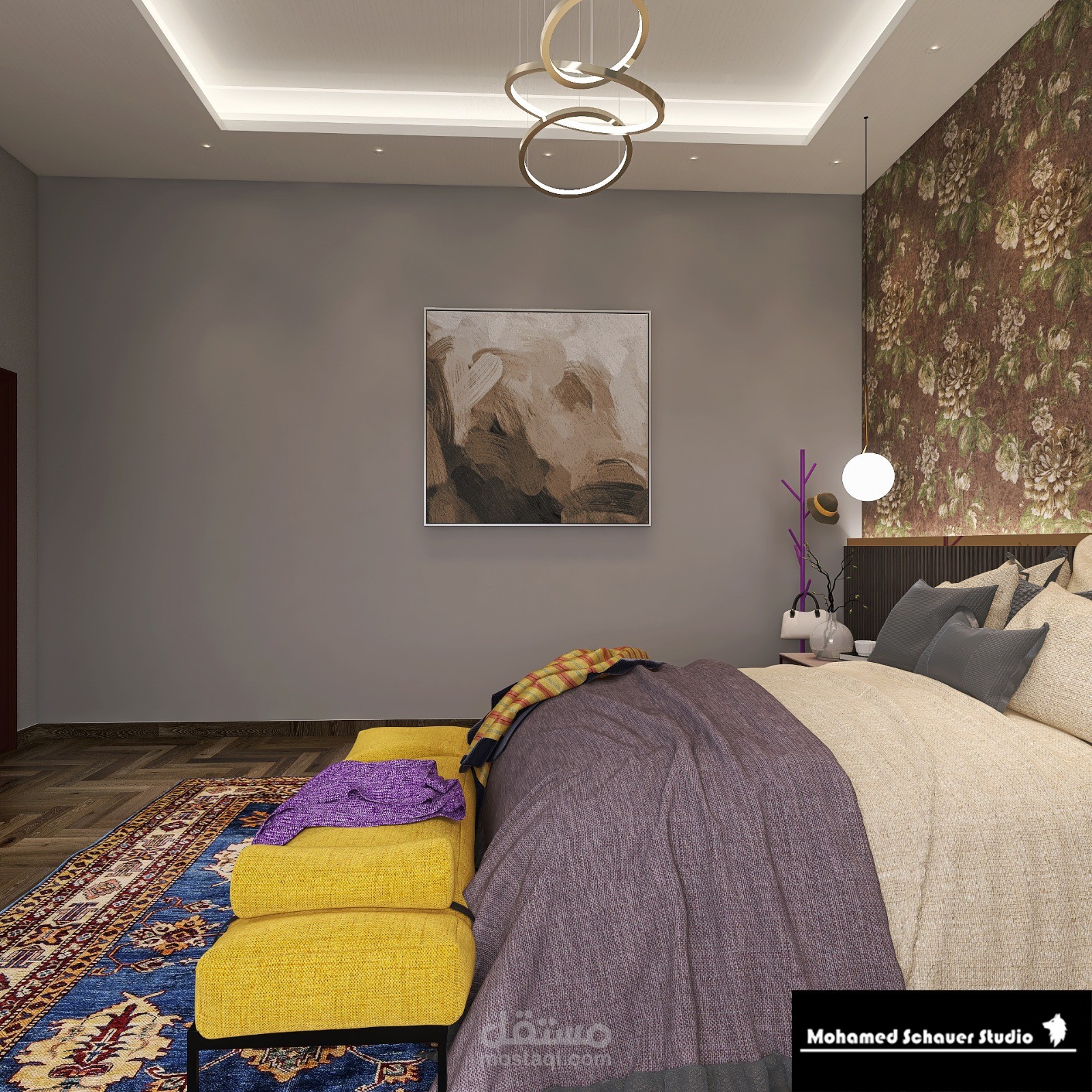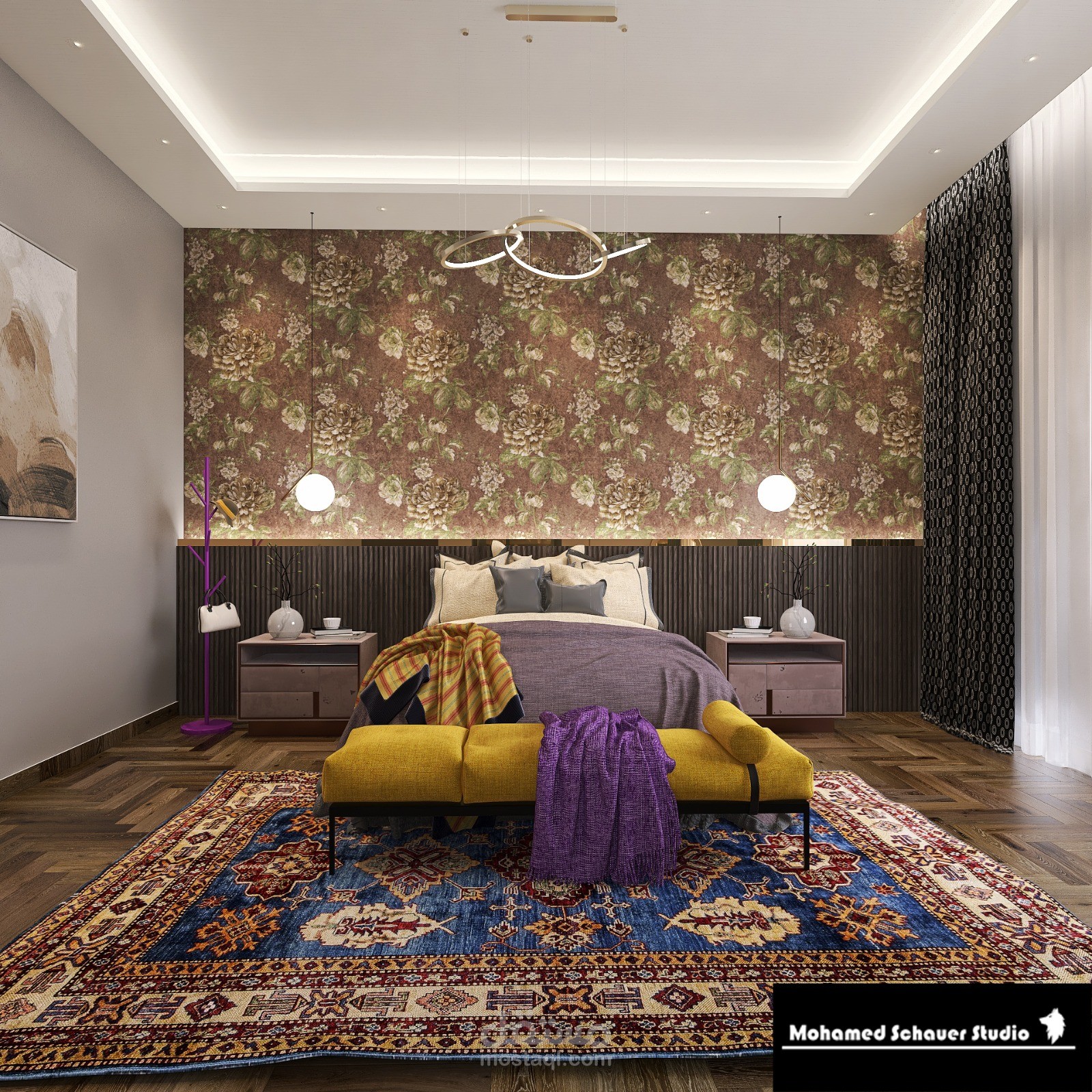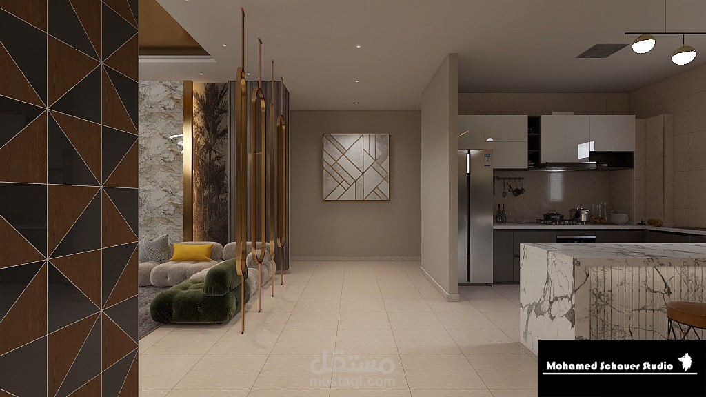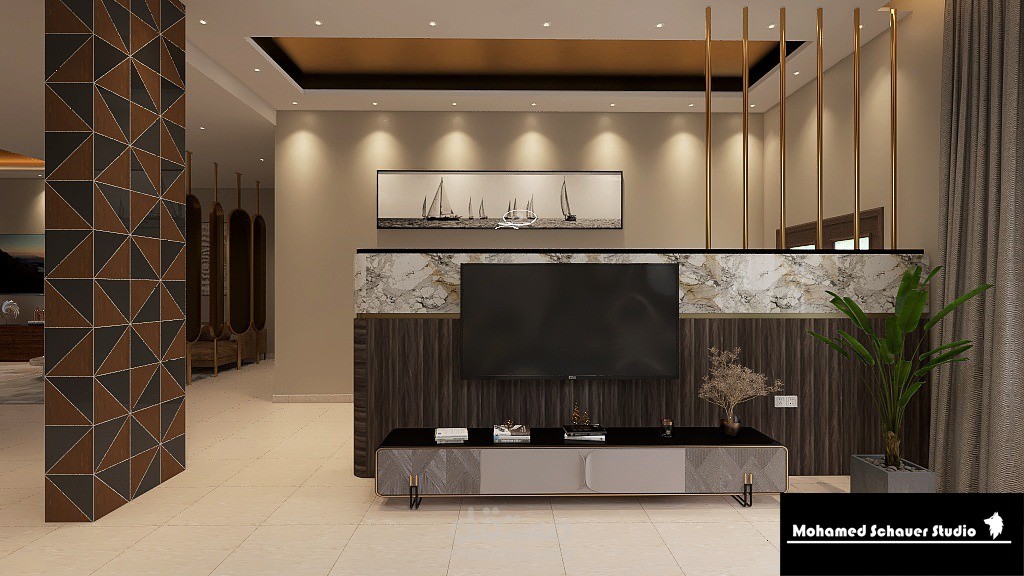 تصميم داخلي لفيلا في الكويت والتي تبلغ مساحتها حوالي 320م2 ،تم اختيار عناصر التصميم بعناية لموائمة البيئة الخارجية ، وإضفاء روح الثقافة الكويتية في جميع فراغات الفيلا ، وتم تصميم الحوائط و مكتبة التلفاز يدوياً لكي تتماشلا خطوط التصميم و تحقيق نظرية العضوية في الفراغ .