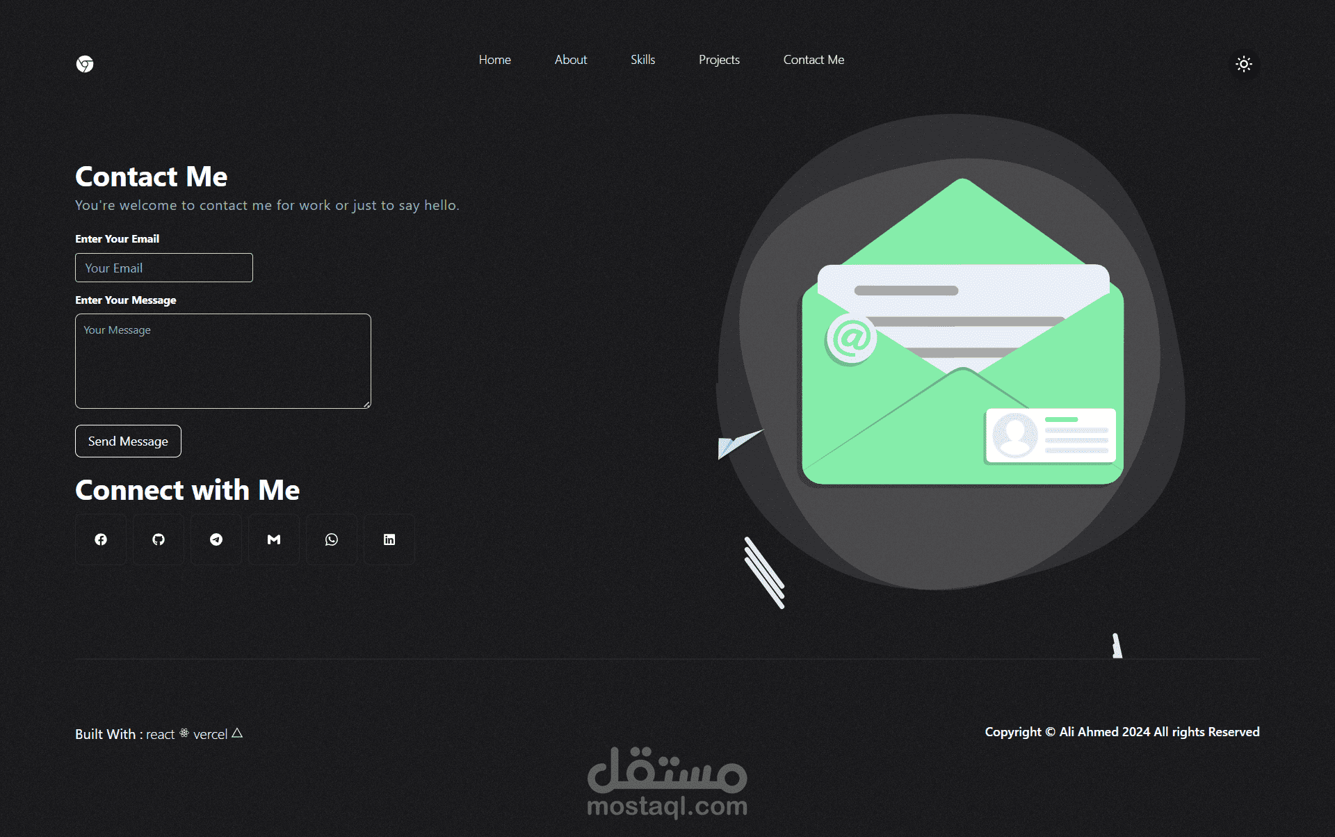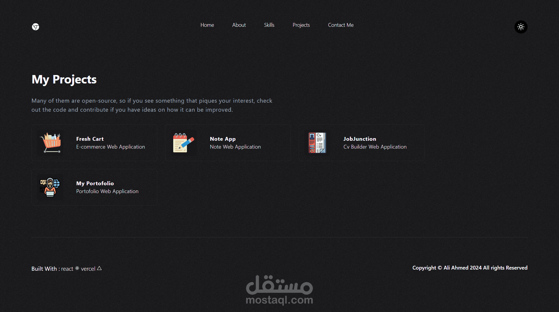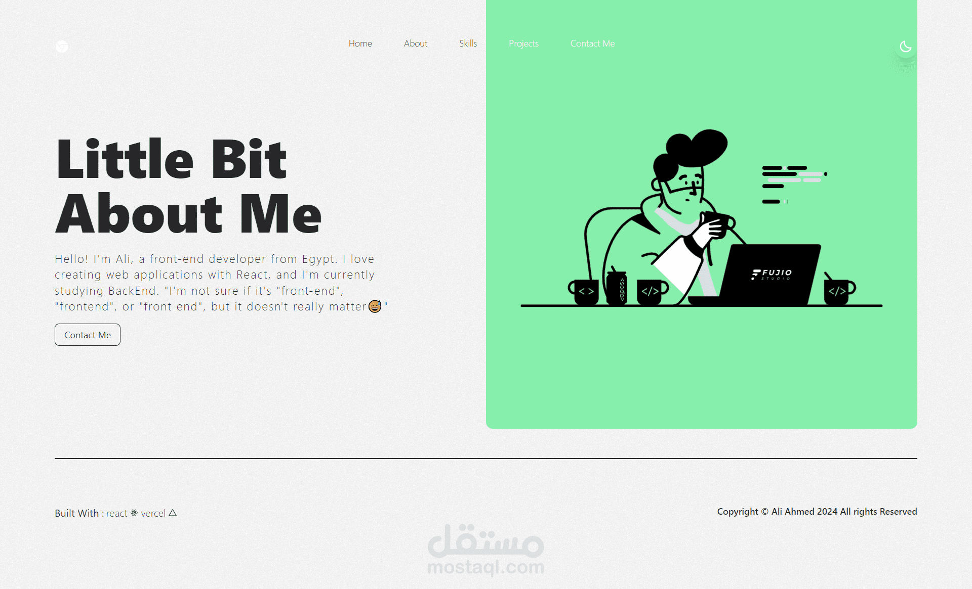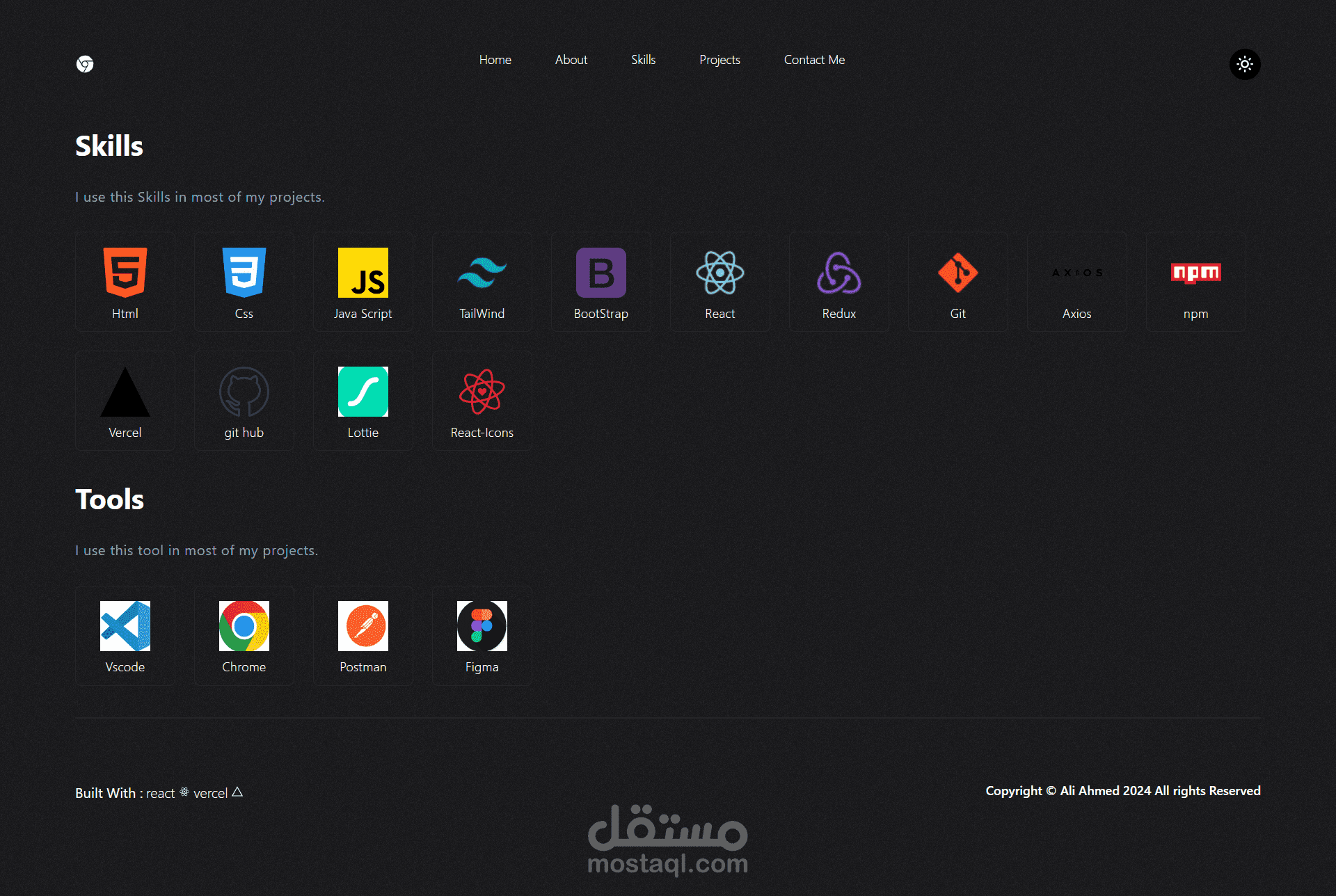 يحتوي ال portfolio على 6 صفحات رئيسية home ,about ,contact us ,skills ,projects, project details باستخدام React.js، وTailwind، واستخدام الرسوم المتحركة لملفات Lotiefiles