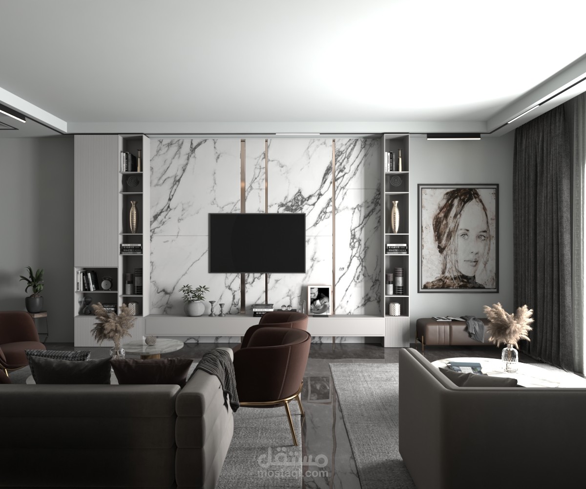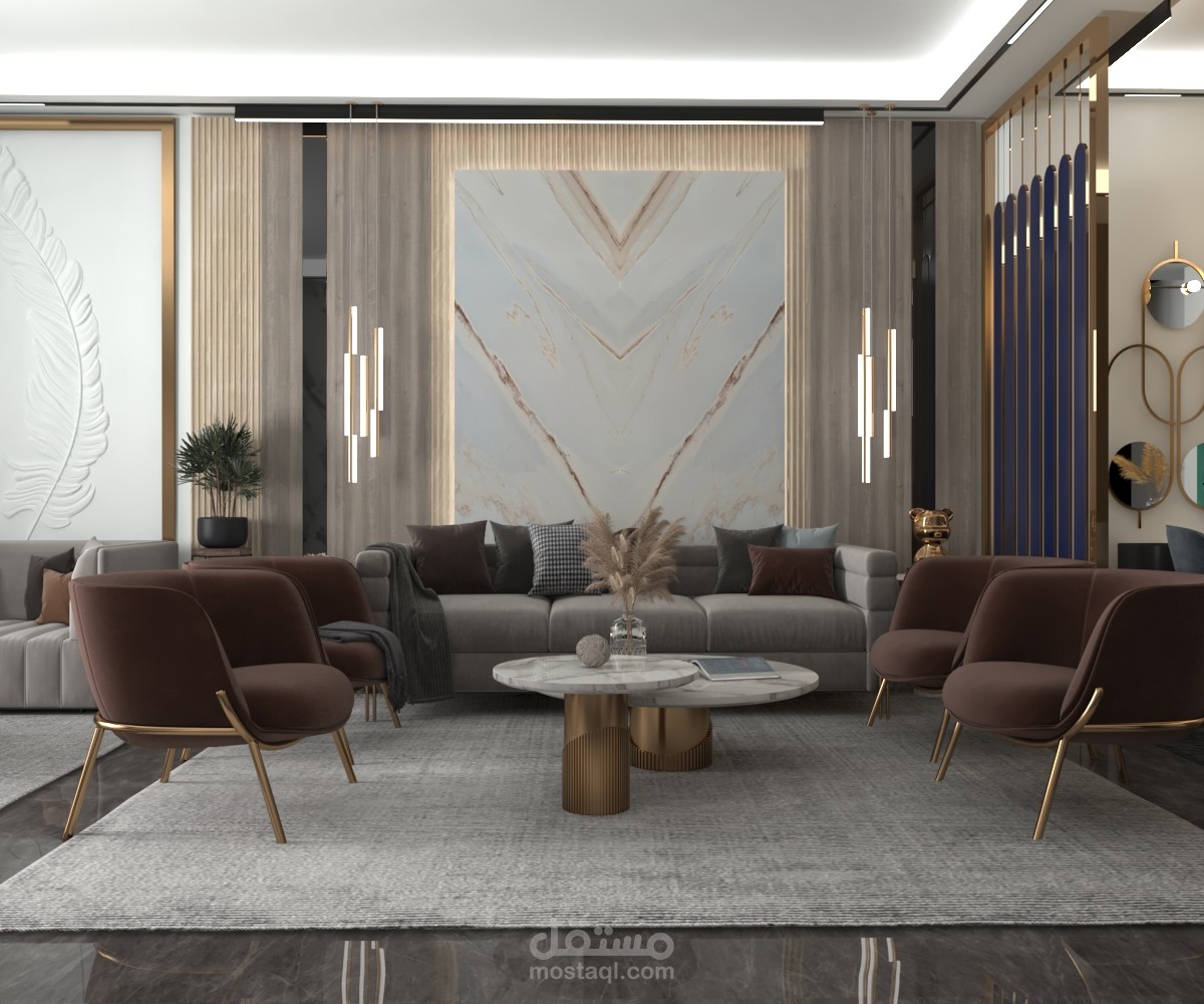 تصميم ريسبشن مودرن تم الاعتماد فيه عل ديكورات وتجاليد خشبية وبديل رخام لم اعتمد هنا عل ديكورات بسيطة بل استعملت كثير من الديكورات والتجاليد حتى أظهره بتلك الصورة النهائية لإرضاء جميع الأذواق