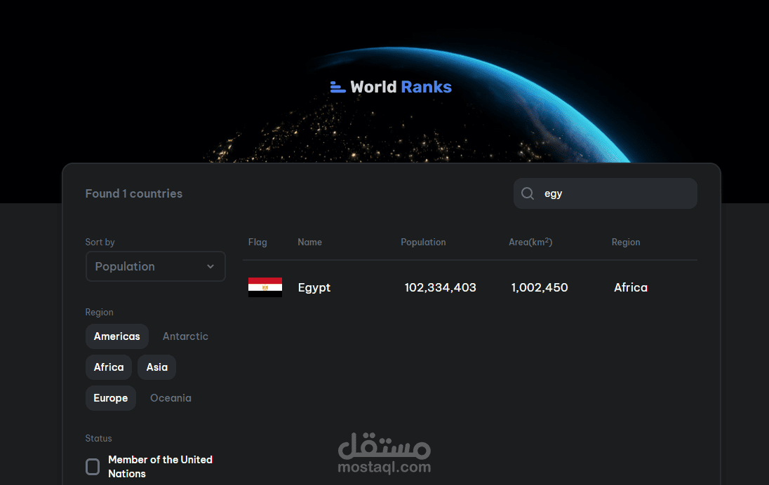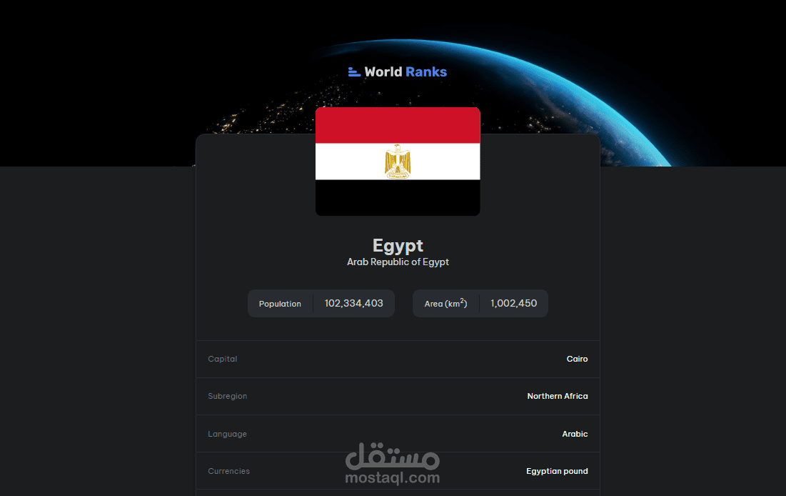 موقع ويب يعرض معلومات عن جميع دول العالم يتيح للمستخدمين عرض الدول مرتبة حسب الاسم او القارة او المساحة او عدد السكان كما يستطيع البحث عن دولة محددة و عرض معلومات عنها.