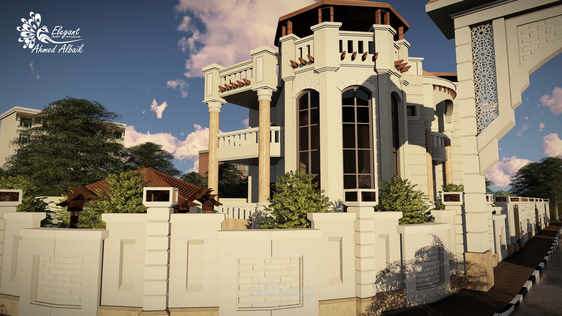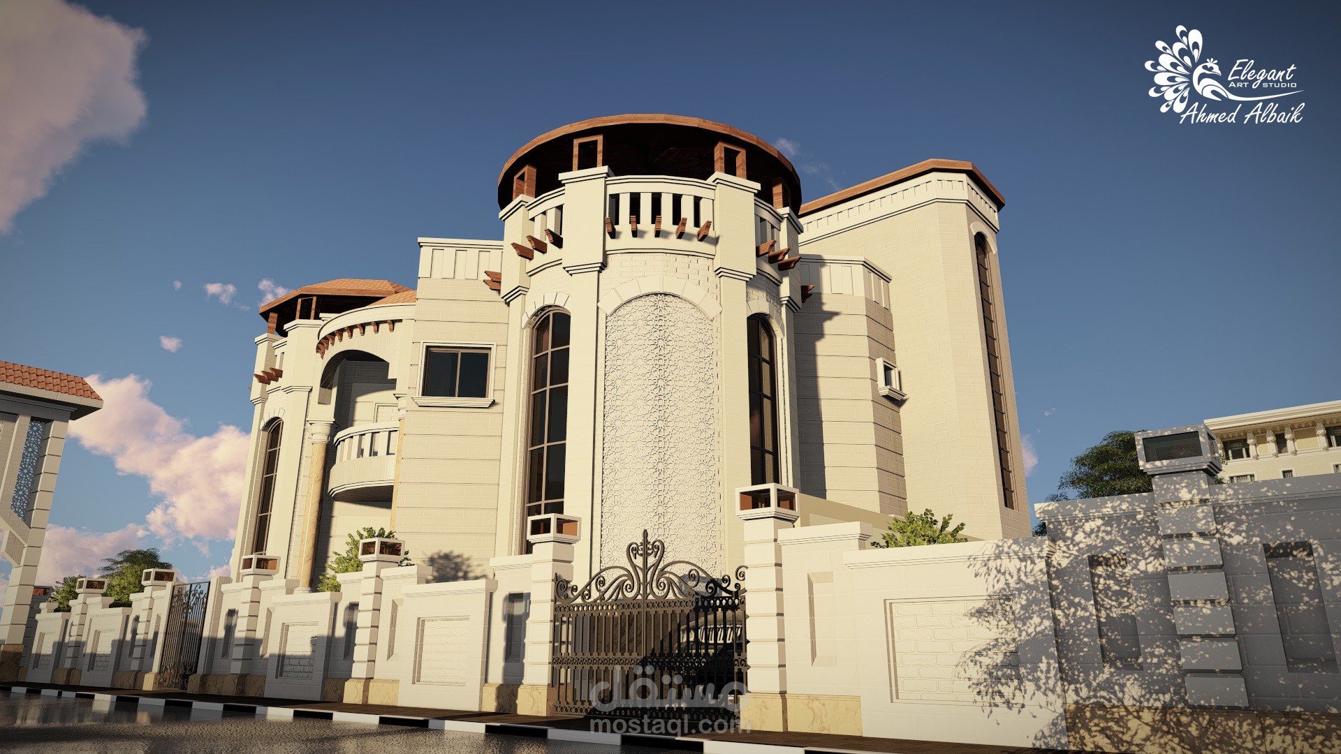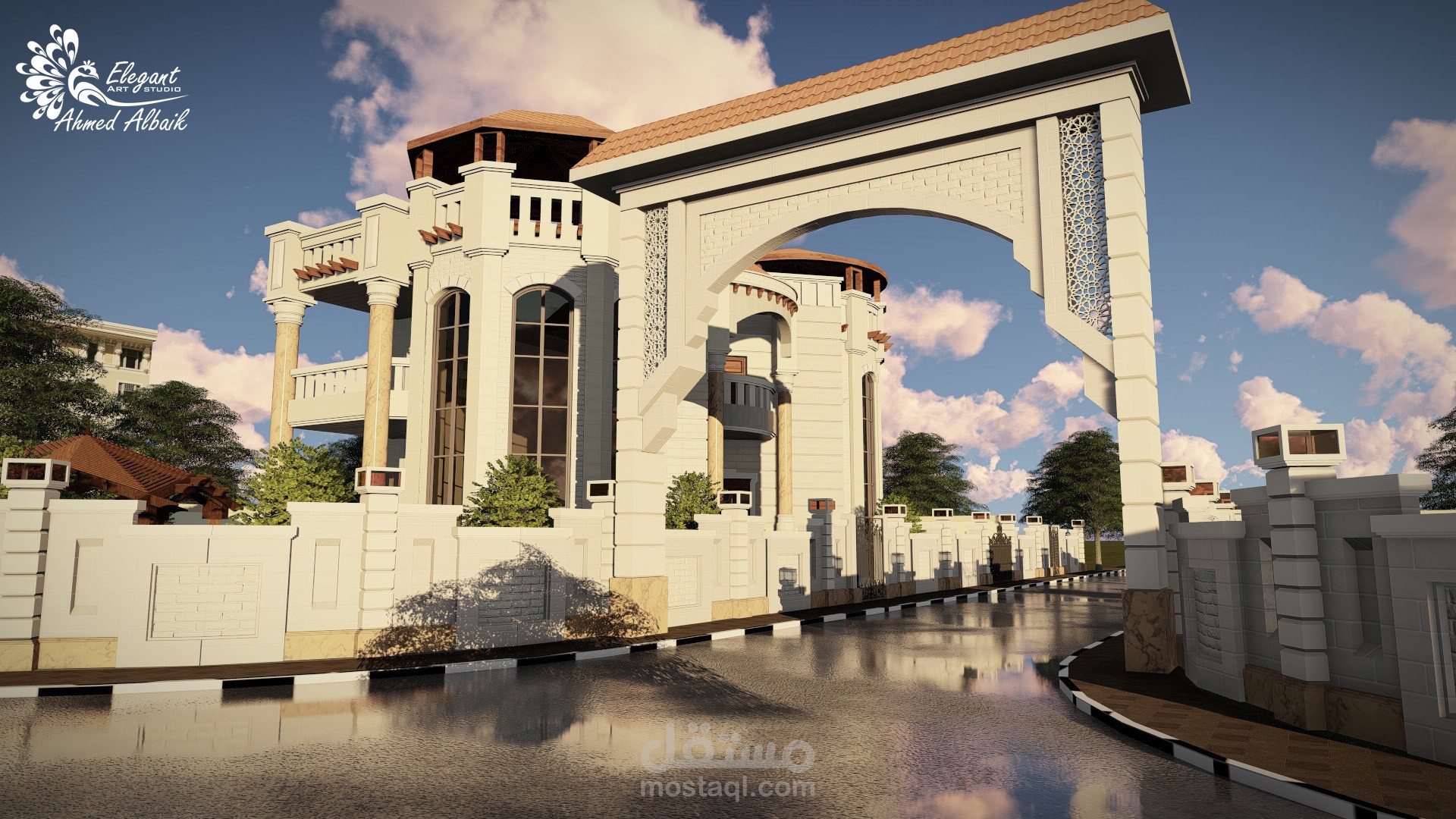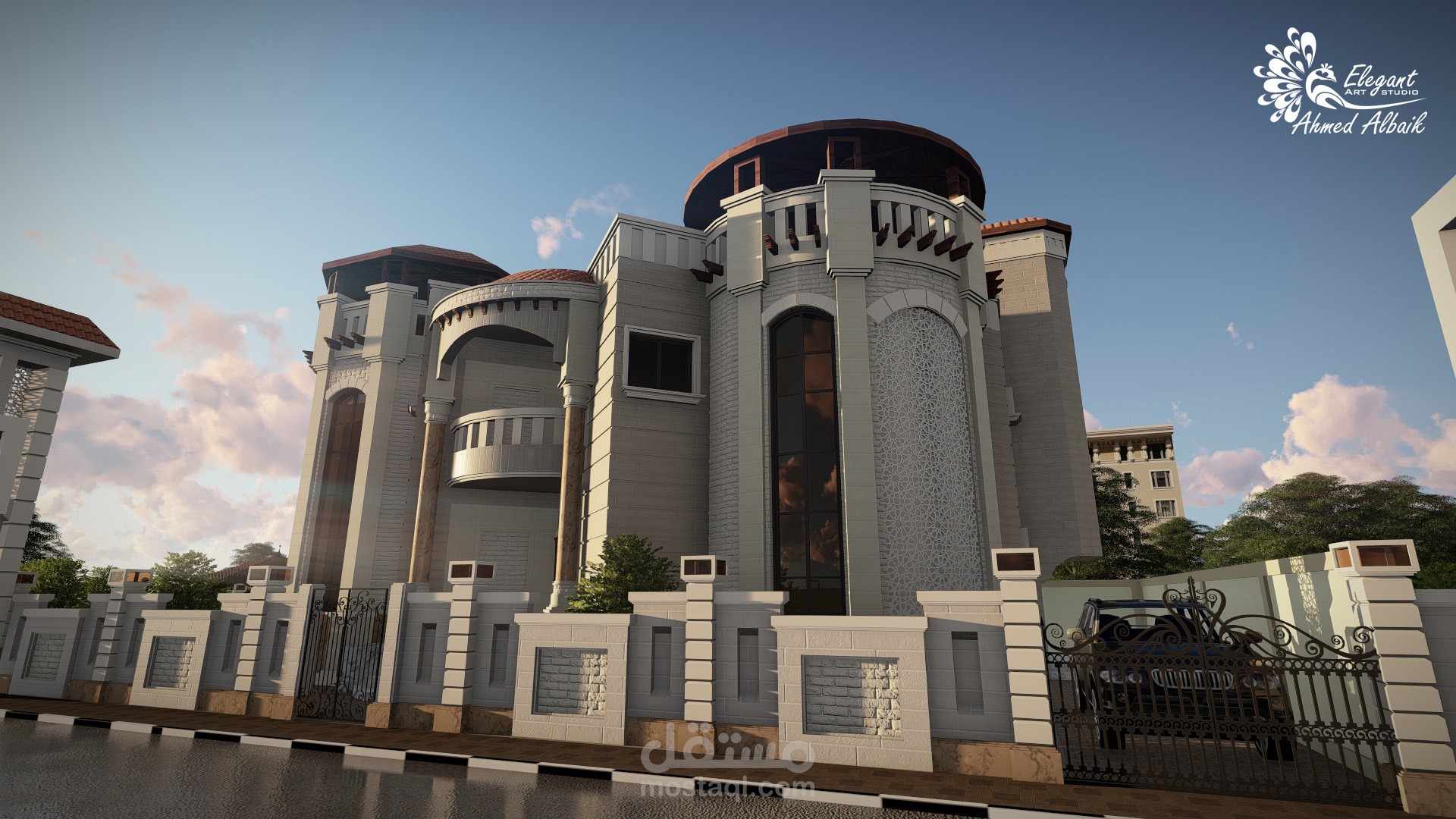 أعمال تصميم بالحجر القدسي مع تدخيل بعض أنواع الرخام ومادة ال GRC في الواجهه