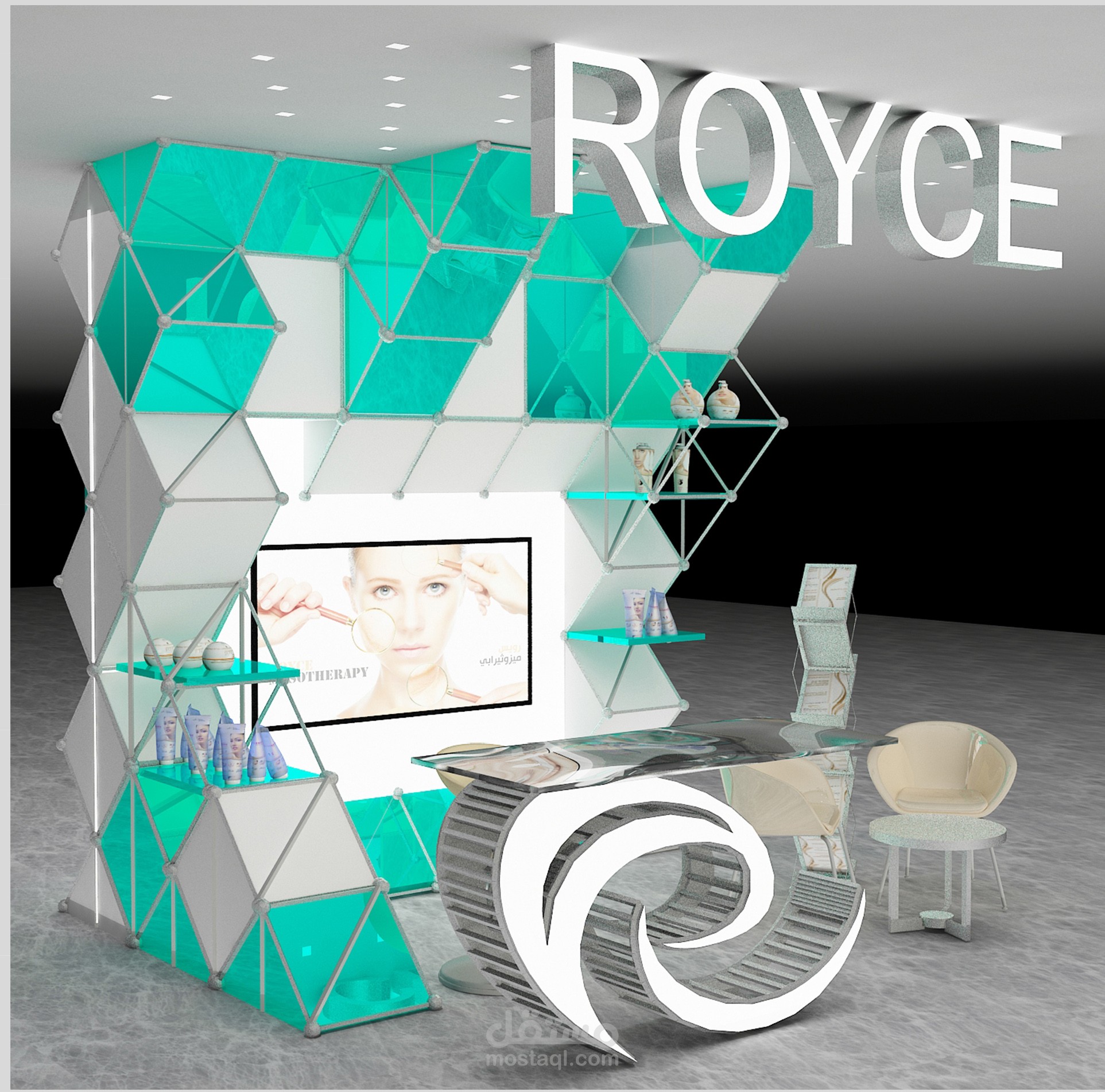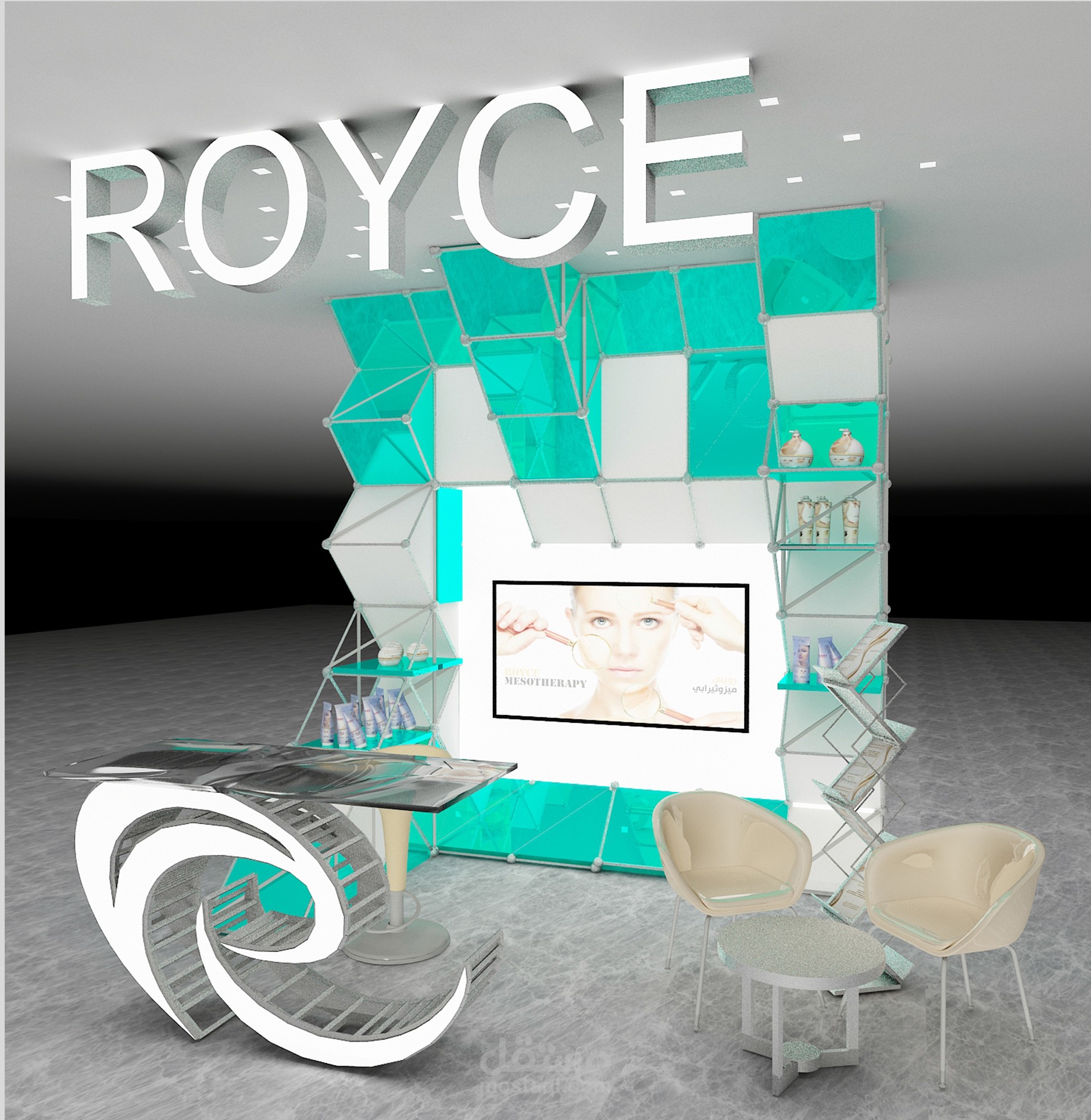 تصميم ثري دي لمقترح كيوسك لعرض منتجات شركة رويس لمستحضرات التجميل بساحة داخلية بمول