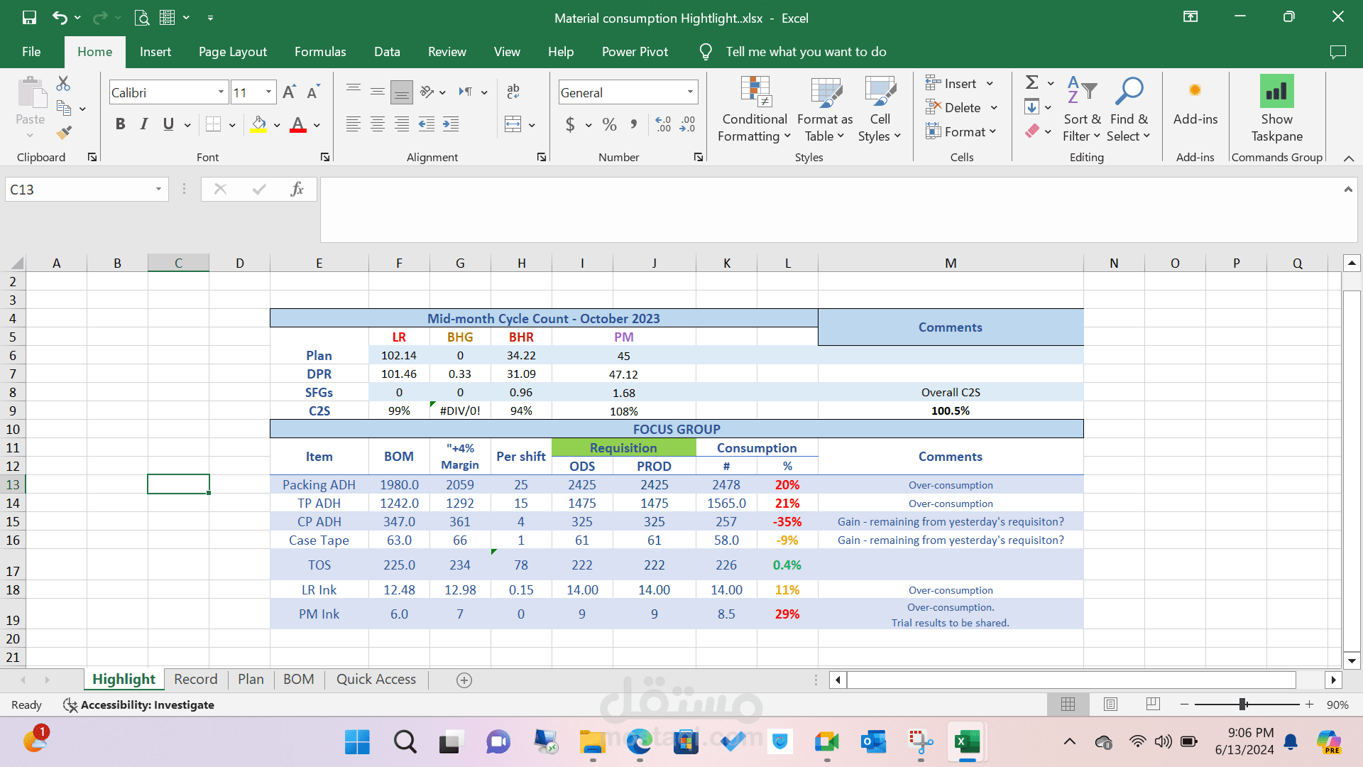 - صيغة الشرطية (Conditional Formatting): استخدمت الصيغ الشرطية لتطبيق الـ Highlight على المواد التي تم استهلاكها بكميات أكبر من المعدلات الطبيعية.