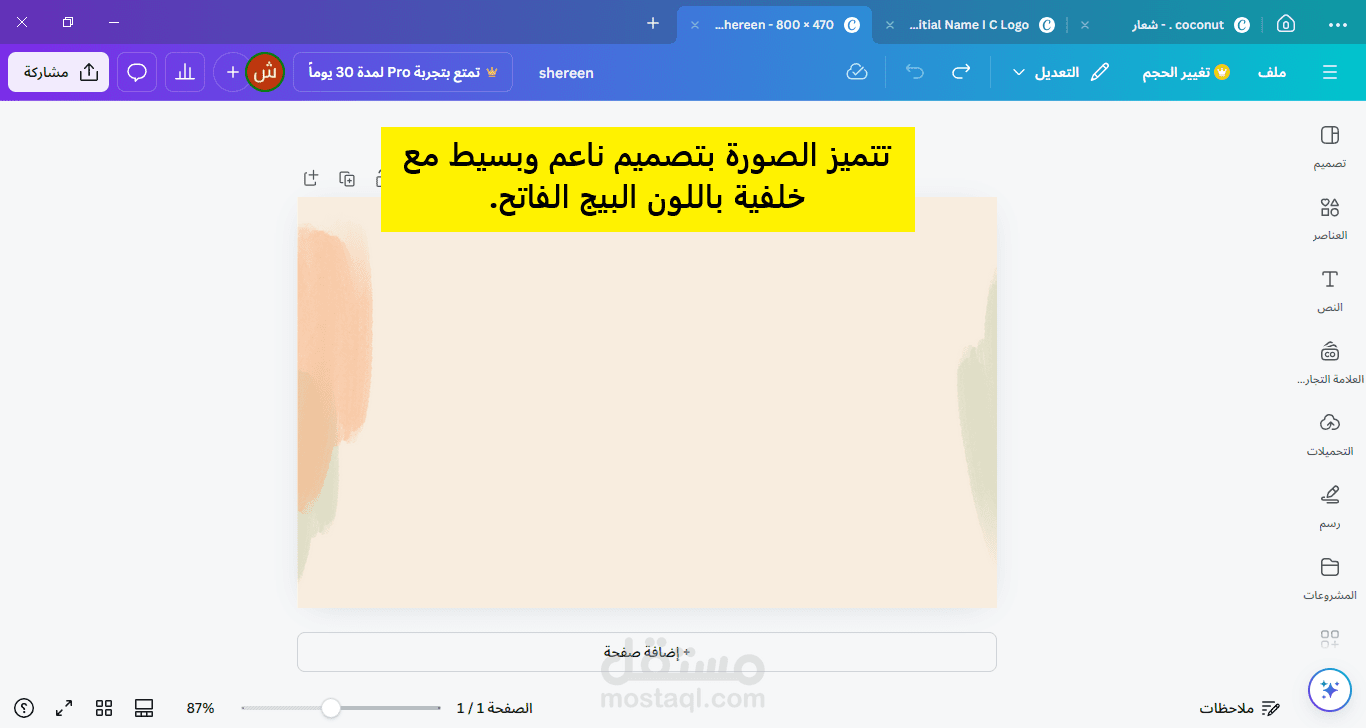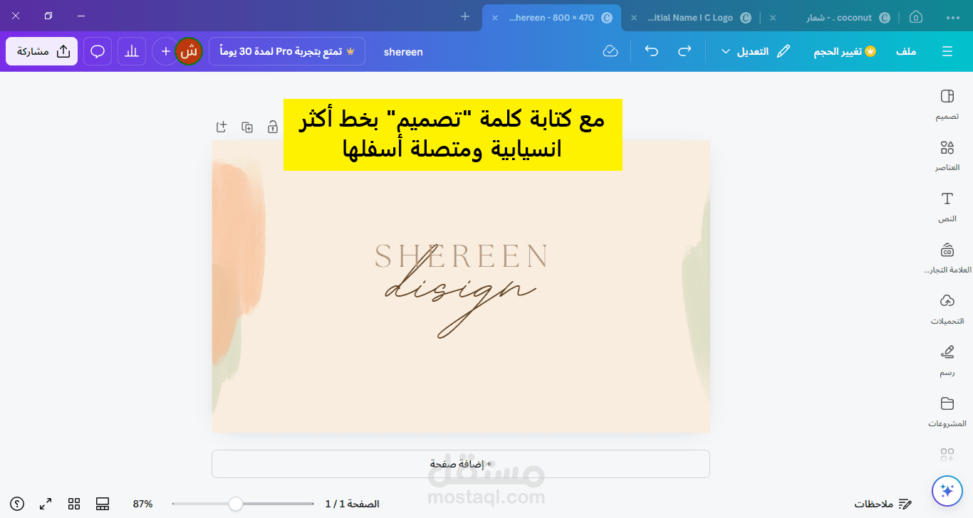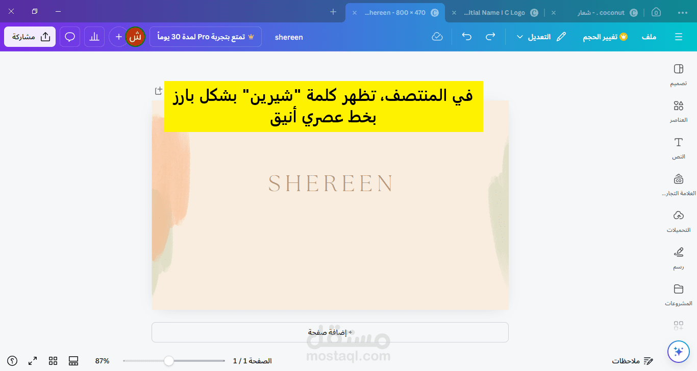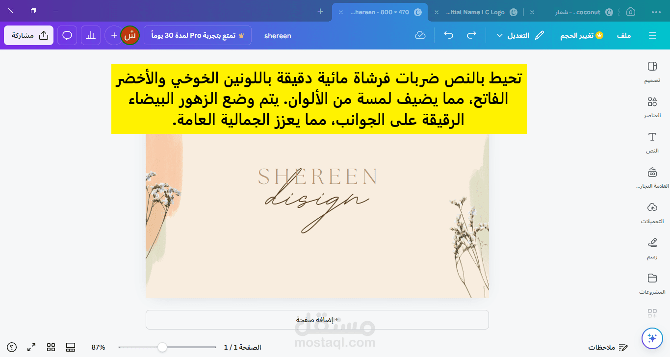 تتميز الصورة بتصميم ناعم وبسيط مع خلفية باللون البيج الفاتح. في المنتصف، تظهر كلمة "شيرين" بشكل بارز بخط عصري أنيق، مع كتابة كلمة "تصميم" بخط أكثر انسيابية ومتصلة أسفلها. تحيط بالنص ضربات فرشاة مائية دقيقة باللونين الخوخي والأخضر الفاتح، مما يضيف لمسة من الألوان. يتم وضع الزهور البيضاء الرقيقة على الجوانب، مما يعزز الجمالية العامة. في الجزء السفلي، تم تضمين عنوان URL لموقع الويب "www.shereenmahmoud.com&qu... مما يقترح موضوعًا شخصيًا أو احترافيًا للعلامة التجارية.
