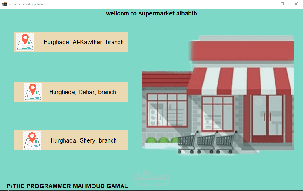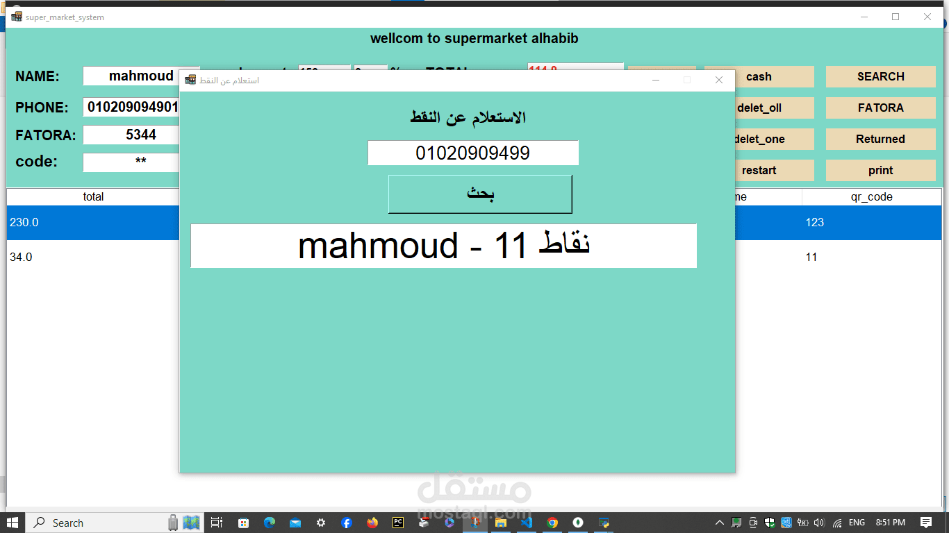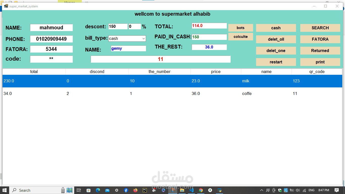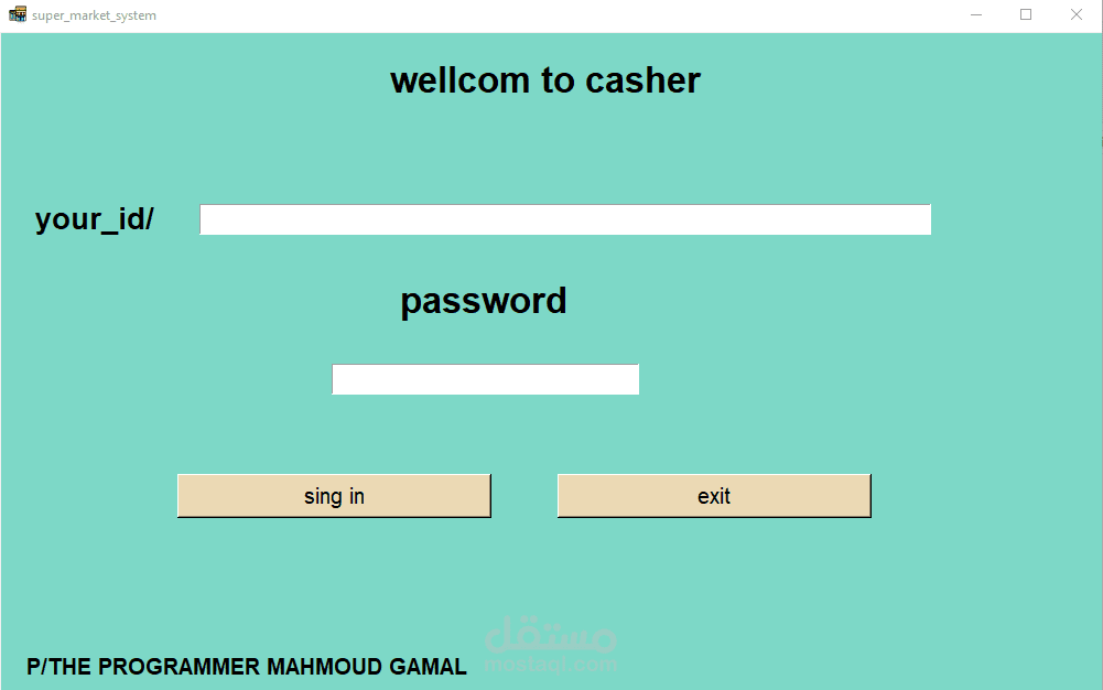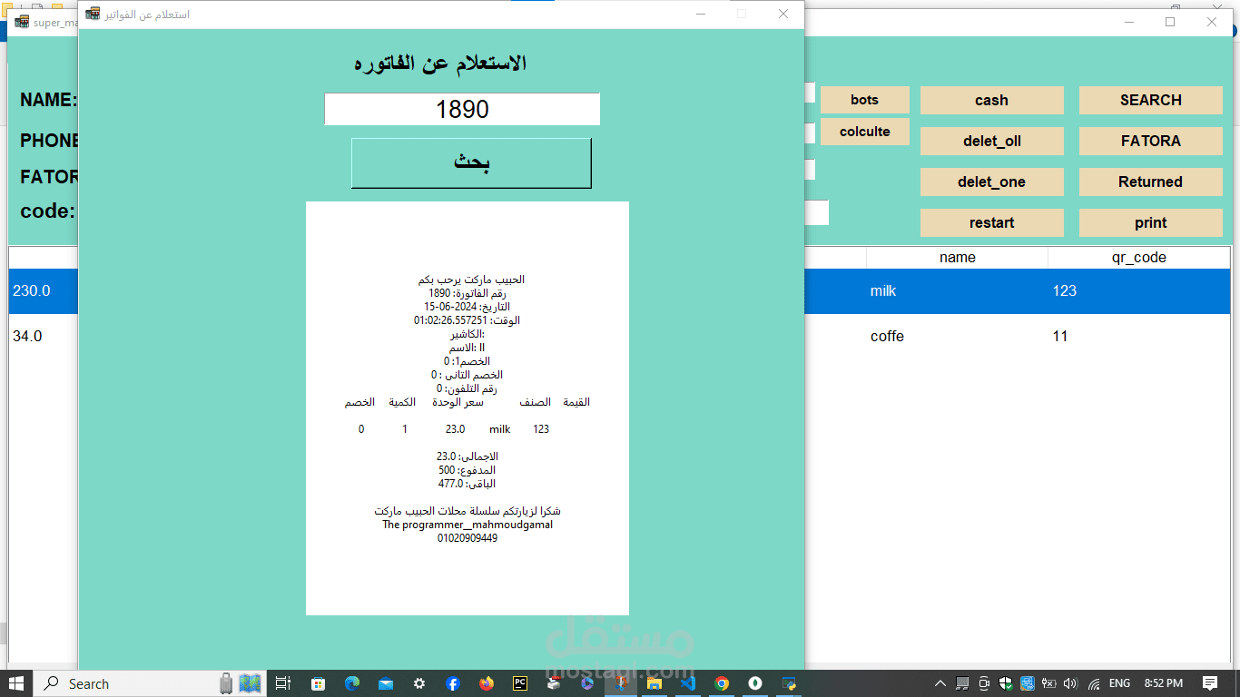 A cashier program for a supermarket. The features of the program are the speed of searching with a barcode in 20 seconds. Secondly, the program is able to monitor the expiry date of all items and send messages with the remaining time for each item. In addition, it monitors the sales movement and the number of items in the supermarket or store and sends messages with the number of items. In addition, it is able to communicate. In many branches around the world, in addition to that, invoices are recorded on the device. In addition, it is able to calculate net profit and expenses. In addition, through it you can monitor the number of workers’ hours. Each buyer is credited with points according to what you specify, and he can pay via money, a visa, or points. In addition, registration is done. Through it, workers add points and profits and monitor everything. It is also divided into 3 sections: the cashier section, the manager, the storeroom, and the branches.