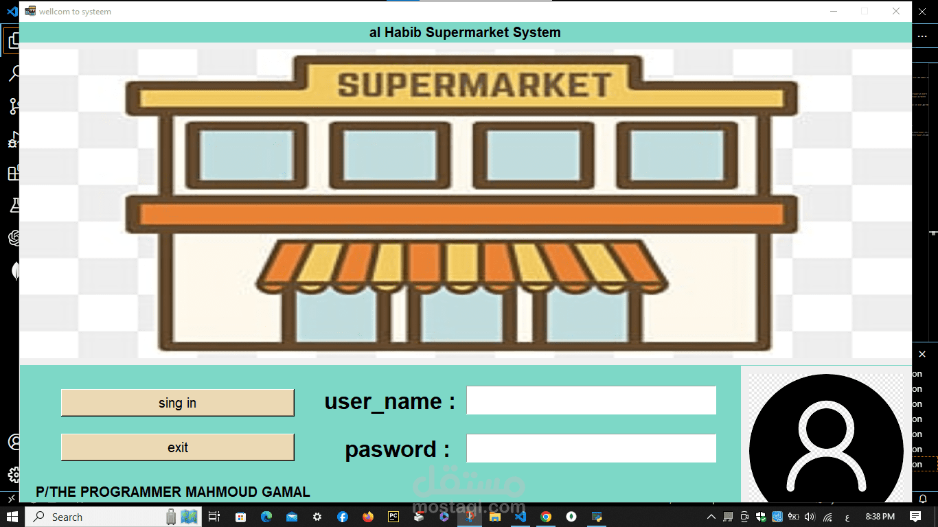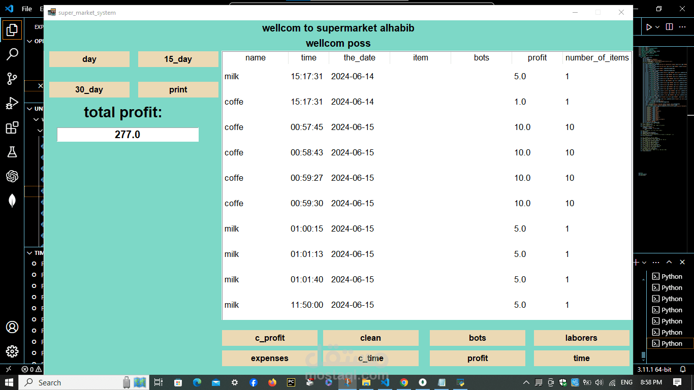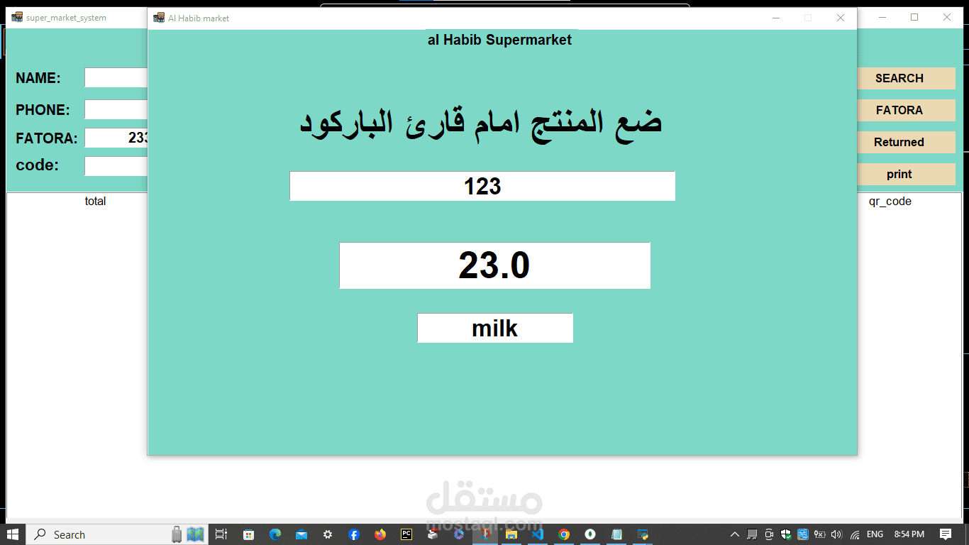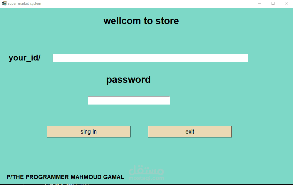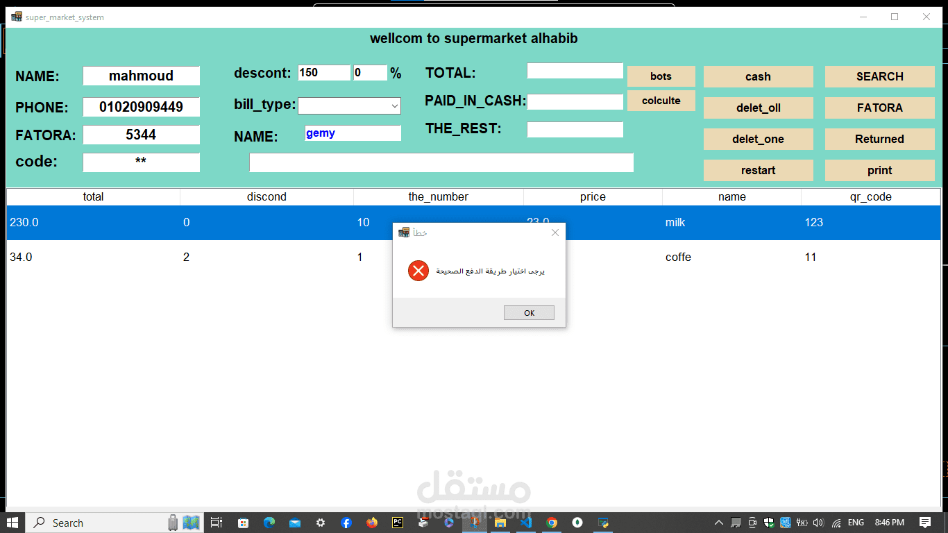 A cashier program for a supermarket. The features of the program are the speed of searching with a barcode in 20 seconds. Secondly, the program is able to monitor the expiry date of all items and send messages with the remaining time for each item. In addition, it monitors the sales movement and the number of items in the supermarket or store and sends messages with the number of items. In addition, it is able to communicate. In many branches around the world, in addition to that, invoices are recorded on the device. In addition, it is able to calculate net profit and expenses. In addition, through it you can monitor the number of workers’ hours. Each buyer is credited with points according to what you specify, and he can pay via money, a visa, or points. In addition, registration is done. Through it, workers add points and profits and monitor everything. It is also divided into 3 sections: the cashier section, the manager, the storeroom, and the branches.