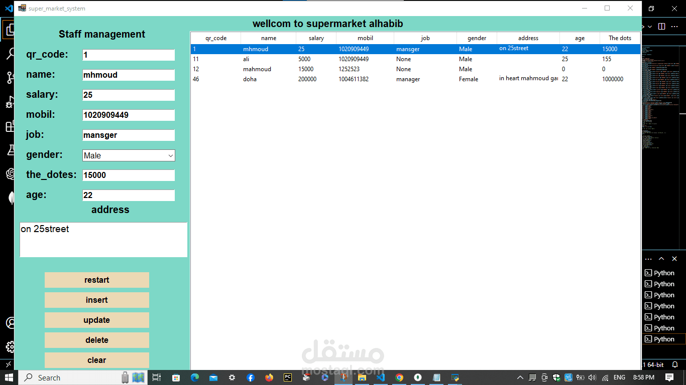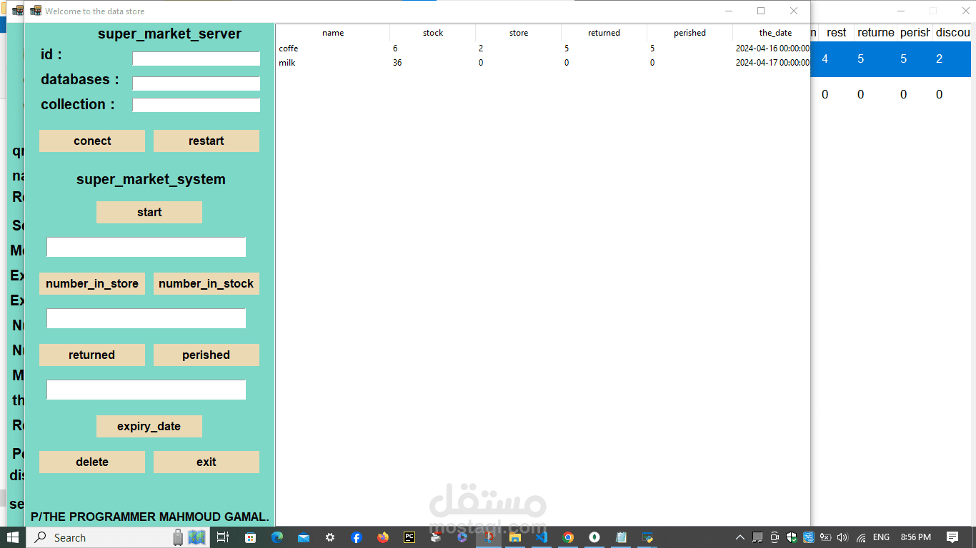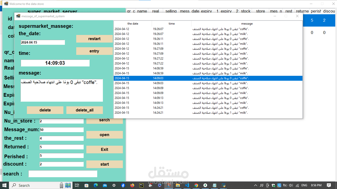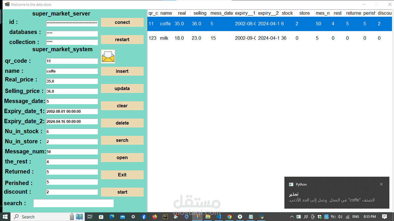 A cashier program for a supermarket. The features of the program are the speed of searching with a barcode in 20 seconds. Secondly, the program is able to monitor the expiry date of all items and send messages with the remaining time for each item. In addition, it monitors the sales movement and the number of items in the supermarket or store and sends messages with the number of items. In addition, it is able to communicate. In many branches around the world, in addition to that, invoices are recorded on the device. In addition, it is able to calculate net profit and expenses. In addition, through it you can monitor the number of workers’ hours. Each buyer is credited with points according to what you specify, and he can pay via money, a visa, or points. In addition, registration is done. Through it, workers add points and profits and monitor everything. It is also divided into 3 sections: the cashier section, the manager, the storeroom, and the branches.