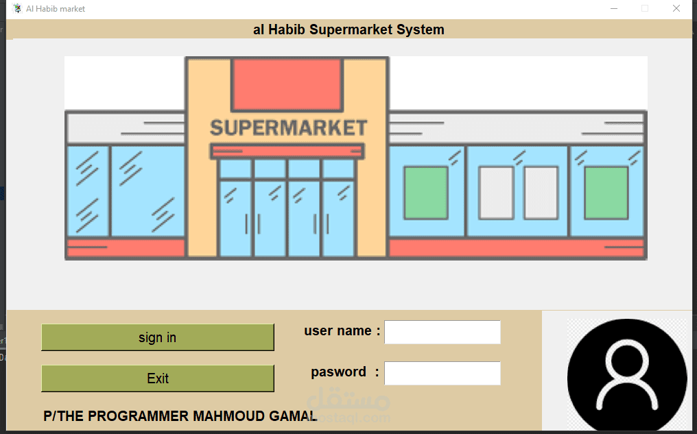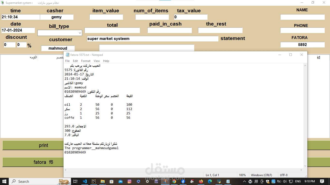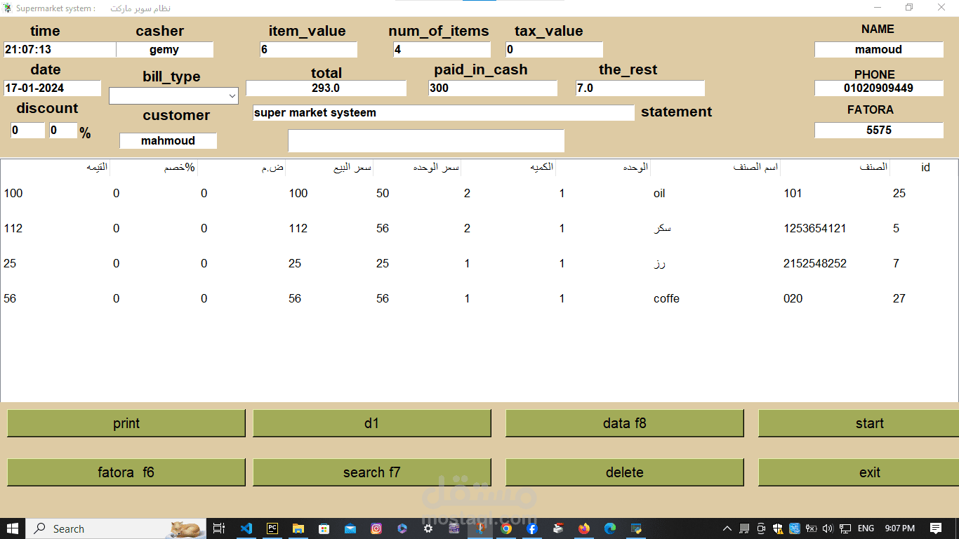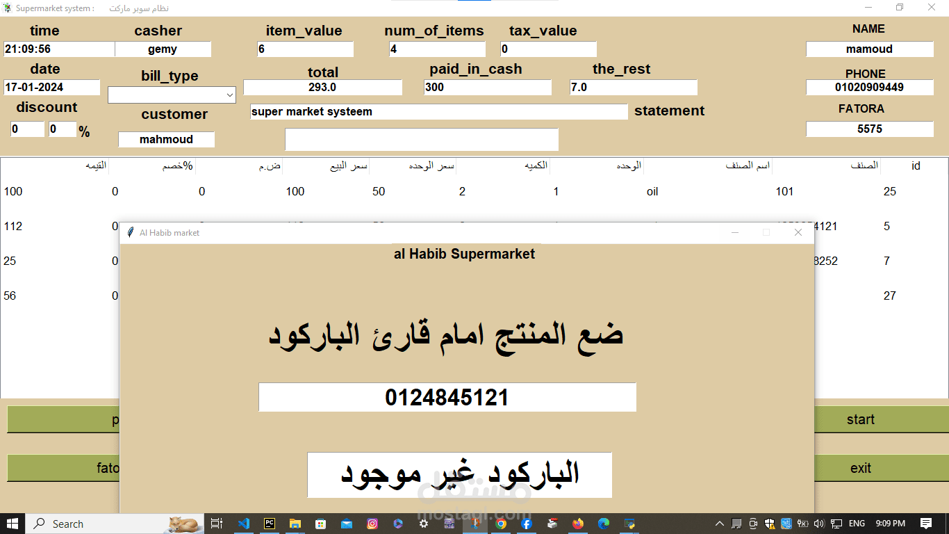 A supermarket cashier program that is distinguished by the fact that the speed of searching for a product is 0.5 milliseconds. In addition, it is possible to calculate the net profit and expenses through it. It is distinguished by the fact that it performs a first-hand inventory of the products and calculates the number of products today and for a month.