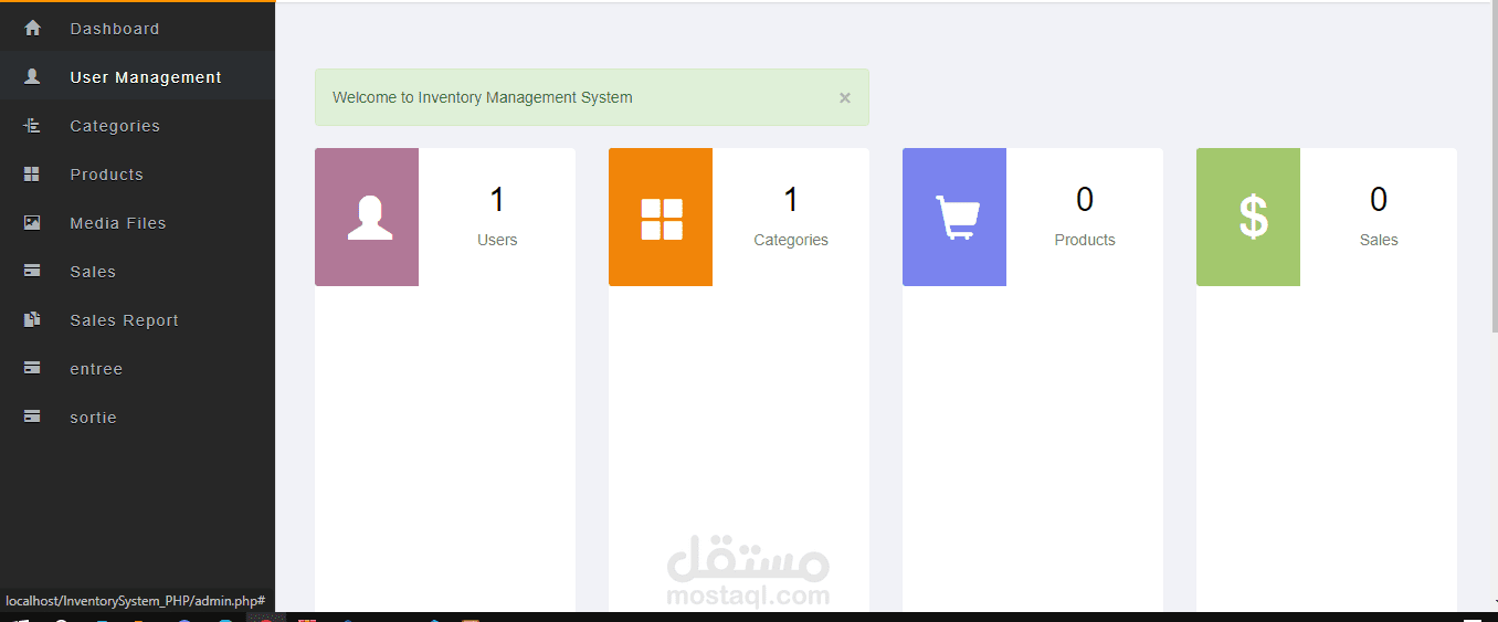Un tableau de bord avec des cartes (cards) qui affichent des statistiques importantes telles que le nombre d'utilisateurs, de catégories, de produits et de ventes.