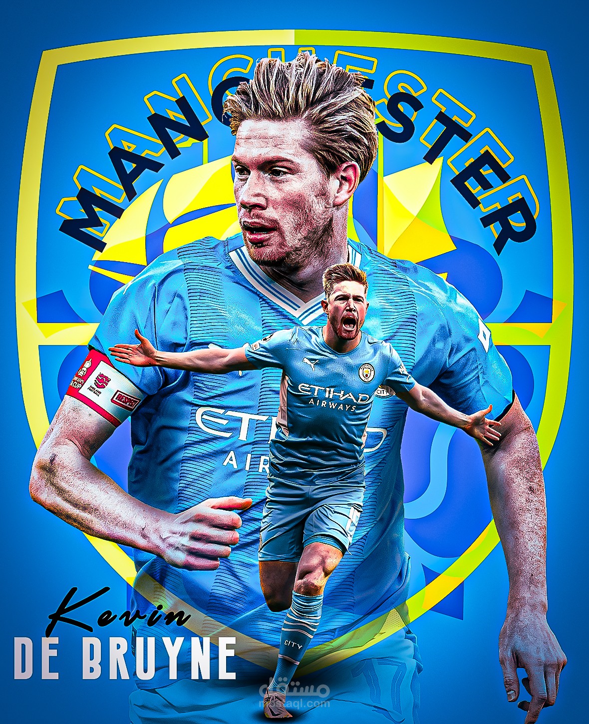 البوستر ككل يعكس احترافية في التصميم ويجذب الأنظار من خلال استخدام الألوان والتفاصيل المتقنة، مما يجعله قطعة فنية تليق بلاعب مميز مثل كيفين دي بروين وبنادي عريق كمانشستر سيتي.
