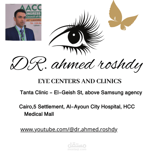 اعلان لعيادة عيون الخاصة بالدكتور احمد رشدى ويظهر فى الاعلان صورة للدكتور احمد وعنوان المركز الرئيسى والمركزالفرعى ووسيلة التواصل وموقع الدكتور على اليوتيوب