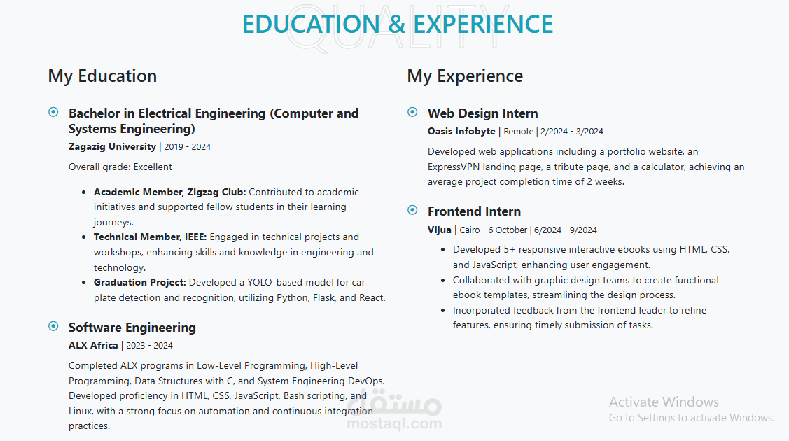 Skills: Showcases my technical proficiencies with icons and progress bars to represent skill levels.