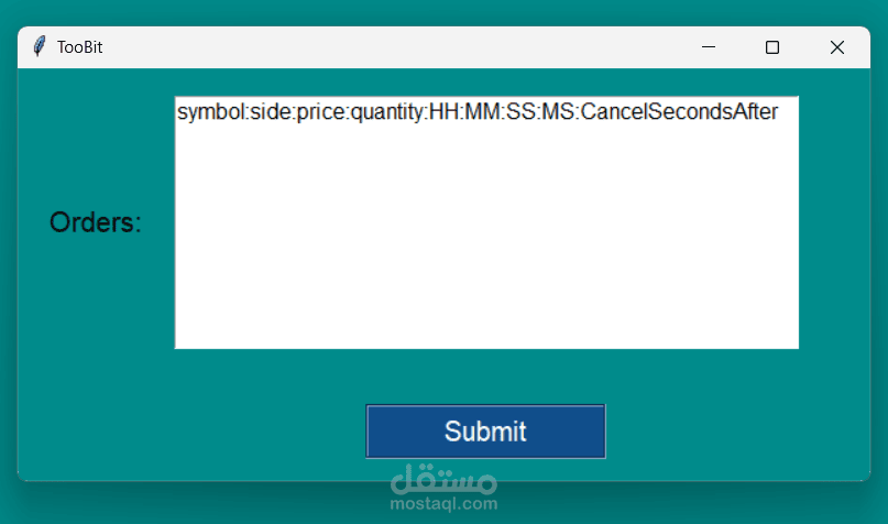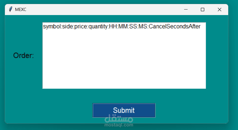 البرنامج تم تنفيذه لأخذ اوردر او اكثر لتنفيذه في وقت محدد في خلال اليوم (بالمايكرو ثانية) ، يأخذ منك بيانات الطلب المراد تنفيذه واذا كنت تريد إلغاءه بعد عدد من الثواني ايضا يجعلك تعطيه عدد الثواني لكي يقوم بالالغاء بعدهم