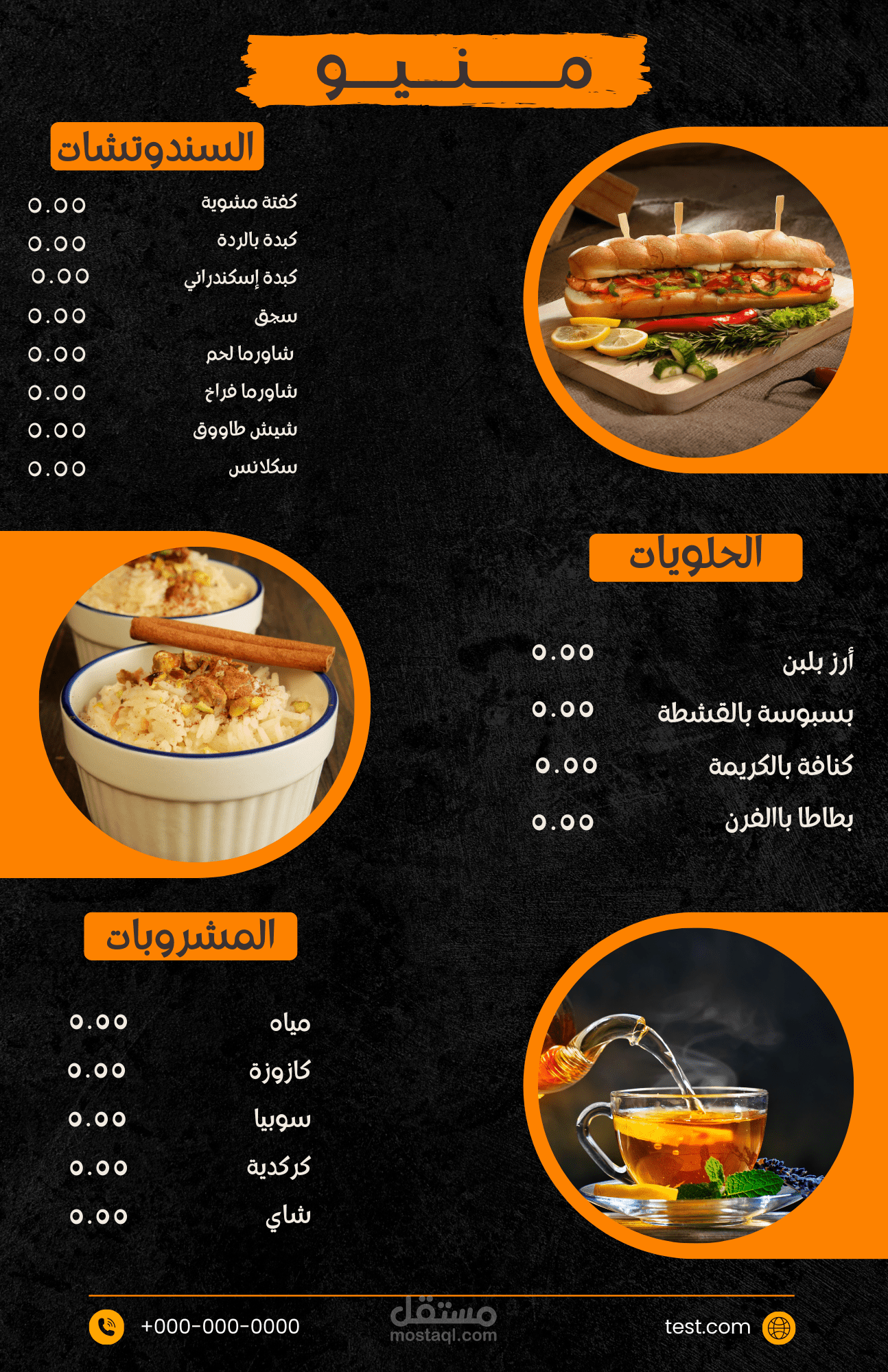 - **الحلويات:** أرز بلبن، بسبوسة بالقشطة، كنافة بالكريمة، بطاطا بالفرن.
