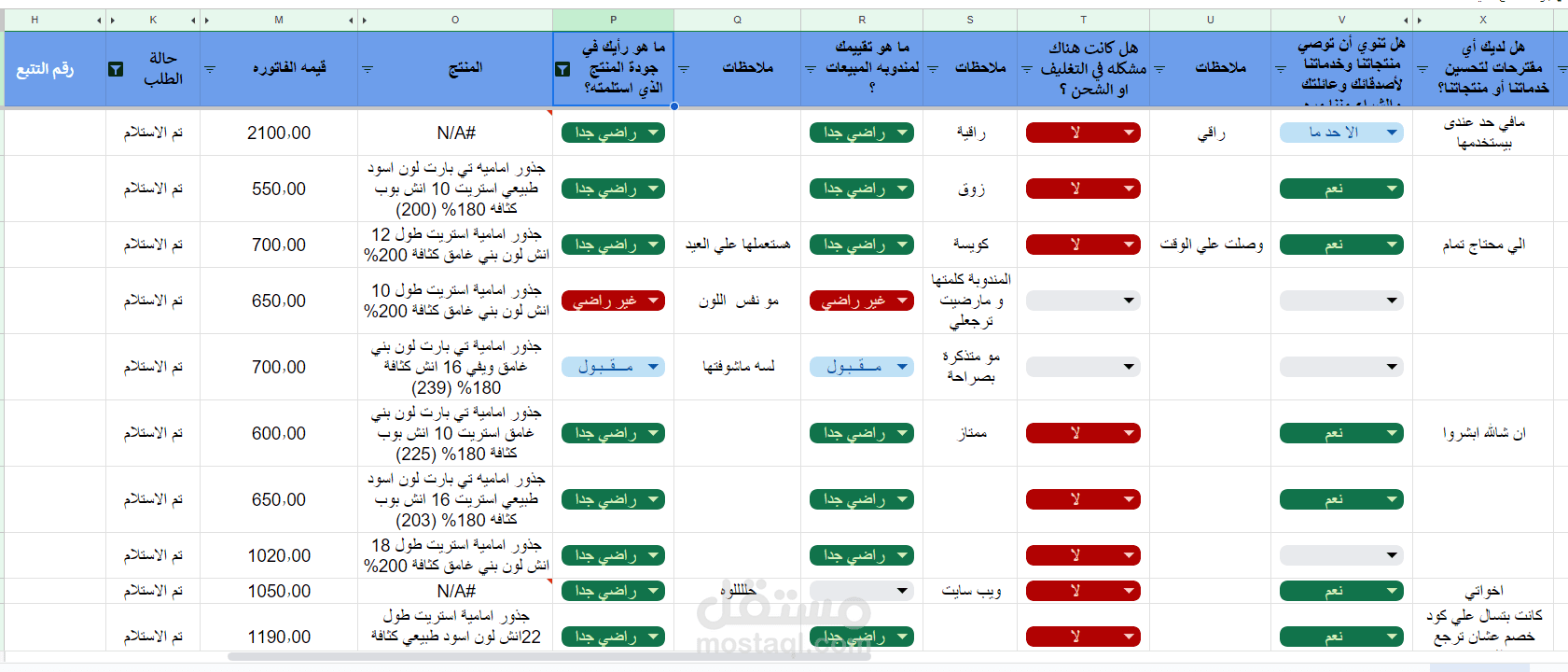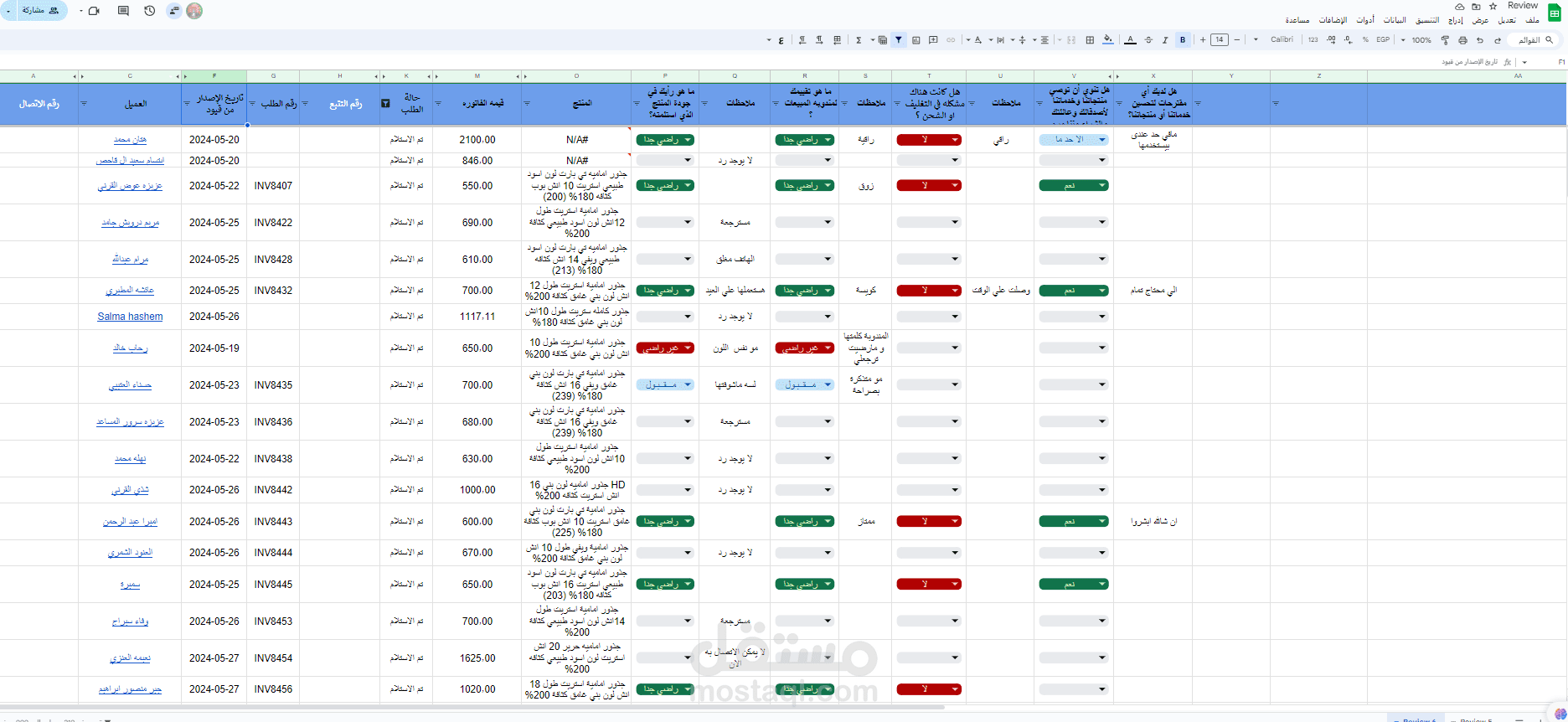 شيت فيه اسم ورقم العميل والوصف الخاص بالفواتير يسمع تلقائيا هذه البيانات من شيت اخر خاص بفواتير البيع وعند استلام هذه الطلبات من قبل العملاء تظهر ف هذا الشيت للموظف المسئول عن اخذ الريفيوا الخاص بالعميل لادخال هذه الريفيوهات لقياس اداءالشركه وقياس اداء مندوب البيع مع العملاء ومربوط يظهر تلقائيا ف شيت ال KPIS الخاص باداء مناديب البيع