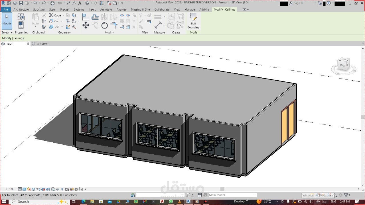 تصميم النموذج الثلاثي الأبعاد في Revit مع إضافة التفاصيل المعمارية مثل الجدران، النوافذ، والأبواب.