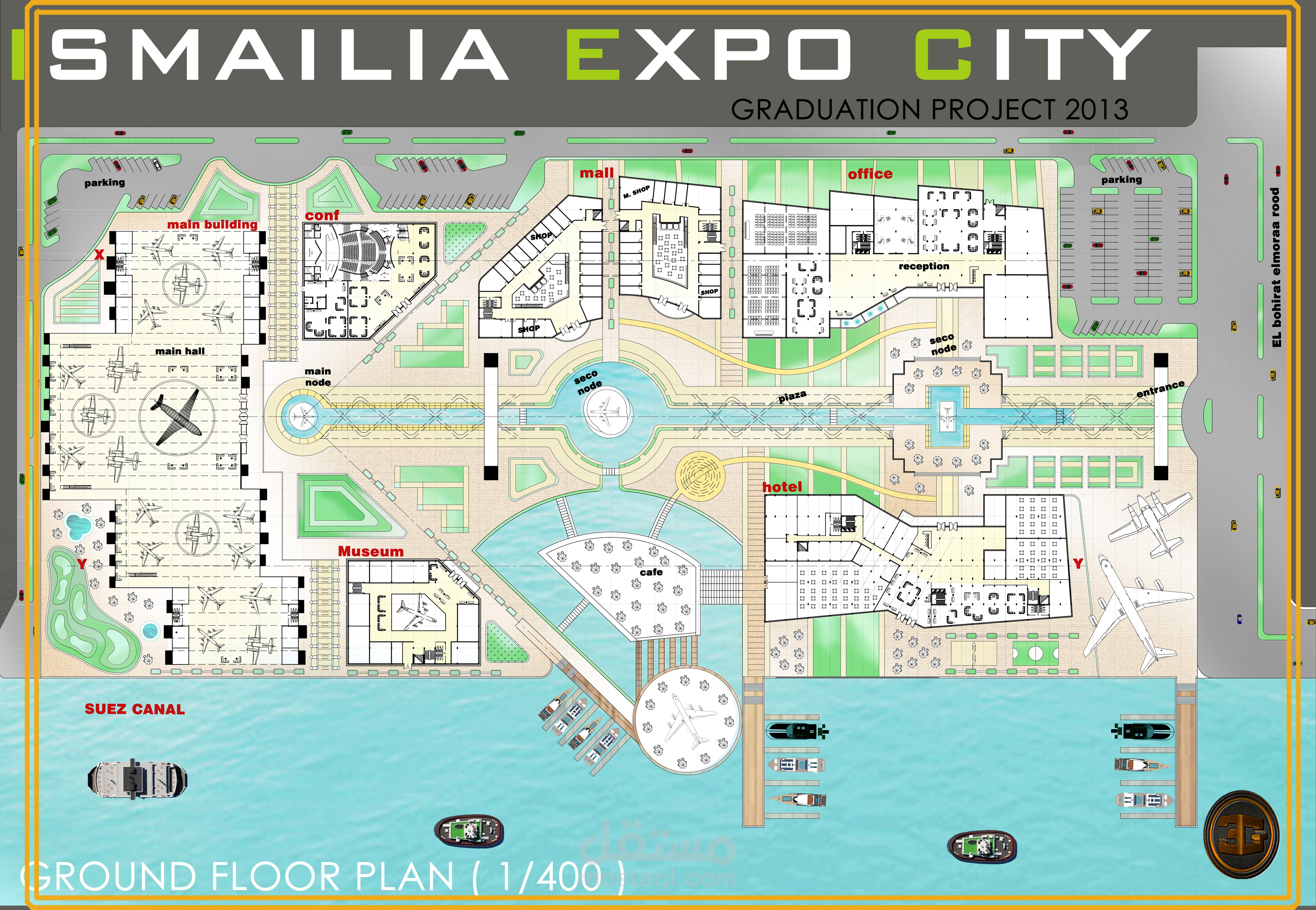 تصميم مخطط لمدينة معارض خاصة للطائرات بما تحتوية من معرض للطائرات وبمنى ادارى ومتحف وفندق ومول وكافيهات وبلازا وسط الماء