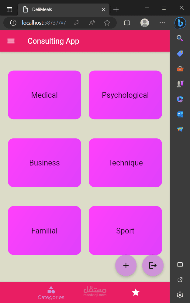 ينتقل بعدها الى الشاشة الرئيسيَّة التي تحتوي على تصنيفات الخبراء، وزر تسجيل الخروج بالإضافة إلى زر إضافة خبير والذي لا يظهر الا اذا قمت بتسجيل الدخول كخبير، وأيضاً تحوي Tap Bar و Drawer.