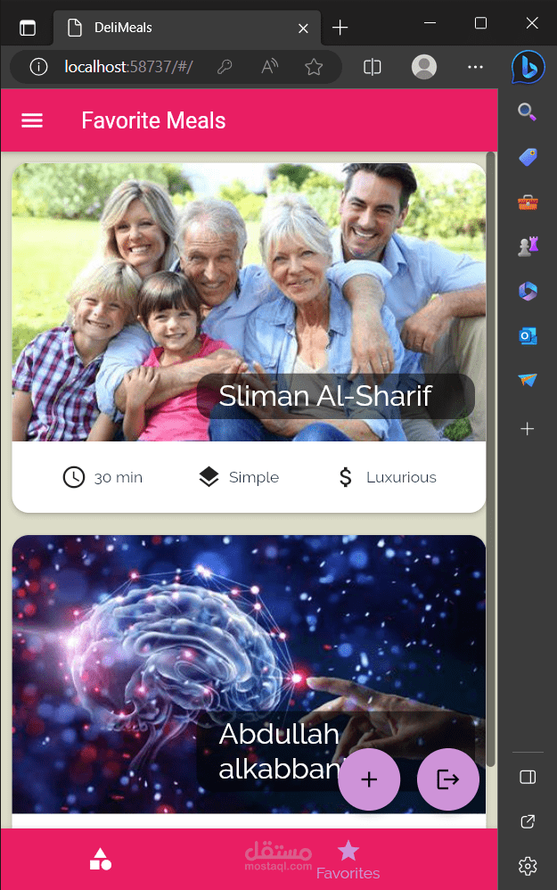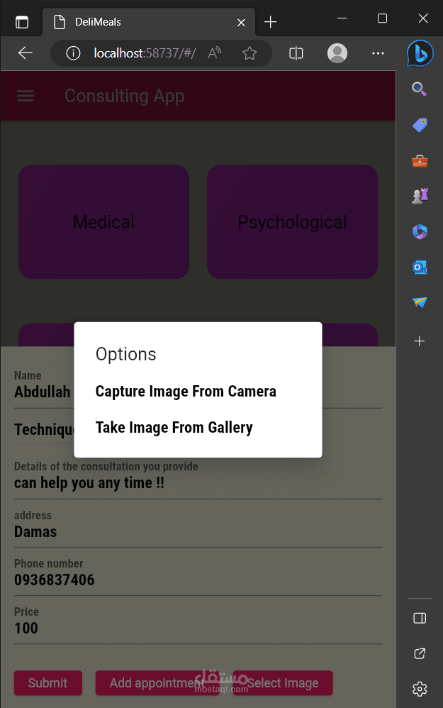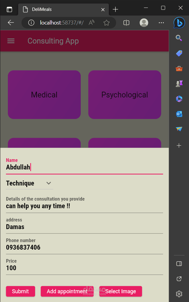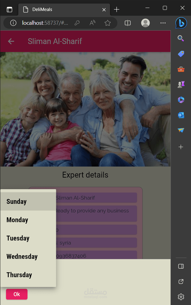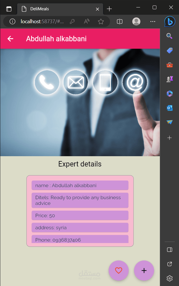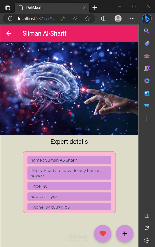 زر إضافة الخبير يتيح للخبير إدخال تفاصيل خدماته: الاسم ، تصنيف الخبرة (علمي، نفسي، رياضي ...) بواسطة Drop Button، وإدخال تفاصيل الخدمة التي يقدمها، وكلفة الخدمة. بالإضافة االى قدرته على تحديد مواعيد دوامه الأيام والساعات باستخدام Multiselect، ويستطيع أيضاً إضافة صورته وإلا تأخذ قيمة أفتراضيَّة حاصَّة بكل تصنيف.