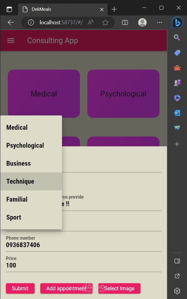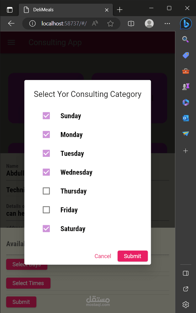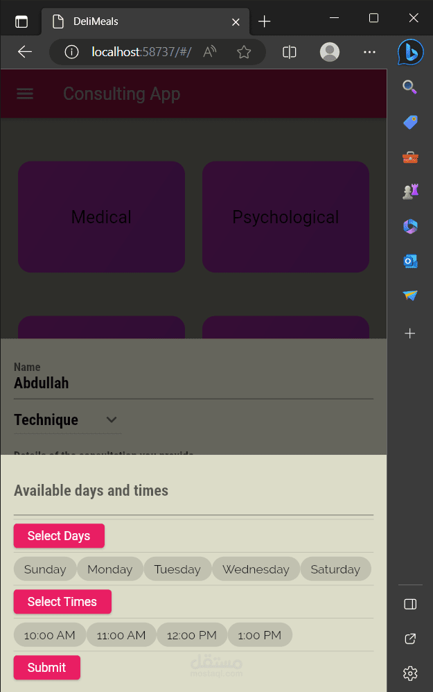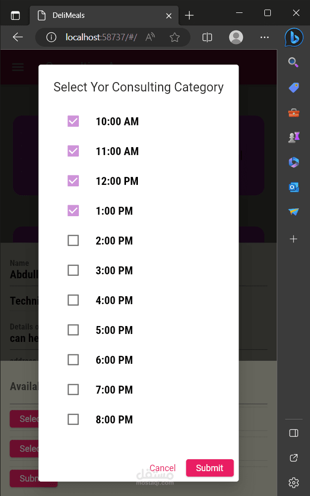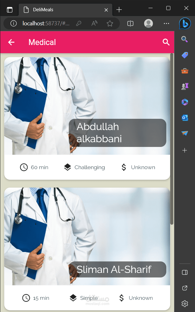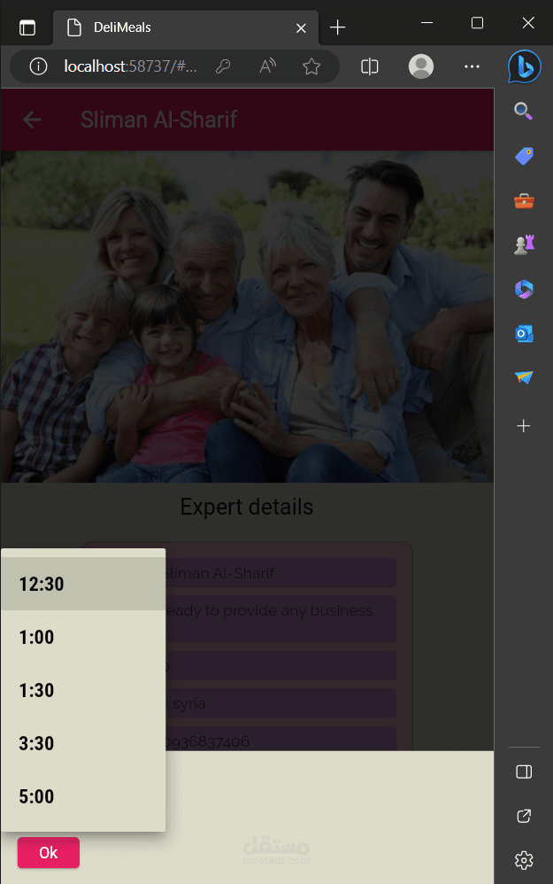 عند أختيار تصنيف ما تظهر للمستخدم لائحة الخبراء ضمن هذا التصنيف وتفاصيل عامَّة عنهم كسعر الخدمة والاسم والصورة بواسطة Card. عند الضغط على خبير تظهر الشاشة المخصصة له فيها كافَّة تفاصيله بالإضافة إلى وجود زرين أحدهم لإضافة الى المفضلة لضمان سهولة الوصول له والآخر لحجز موعد ضمن المواعيد المتاحة. عندما يختار المستخدم حجز موعد يظهر له الأيام المتاحة وعند اختيار اليوم تظهر له الساعات المتاحة مقسمة على نصف ساعة وفي حال كان الوقت محجوز مسبقاُ من شخص آخر لا يظهر ضمن القائمة.