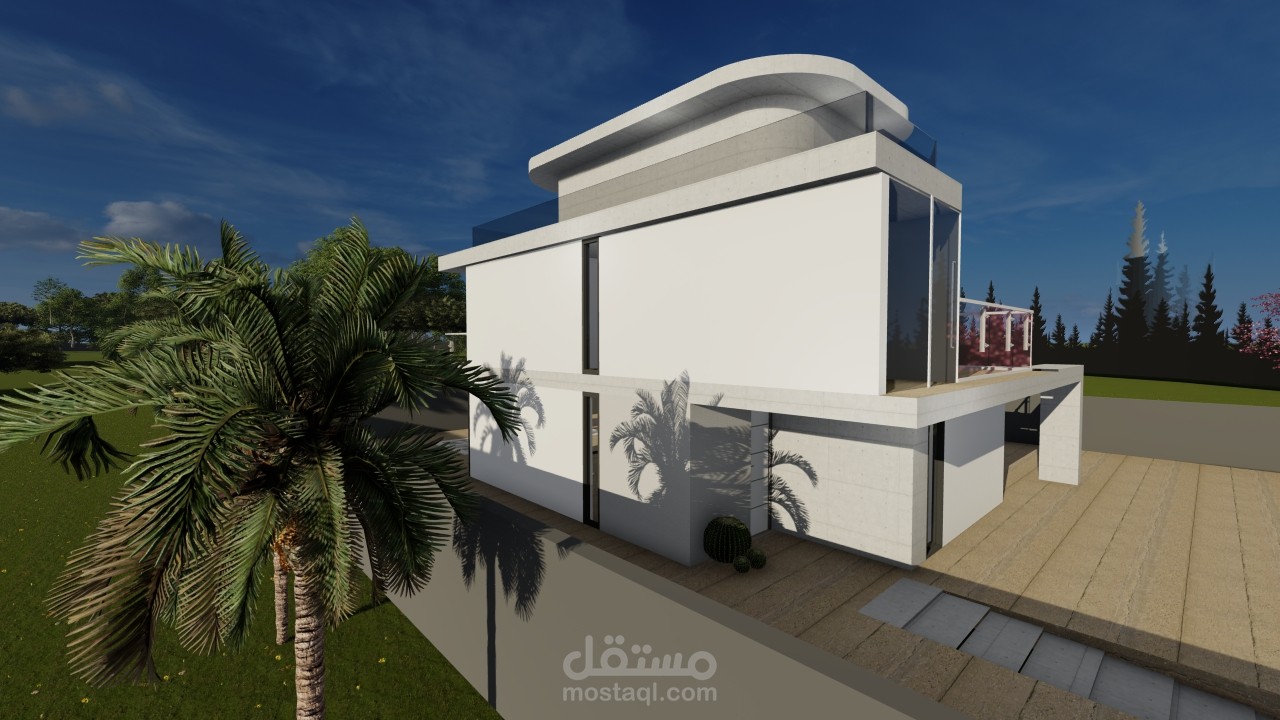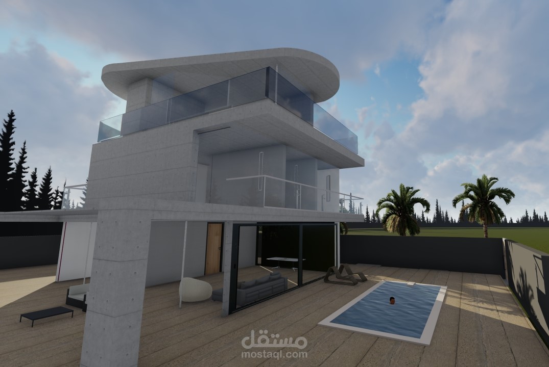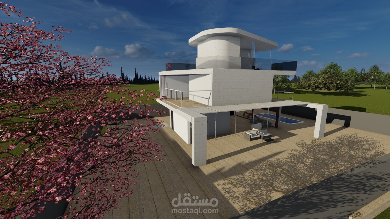 the first step i did the house in sketchup then i put the material and explode the file from sketchup to lumion to render it and put trees and furniture and i take shots from another direction and downlode also i make an animation video by shots in lumion