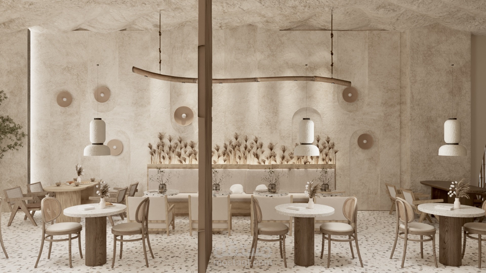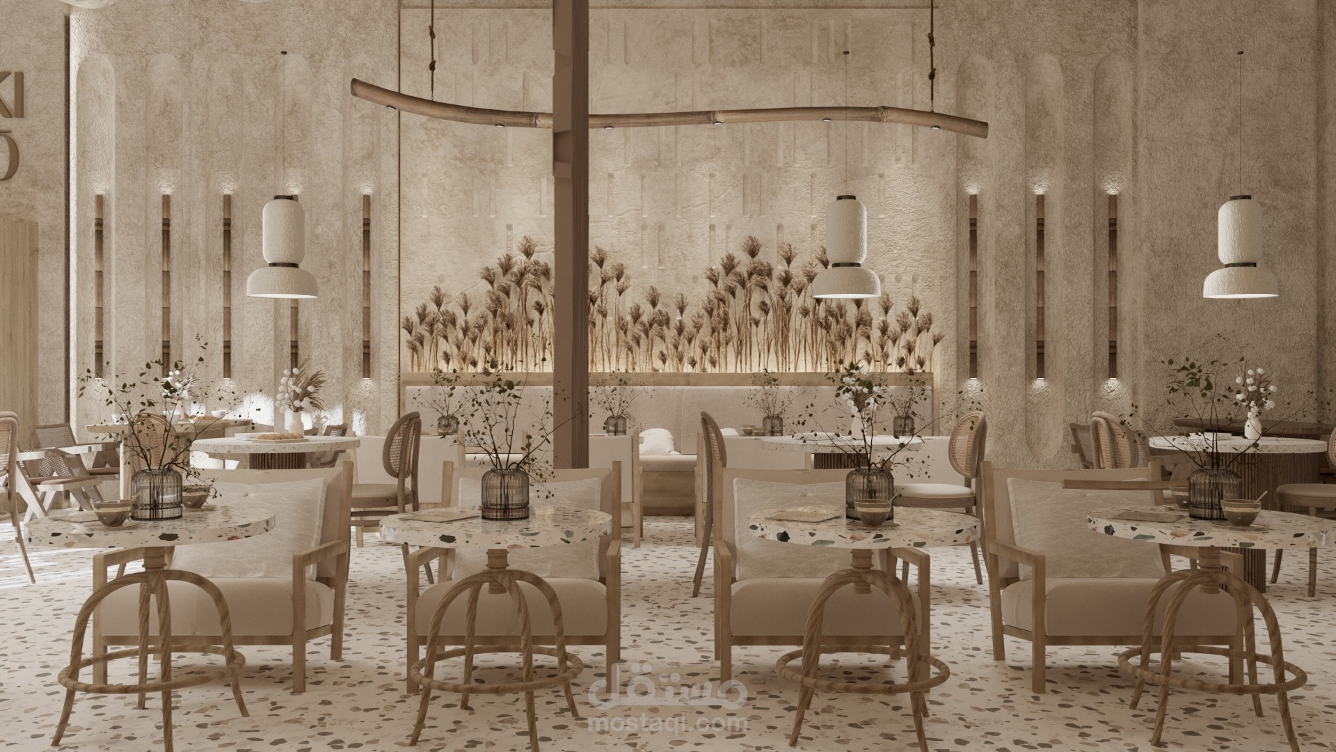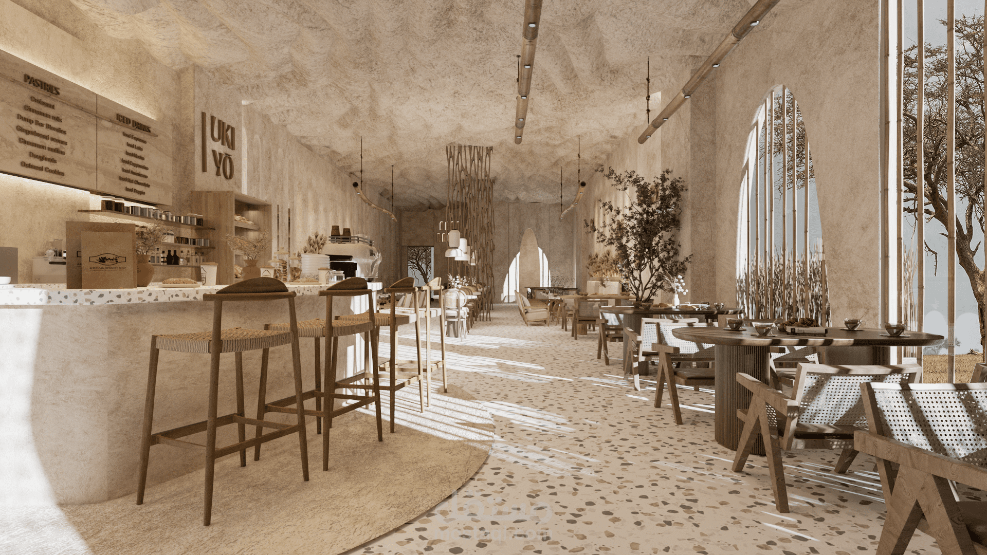 كان من طلبات العميل ان يكون المقهى و كأنه حزءا من الطبيعه .. و يبعث الراحة و الطمأنينة في نفوس الزائرين .. و لذلك تم اختيار طراز ال Japandi نظرا لمطابقة صفاته مع طلبات العميل، بداية من الالوان الهادئة المقتبسه من الارض .. و الخامات الطبيعية و كذلك ايضا الاضاءه الطبيعيه.