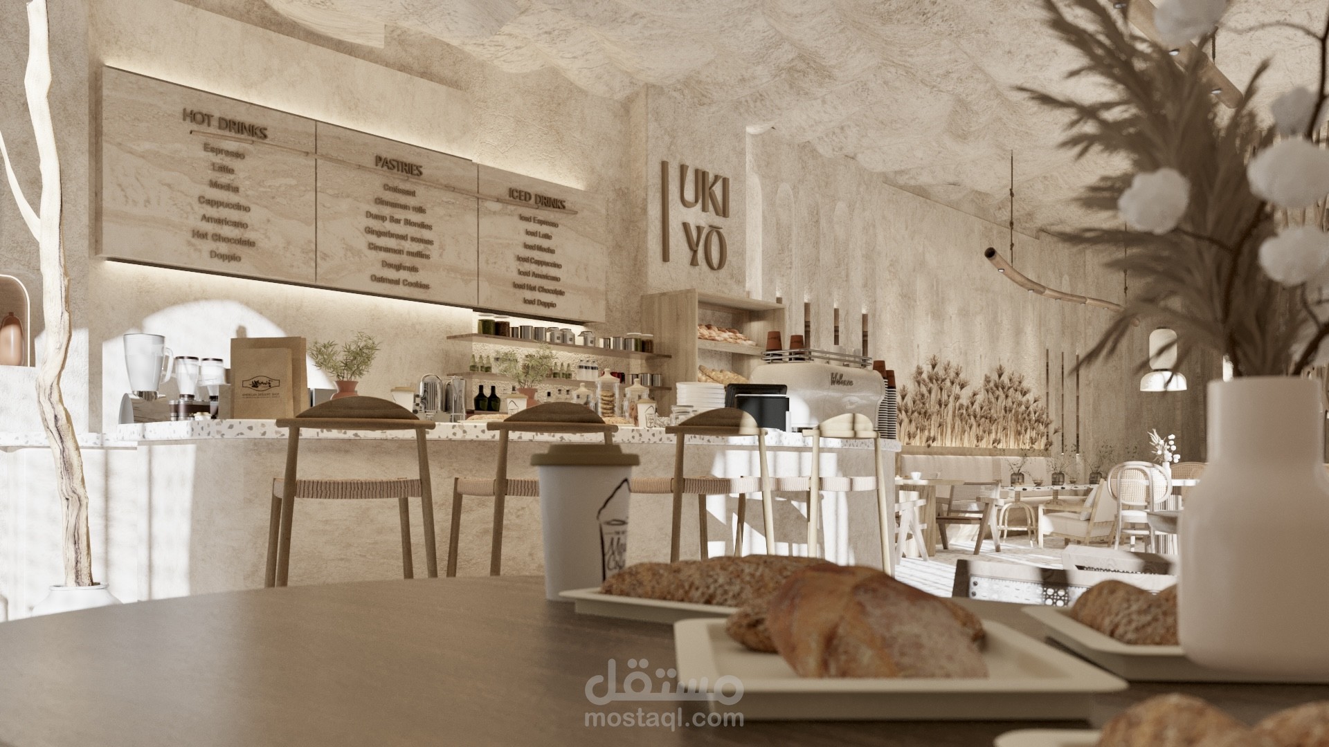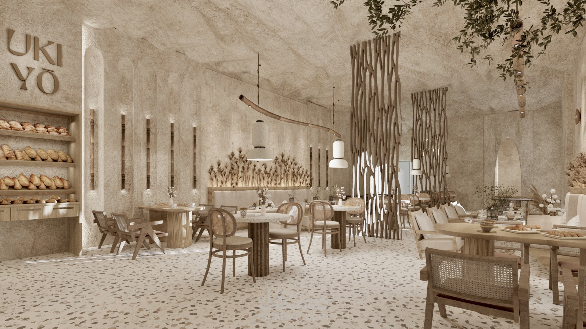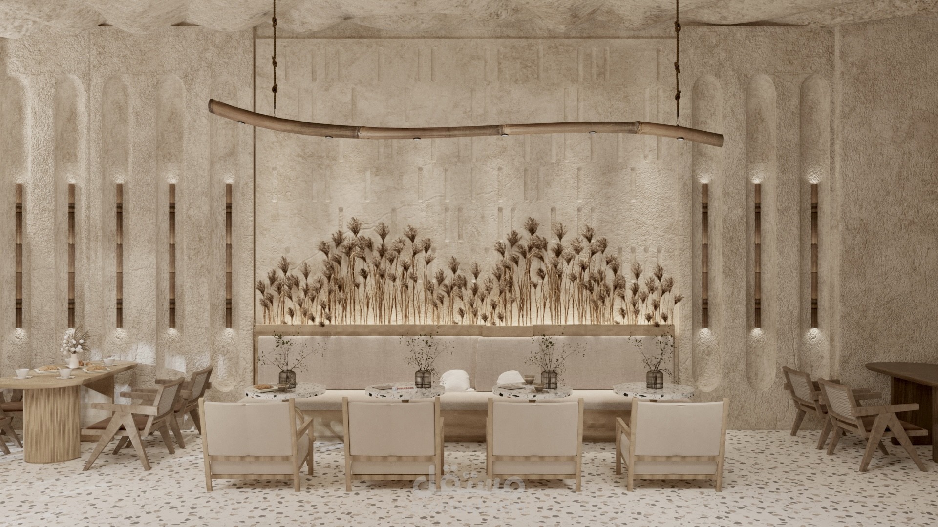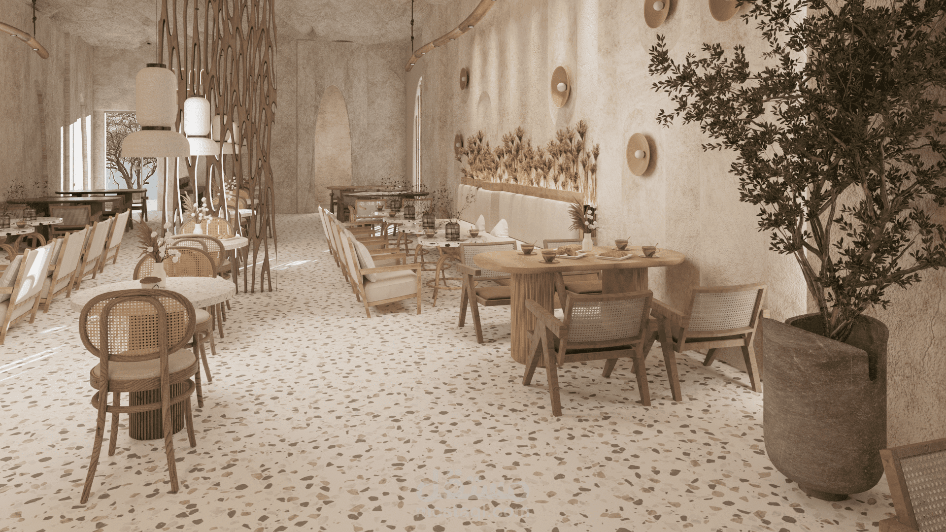 كان من طلبات العميل ان يكون المقهى و كأنه حزءا من الطبيعه .. و يبعث الراحة و الطمأنينة في نفوس الزائرين .. و لذلك تم اختيار طراز ال Japandi نظرا لمطابقة صفاته مع طلبات العميل، بداية من الالوان الهادئة المقتبسه من الارض .. و الخامات الطبيعية و كذلك ايضا الاضاءه الطبيعيه.