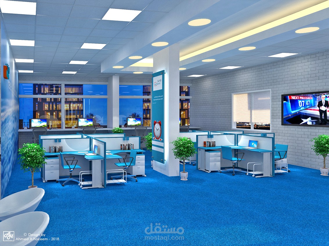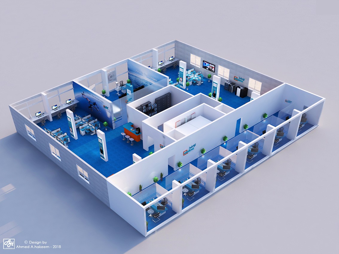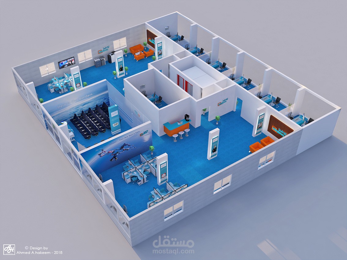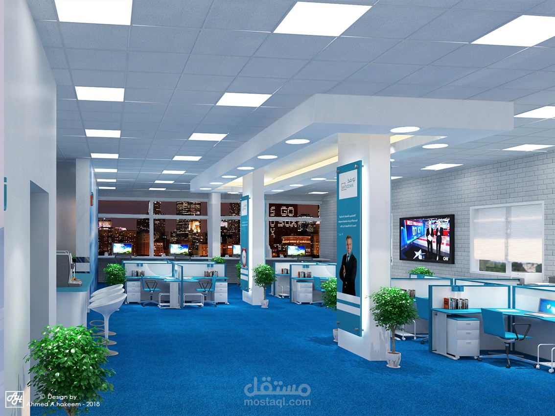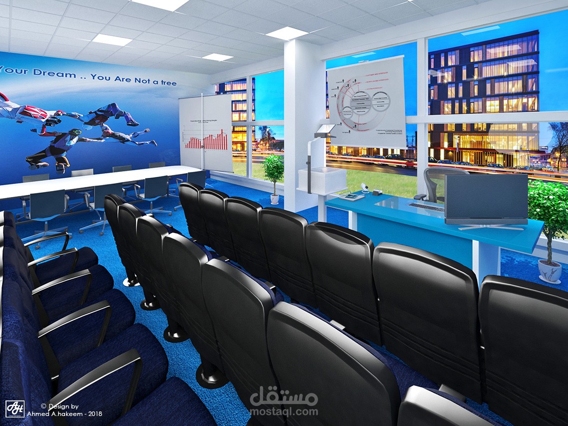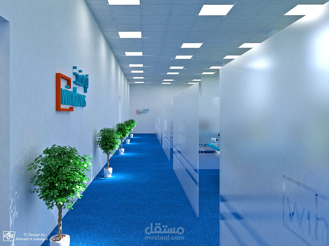 شركة موارد بشرية وتدريب فى المملكة العربية السعودية مقسمة لجزئين جزء للرجال و جزء للنساء بالاضافة لصالة تدريب و تم استخدام مكاتب workstation لسهول العمل كفريق بالاضافة لاستخدام الفواصل الزجاجية المنخفضة للفصل بين المكاتب الادارية فى الجهة الاخرى واستخدام الالوان الازرق و الابيض و الاخضر للحفاظ على الطابع الحديث الملائم لنشاط الشركة .