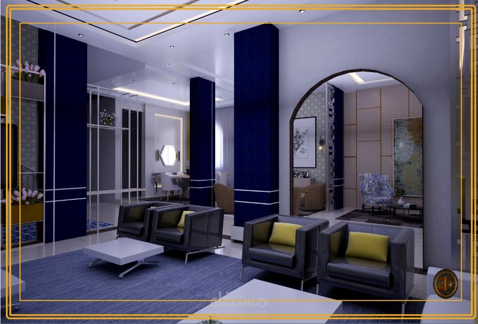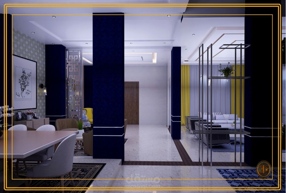 تصميم داخلى لمجلس عائلة مودرن مكون من استقبال وطاولة طعام تلبى احتياجات العائلة