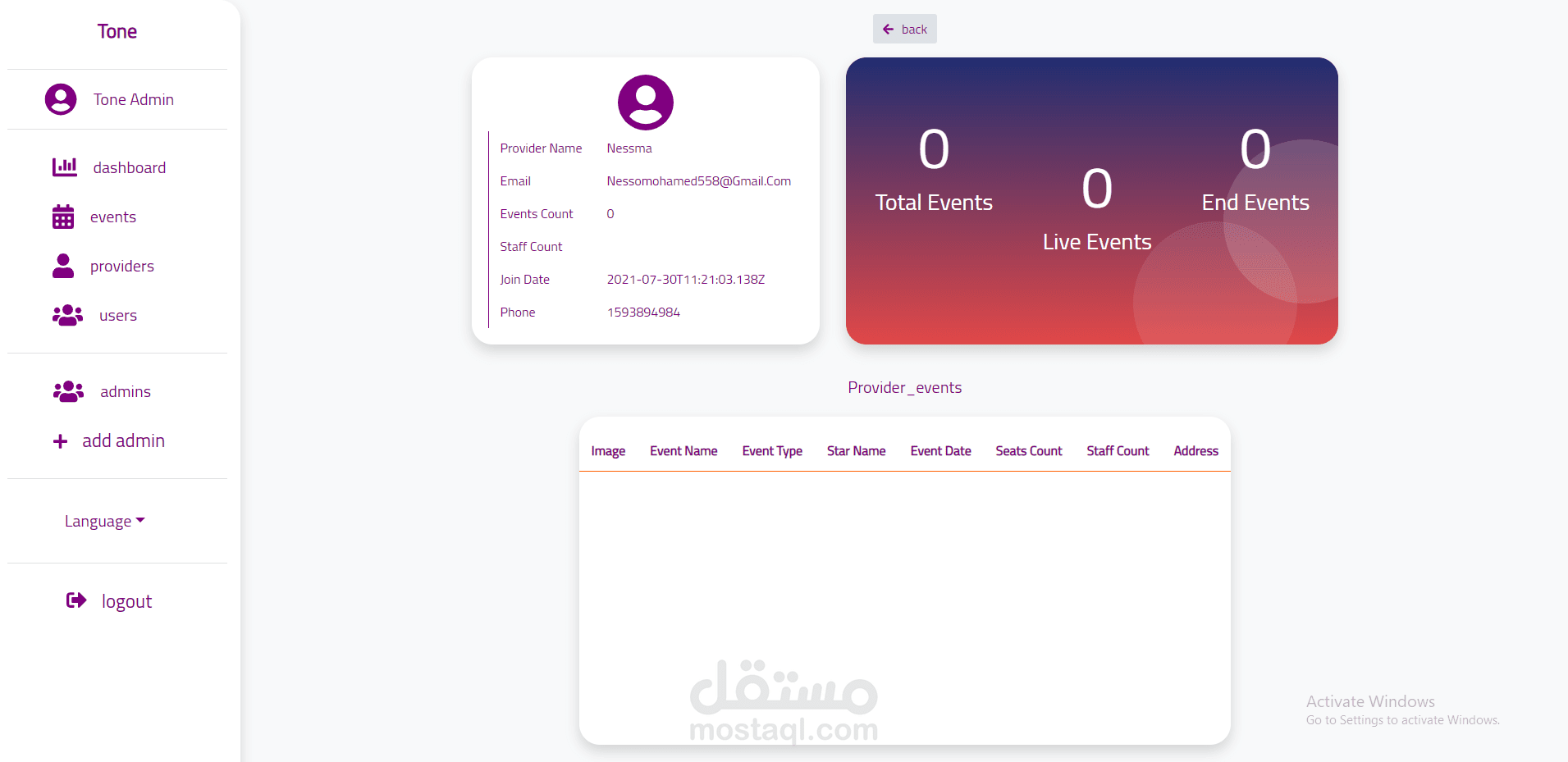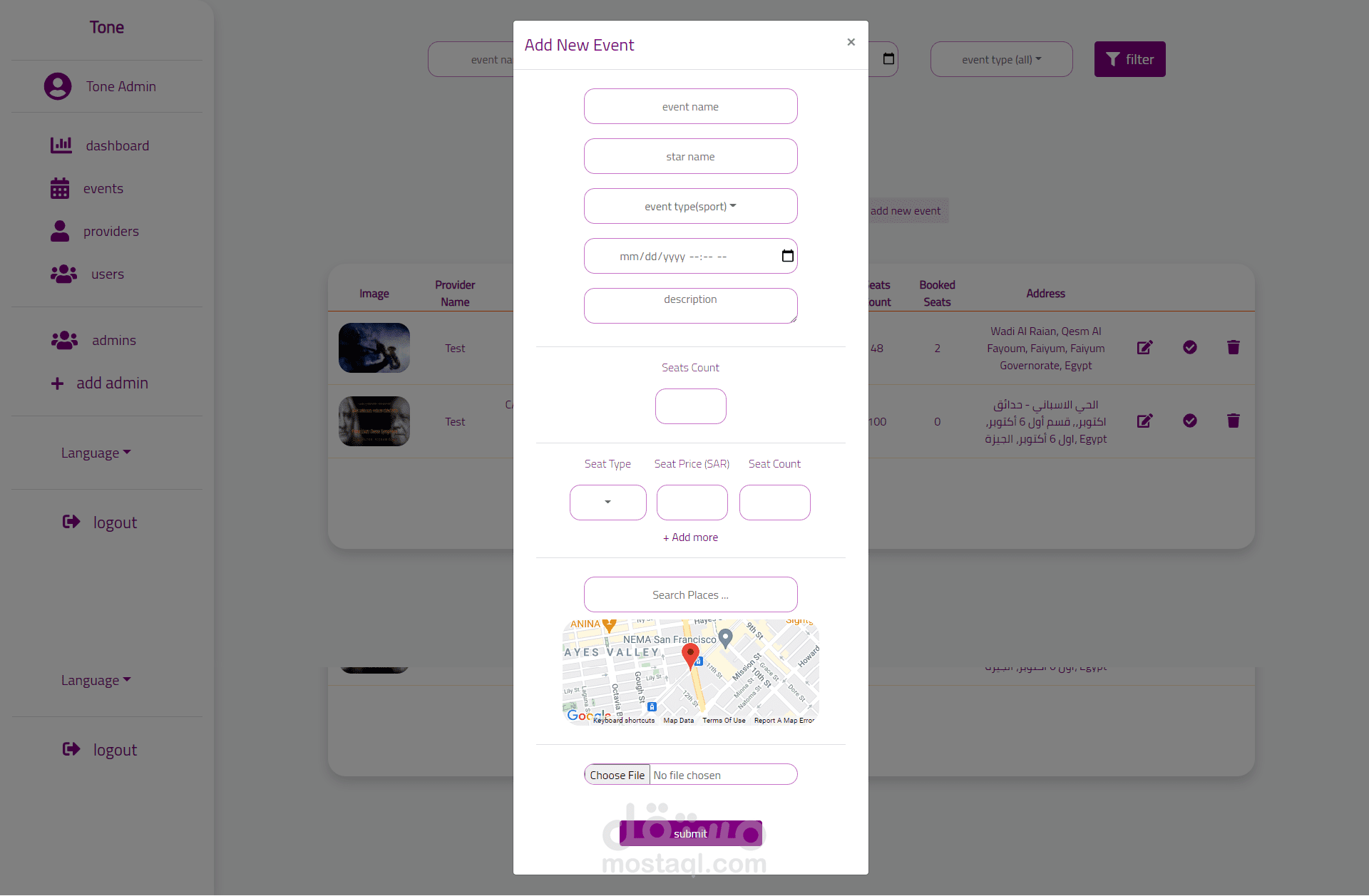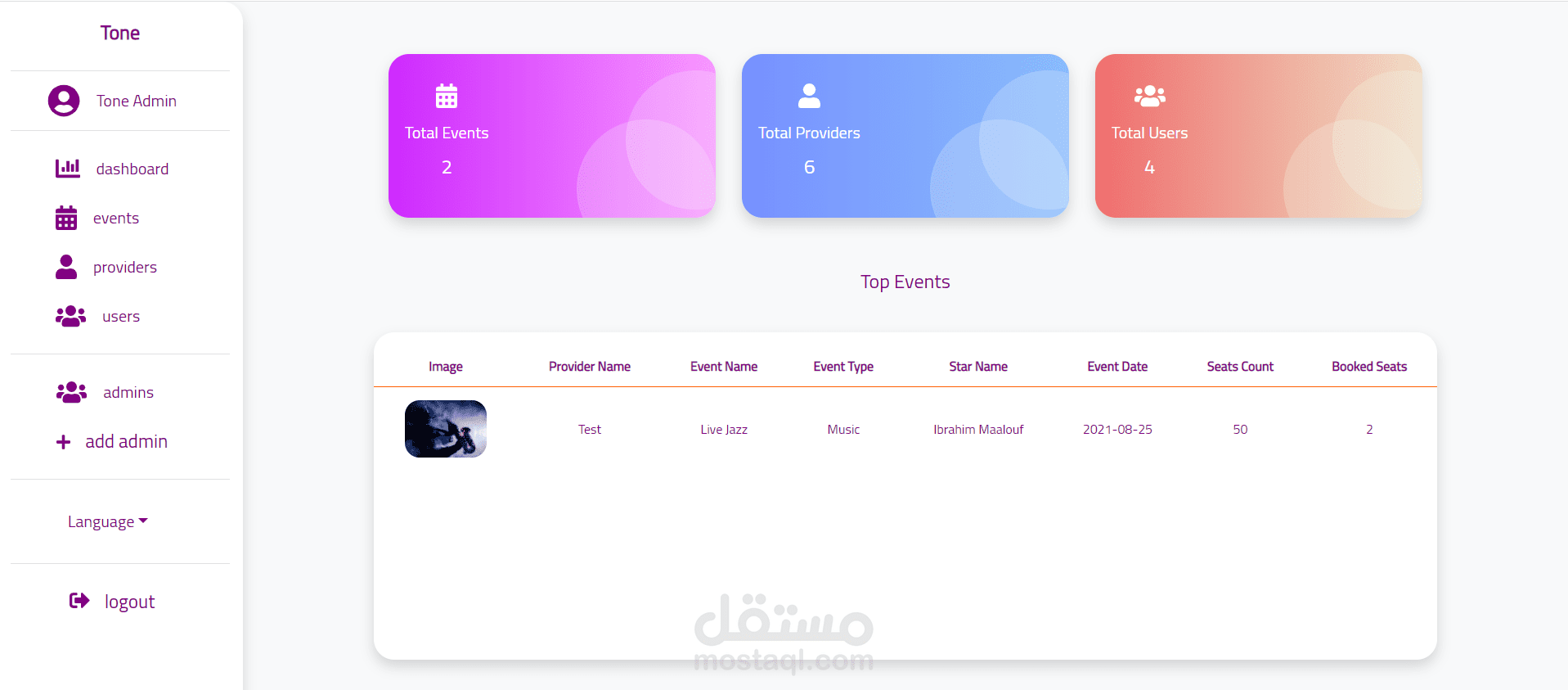 موقع و باك اند لابلكيشن لحجز التذاكر للحفلات مع بوابة دفع الكتروني و موقع للوحة التحكم في البرنامج