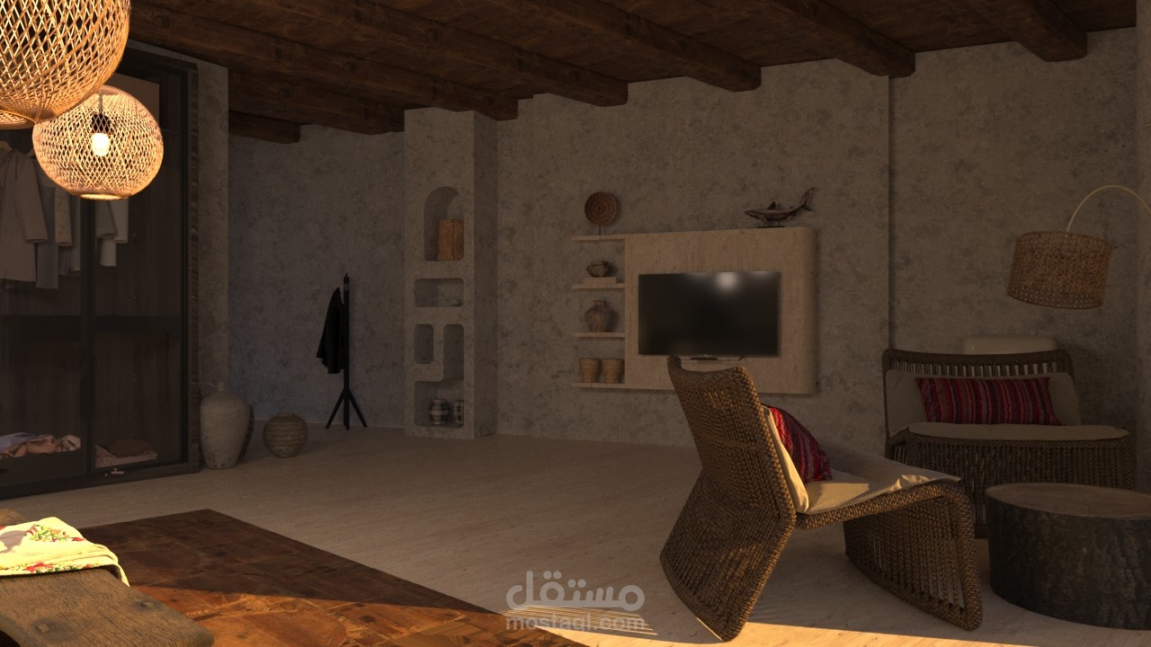 الجدران: تكسو الجدران ألوان هادئة من البيج الفاتح أو الرمادي الدافئ، تخلق شعورًا بالهدوء والاتساع. تُزين الجدران بلوحات فنية مستوحاة من المناظر الطبيعية البحرية أو الحرف اليدوية المحلية، تعكس روح المنطقة وتضفي لمسة فنية مميزة.