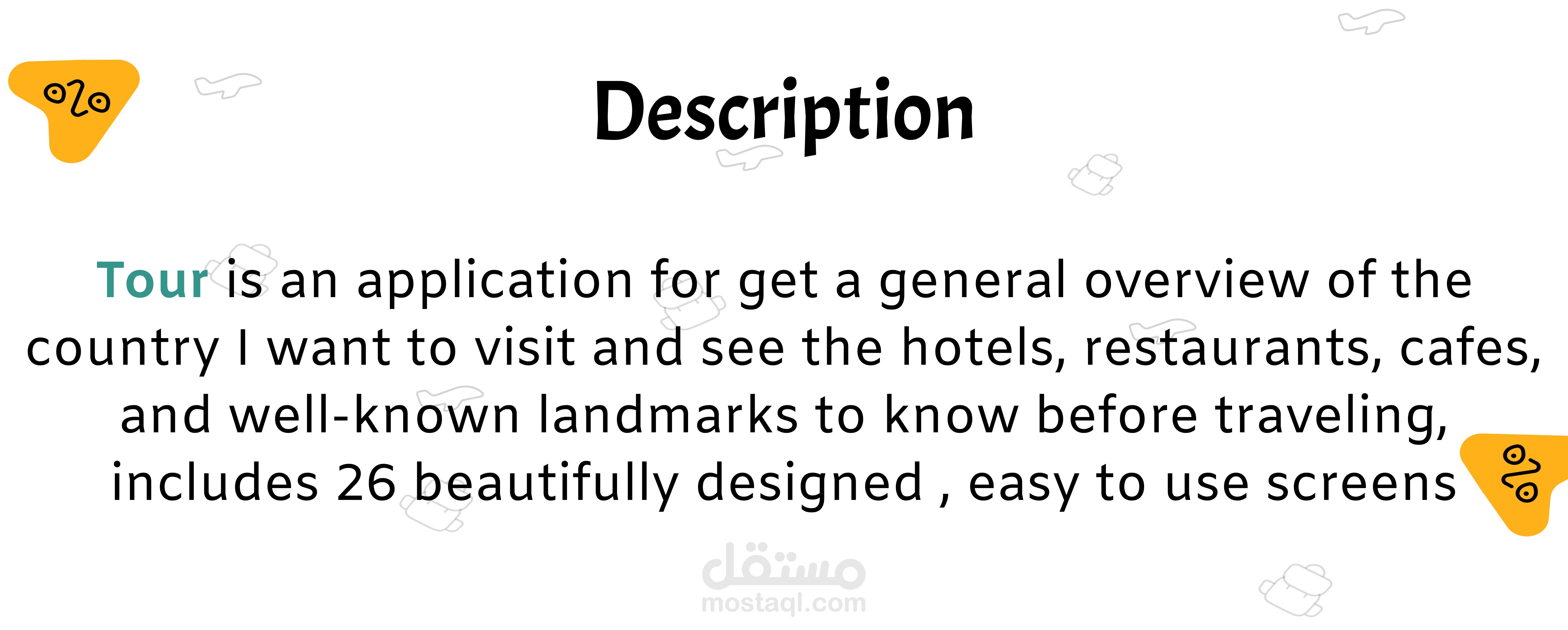 Tour is an application for get a general overview of the country I want to visit and see the hotels, restaurants, cafes, and well-known landmarks to know before traveling, includes 26 beautifully designed , easy to use screens