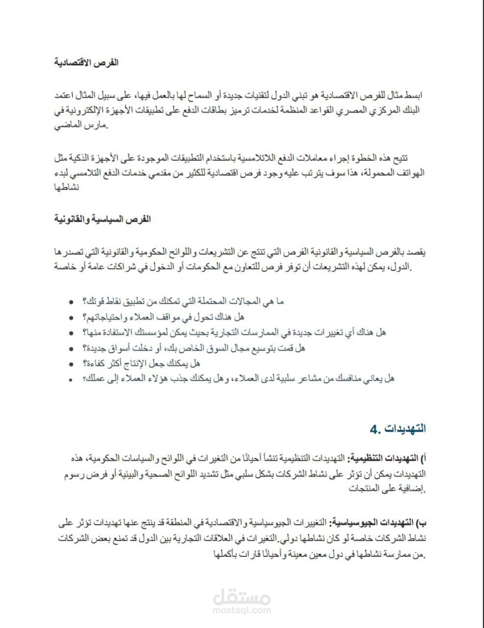 - قمت بتصميم قالب مخصص لتحليل SWOT يتضمن أقساماً واضحة ومحددة لكل عنصر (نقاط القوة، نقاط الضعف، الفرص، والتهديدات).