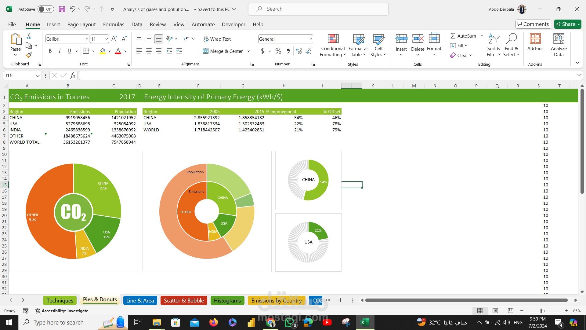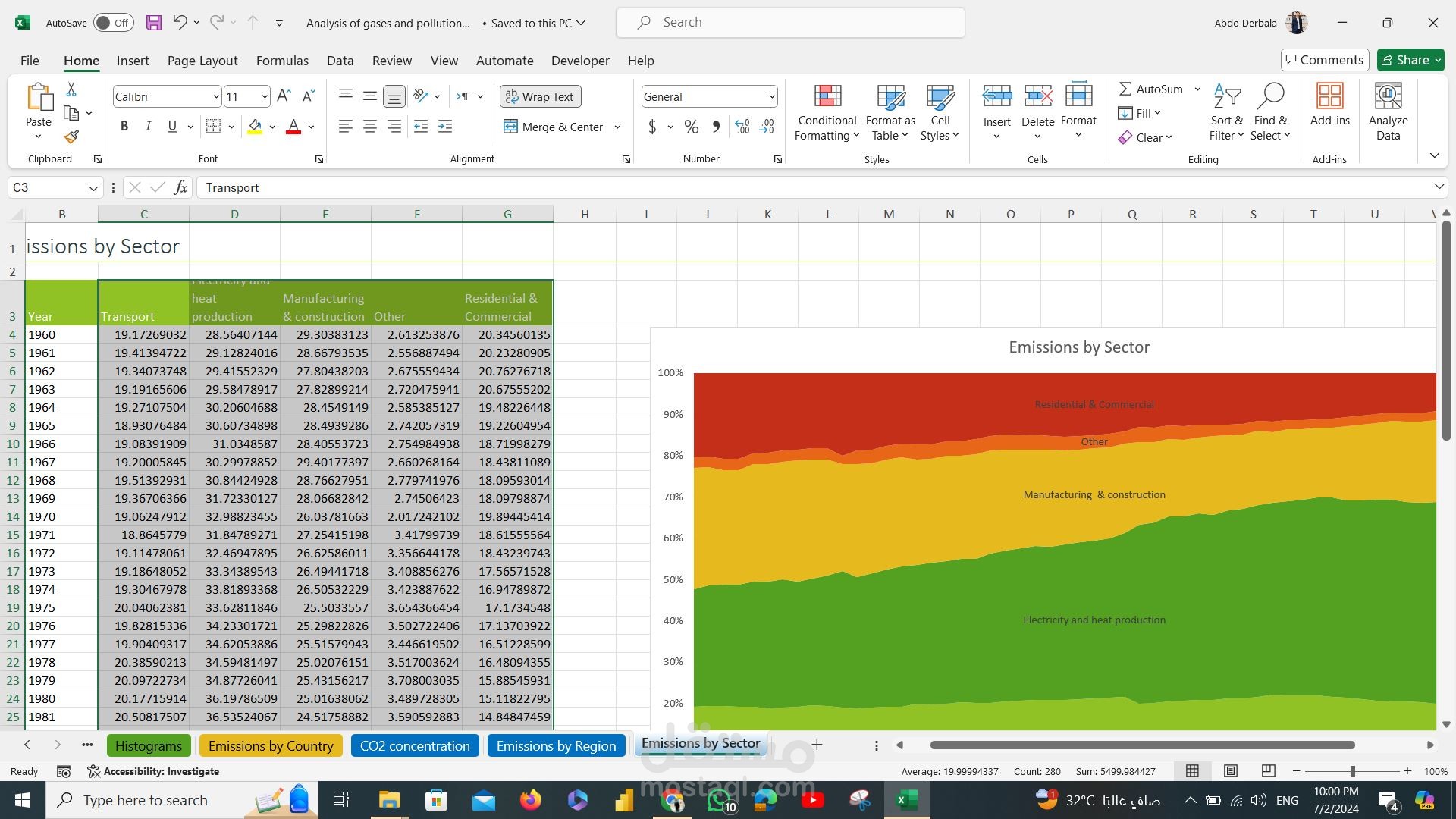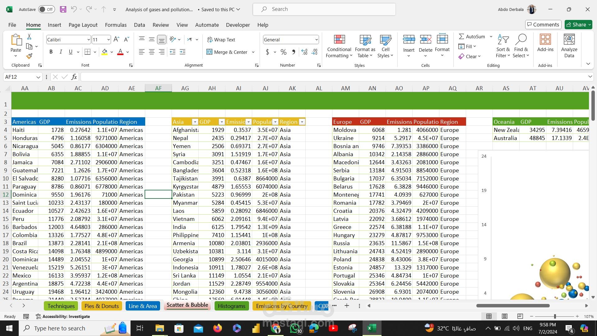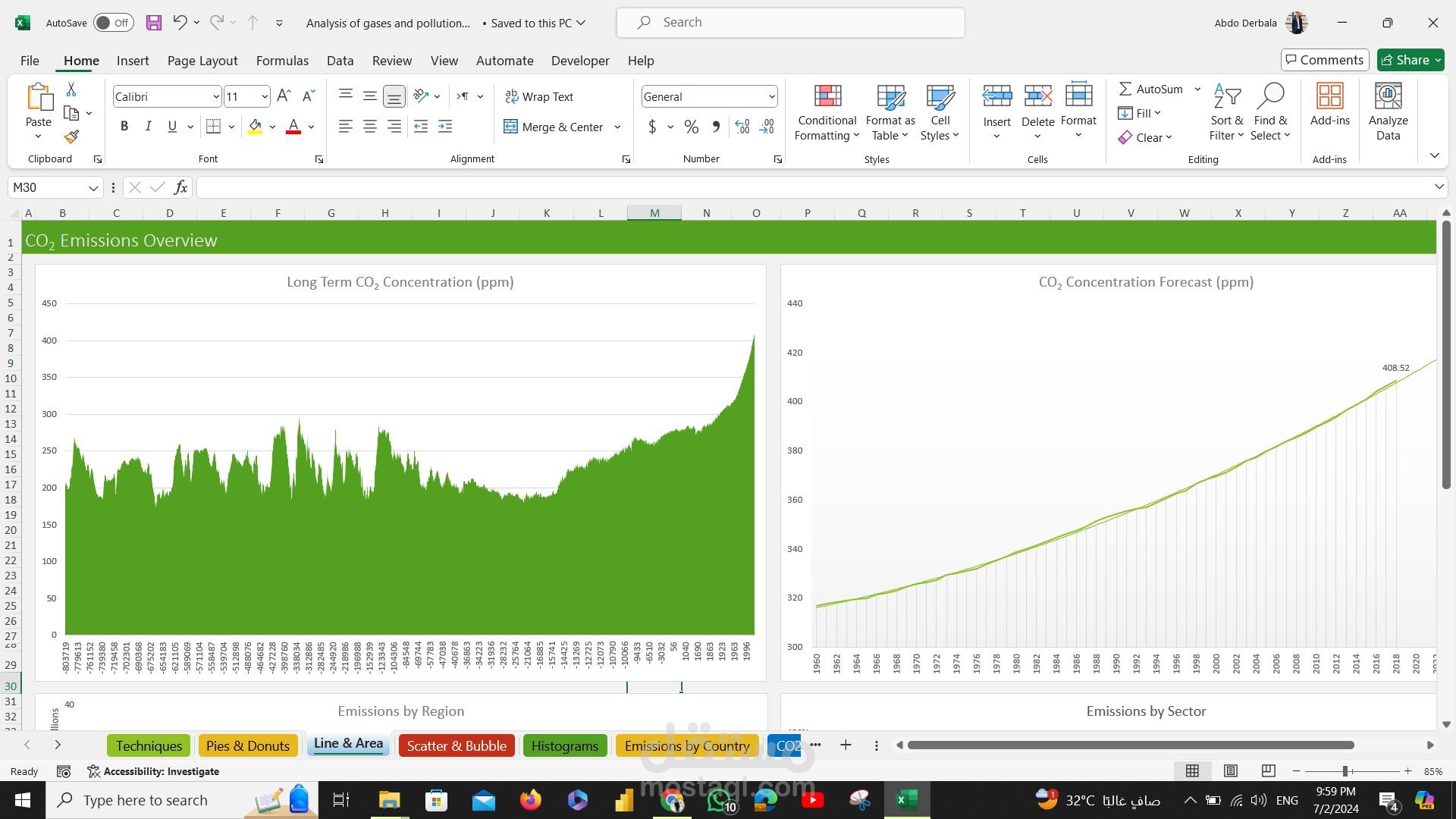 Analysis of gases and pollution data using excel