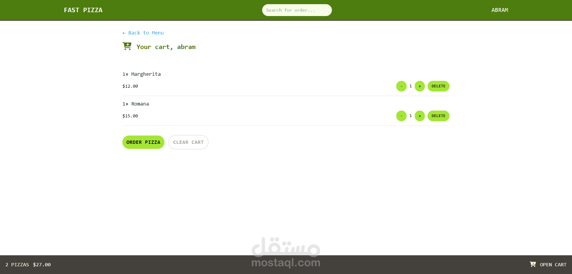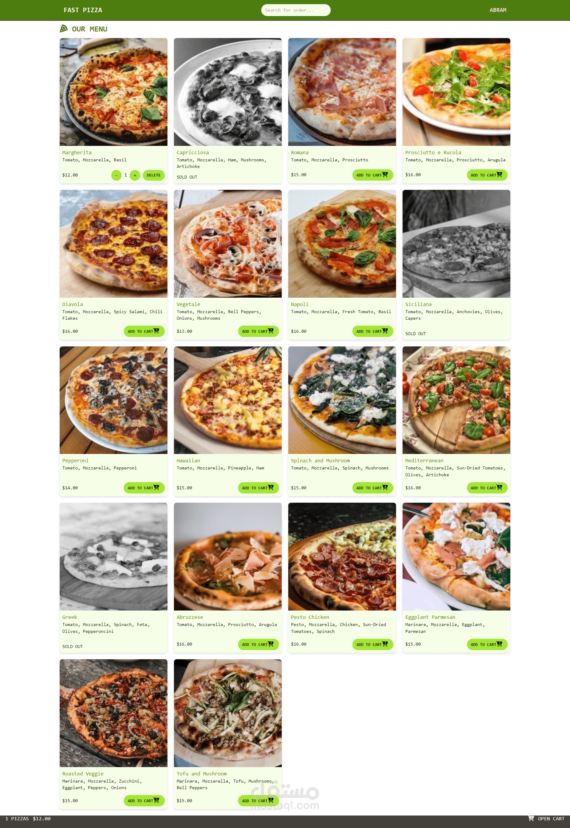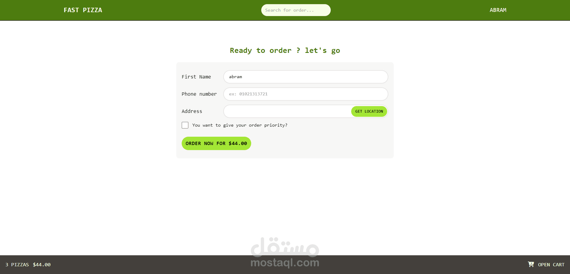Fast-Pizza app is pizza online ordering system using React.js, React-router-dom, Redux-toolkit, tailwind css, real api and axios.
